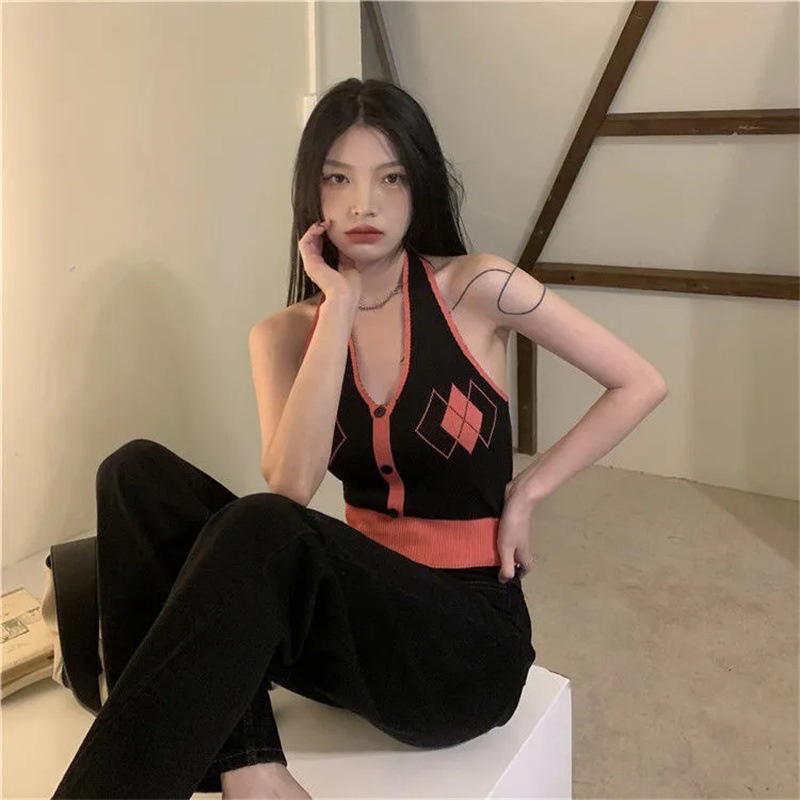 2022夏季新款复古性感菱形格子三粒扣美背挂脖式短款小吊带背心女