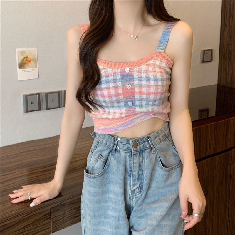 韩版网红辣妹穿搭上衣马甲纯欲气质小个子拼接棋盘针织背心上衣女
