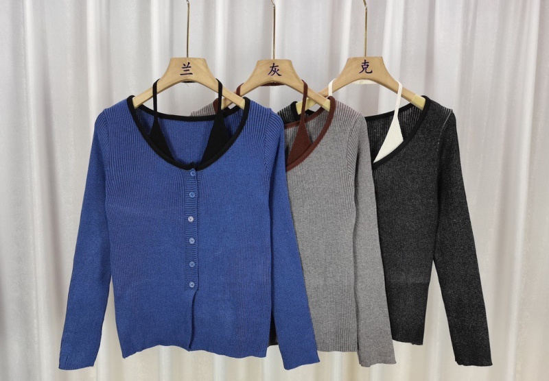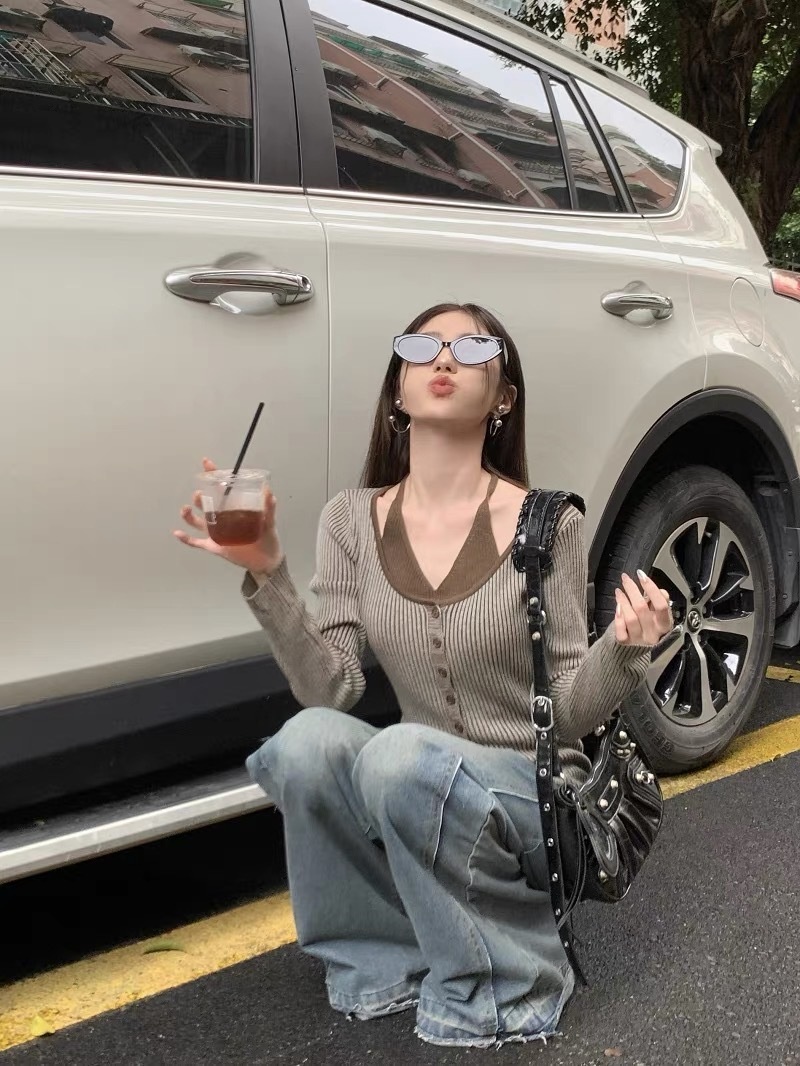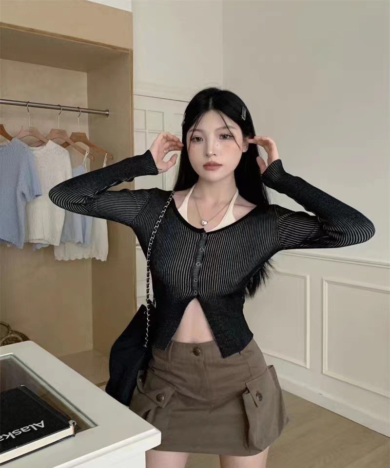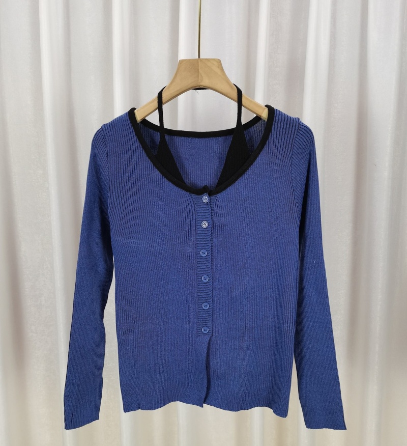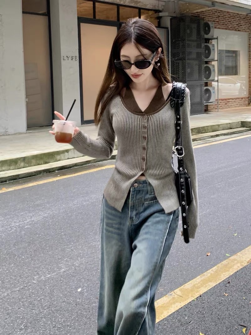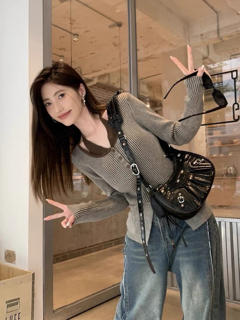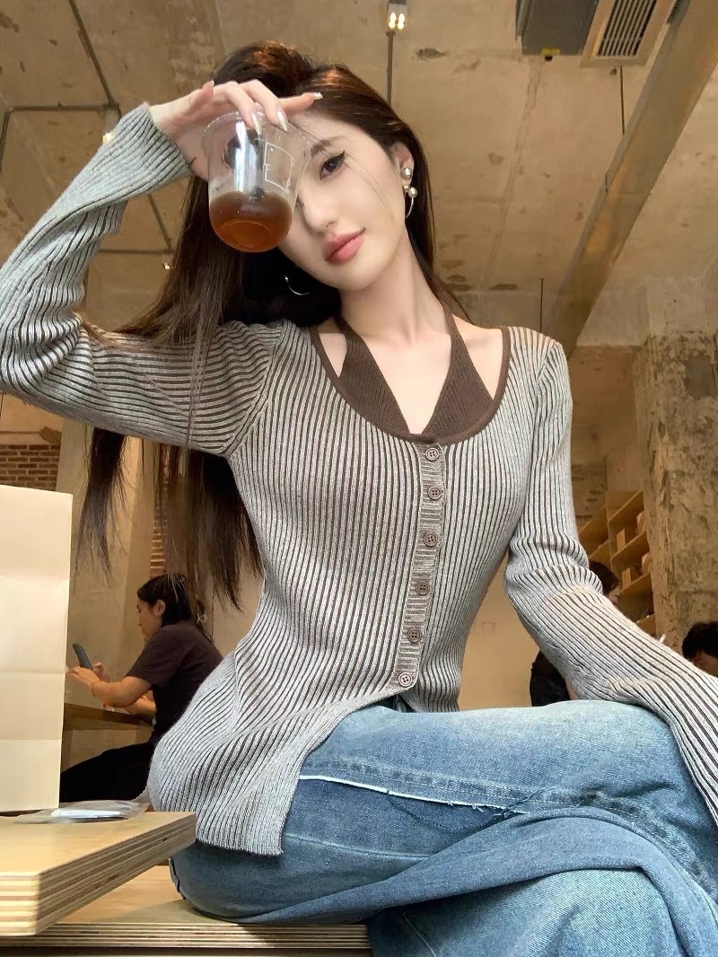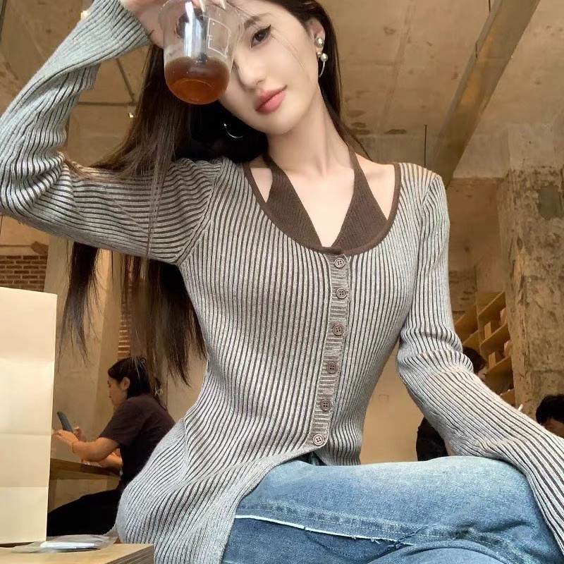 2023秋冬设计感开叉修身显瘦上衣法式假两件条纹挂脖长袖针织衫女