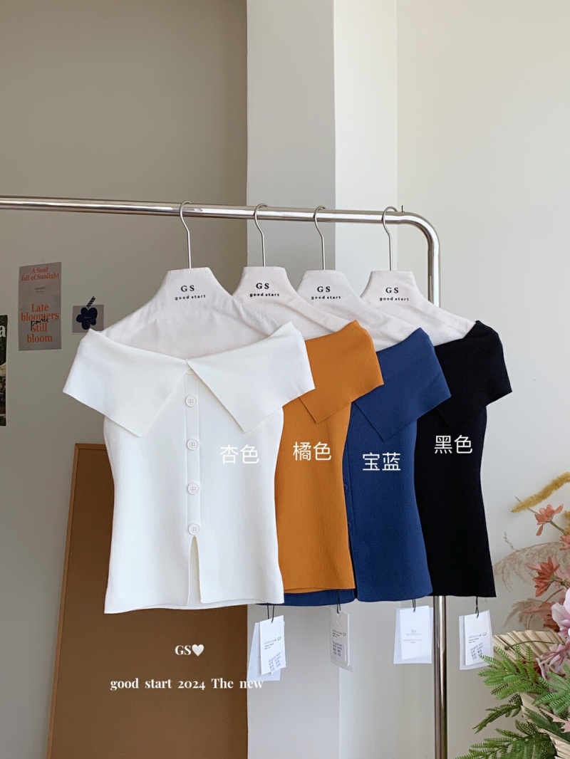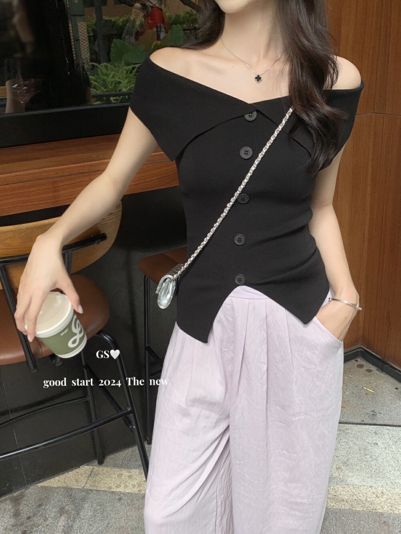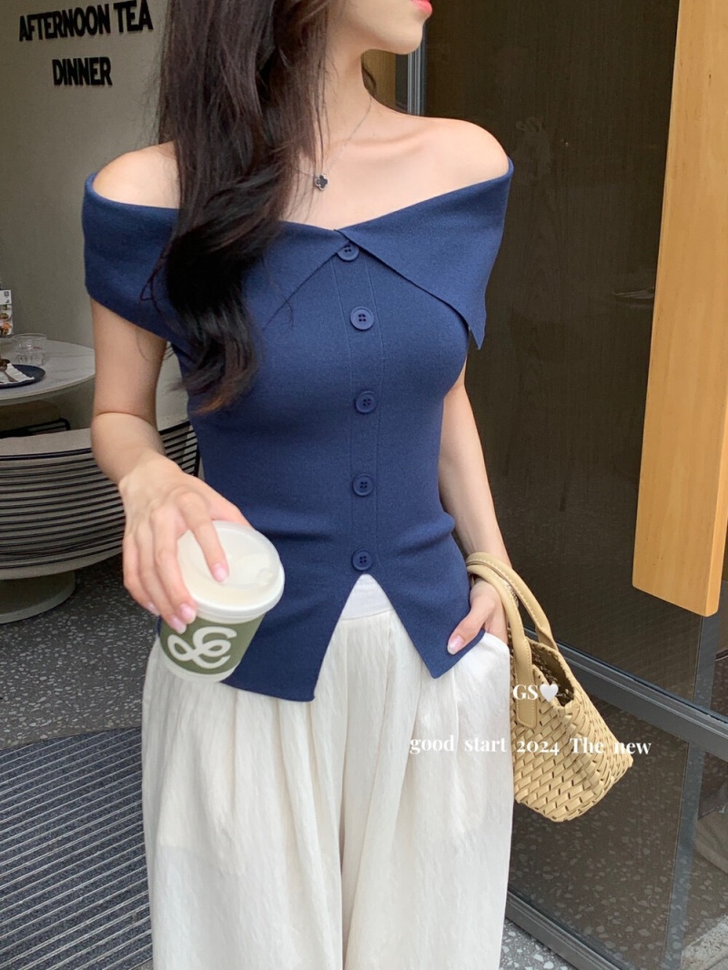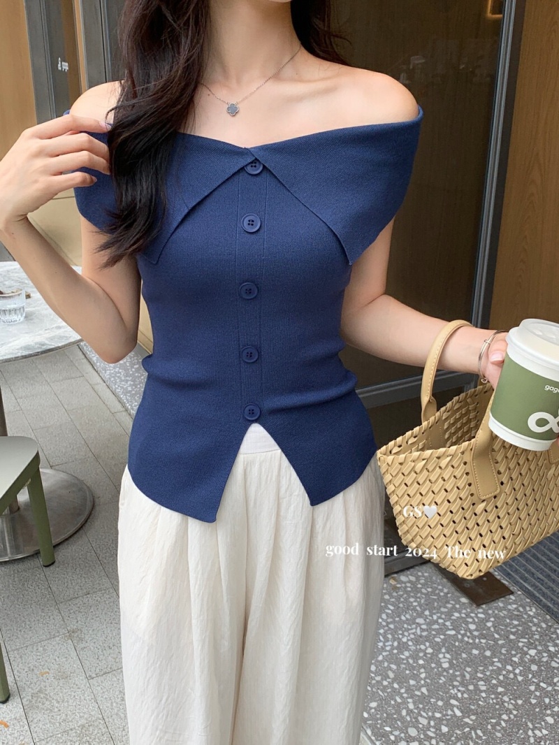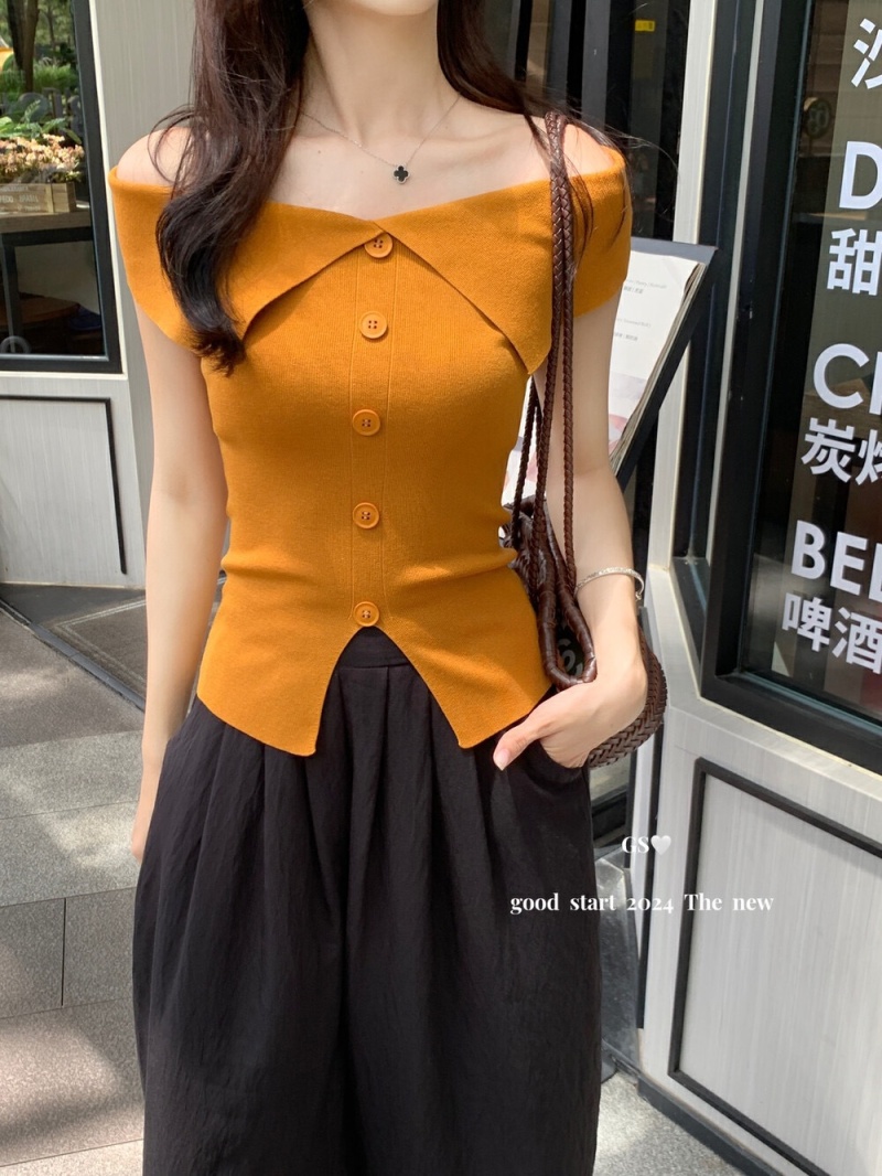 2024法式气质翻领一字领针织衫夏季新款设计感单开叉排扣修身上衣