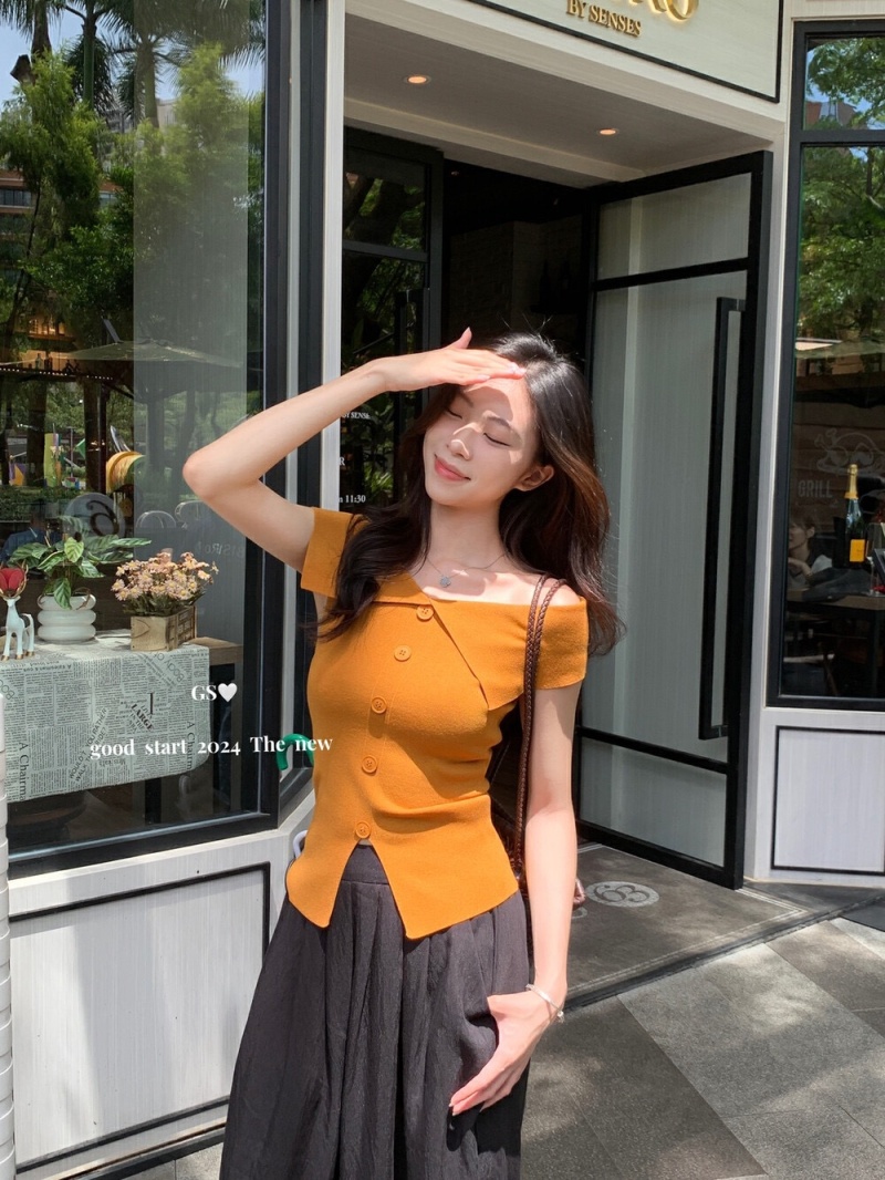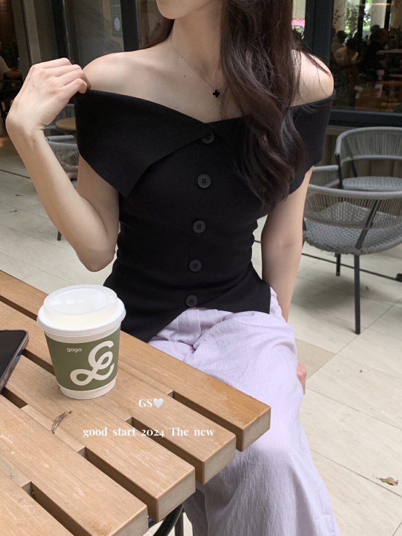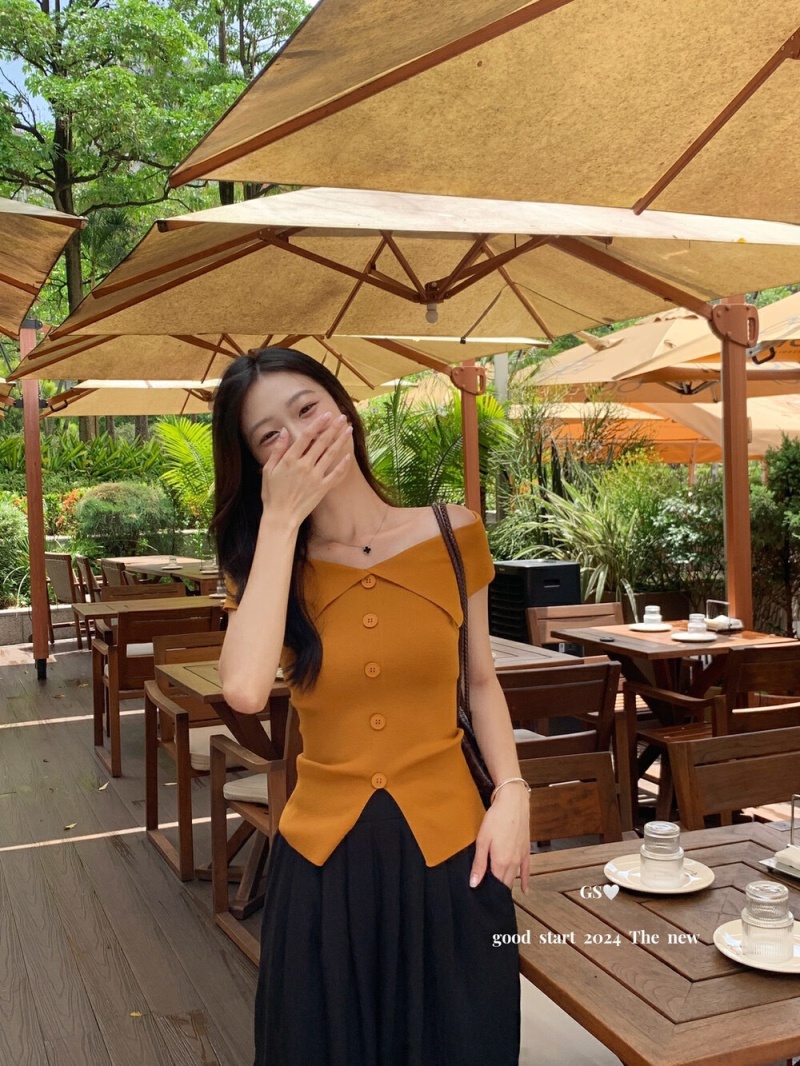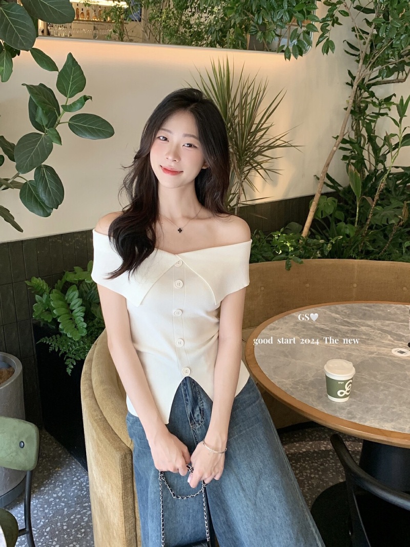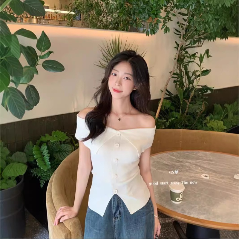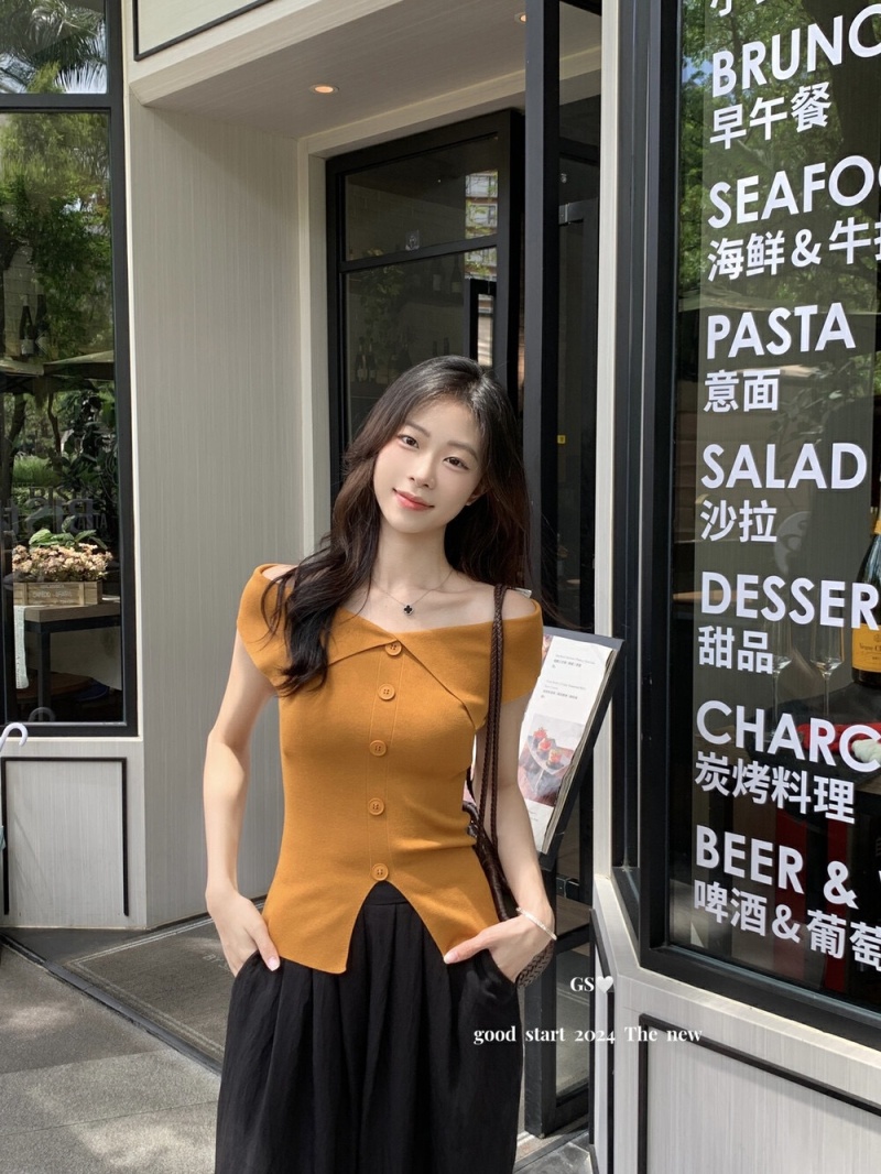 2024法式气质翻领一字领针织衫夏季新款设计感单开叉排扣修身上衣
