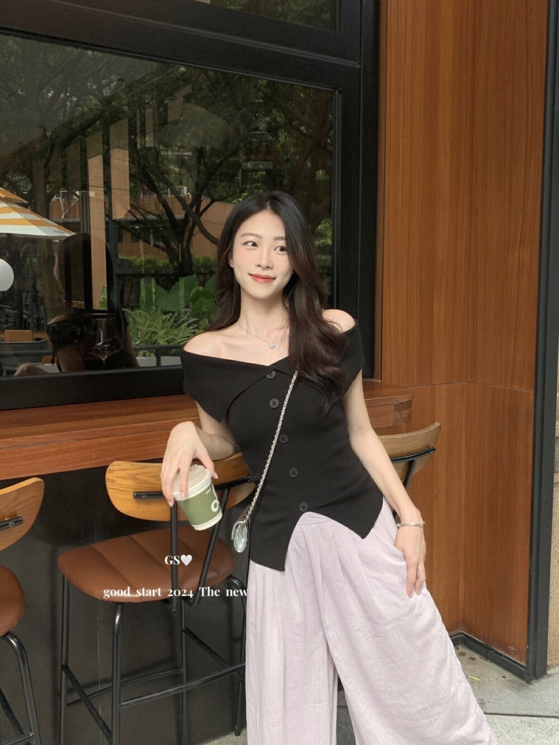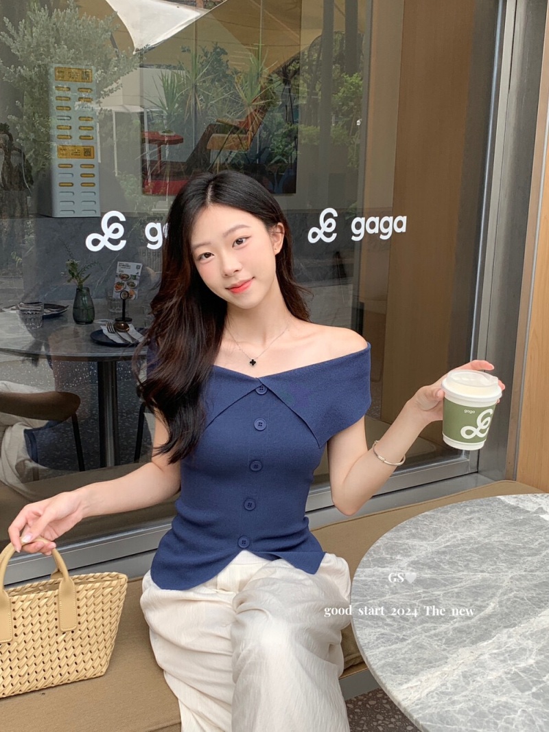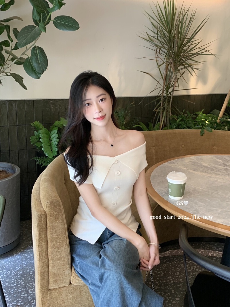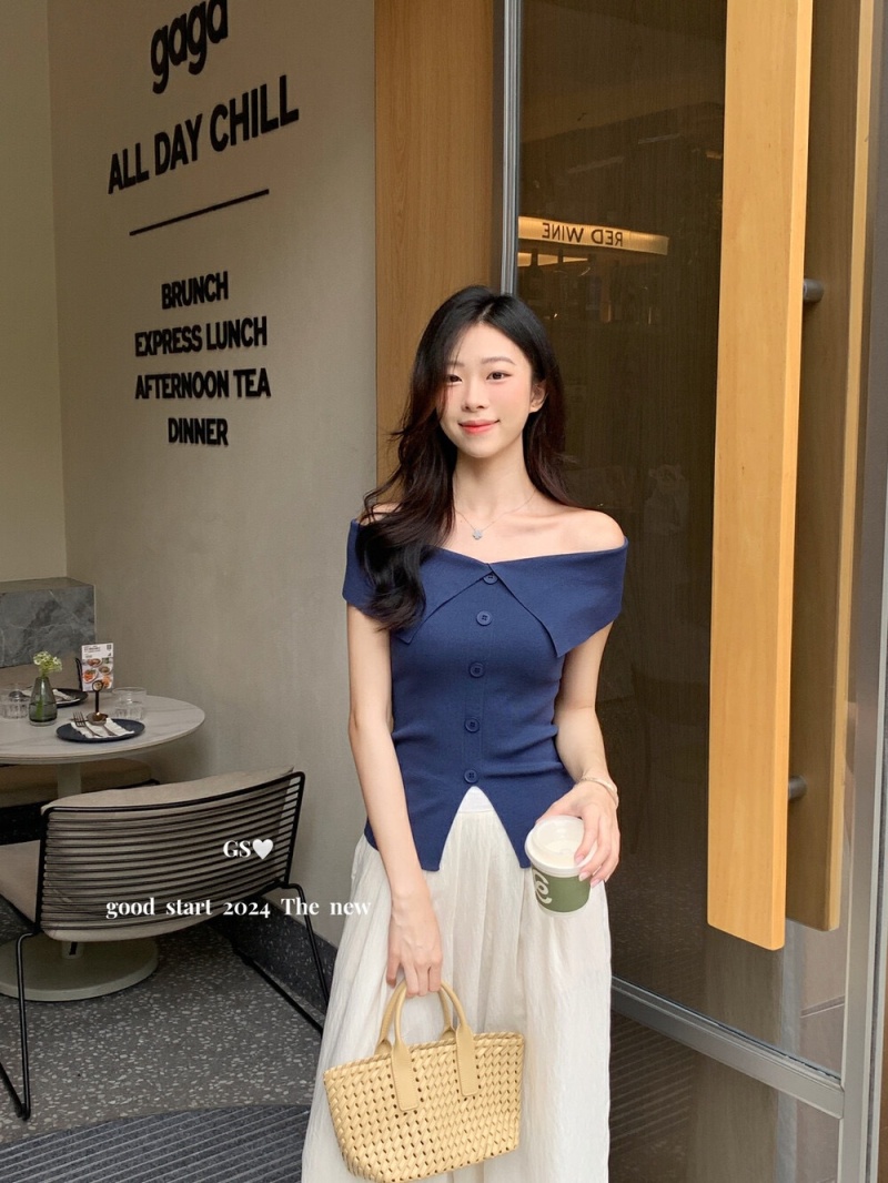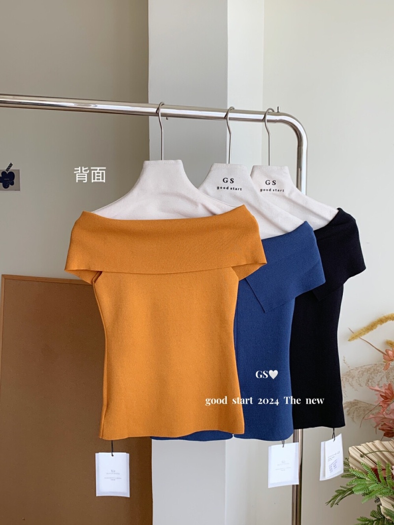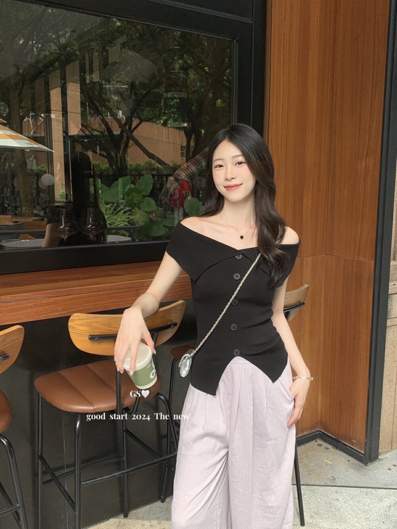 2024法式气质翻领一字领针织衫夏季新款设计感单开叉排扣修身上衣