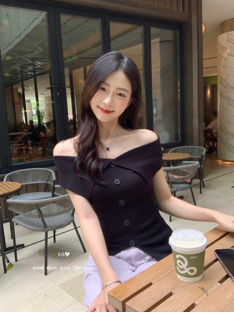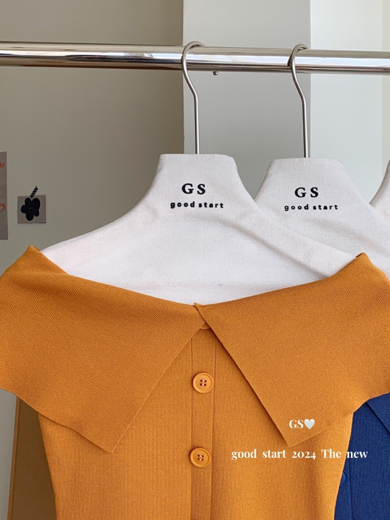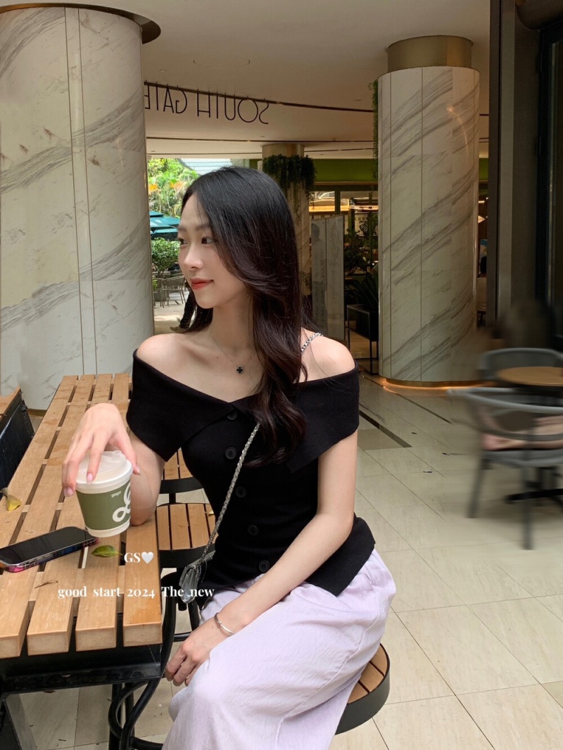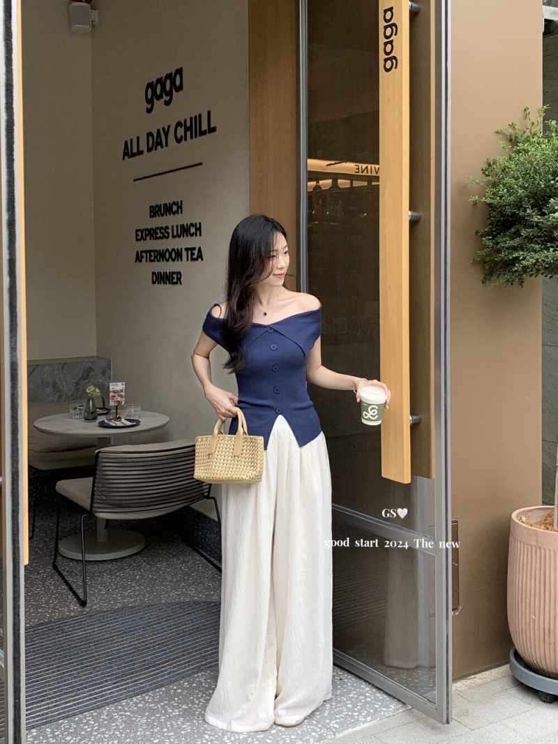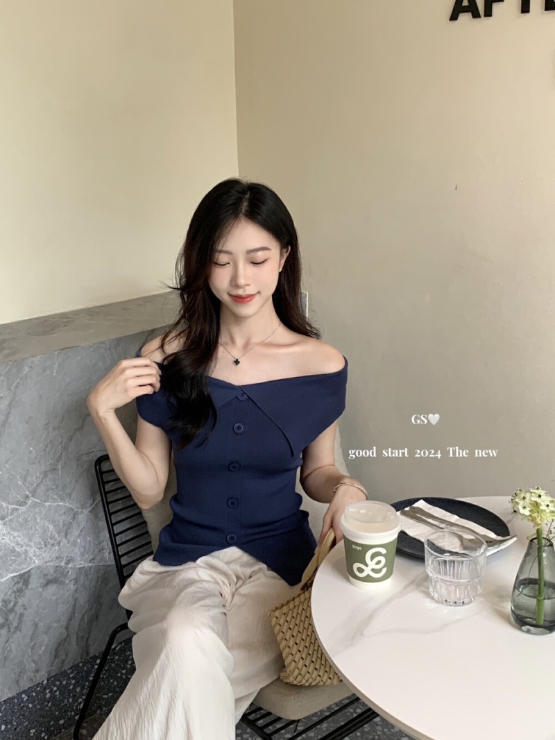 2024法式气质翻领一字领针织衫夏季新款设计感单开叉排扣修身上衣