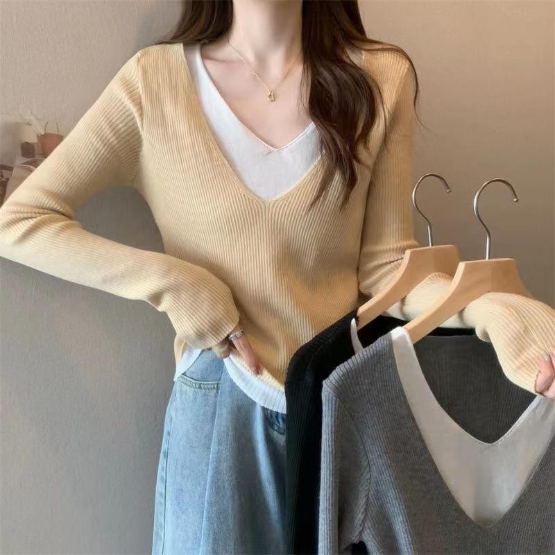 V领假二件针织衫秋冬季新款女装撞色修身打底衫内搭上衣外穿小衫