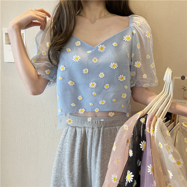 小雏菊泡泡袖T恤夏季新款ins短款显瘦洋气百搭网纱短袖针织上衣女