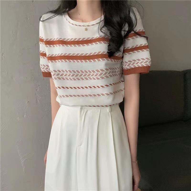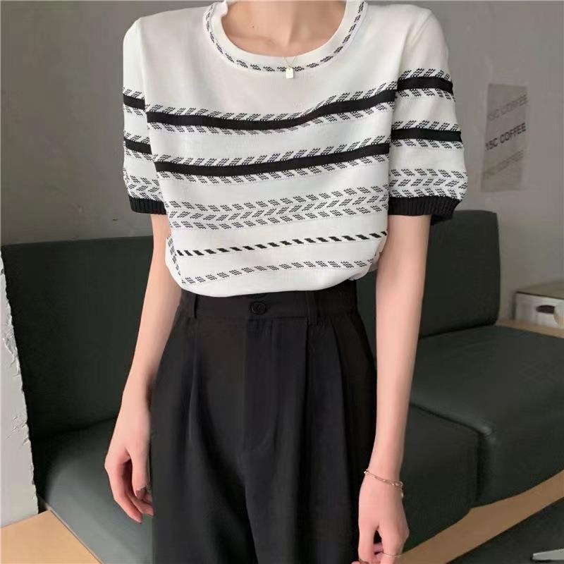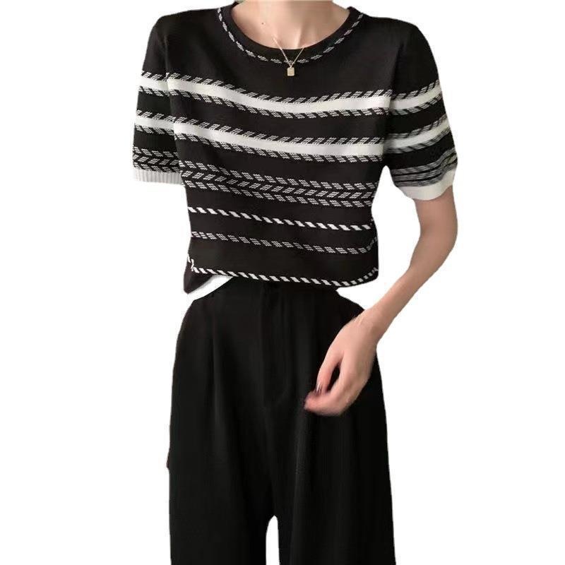 条纹针织衫女2024夏季设计感圆领短袖撞色小个子修身显瘦短款乙鸟