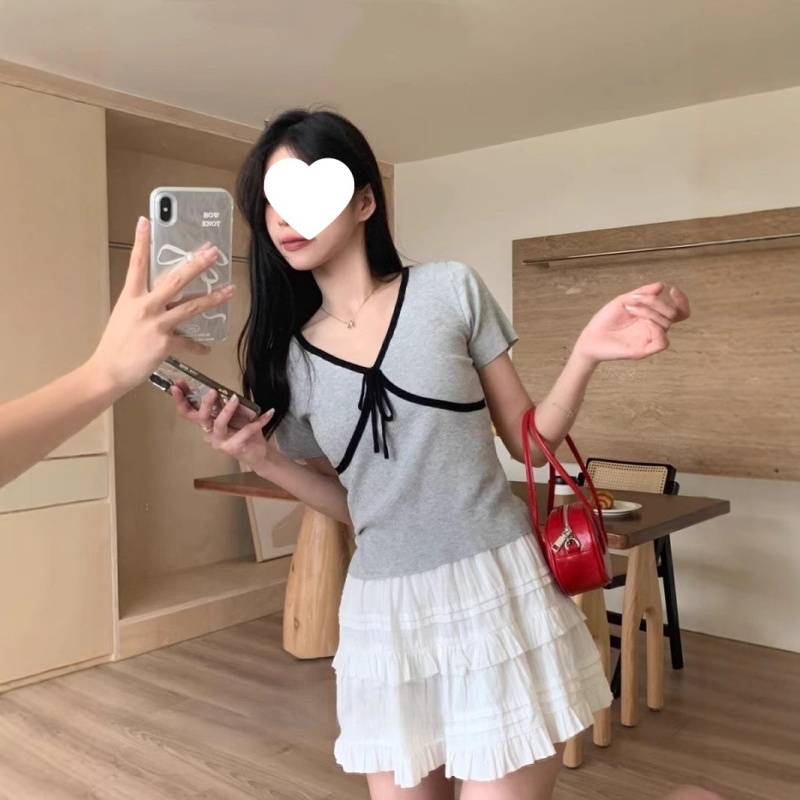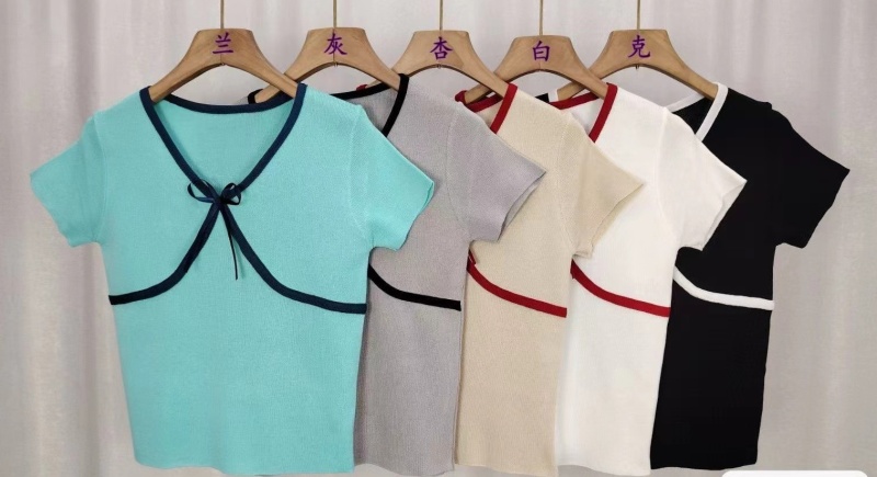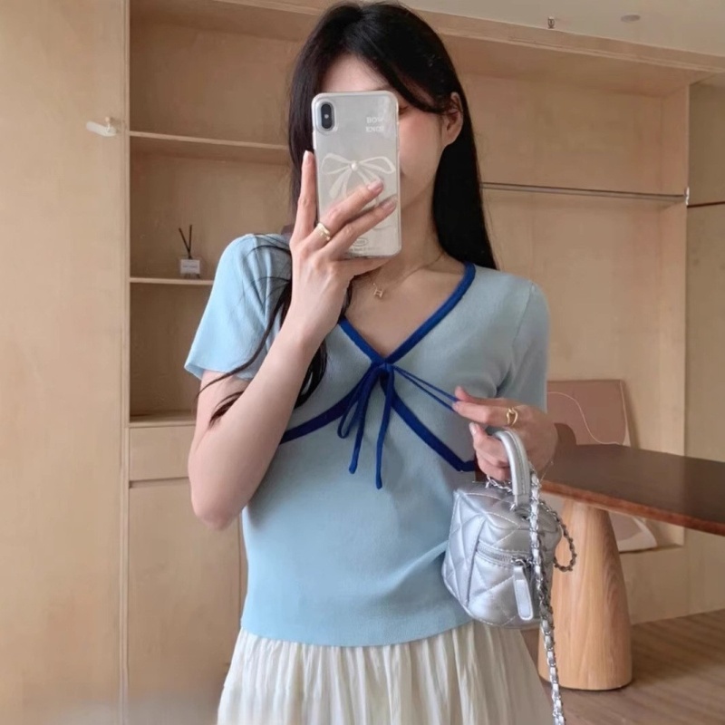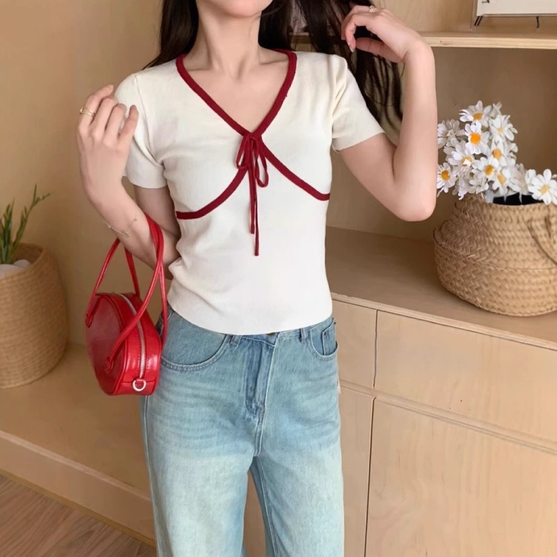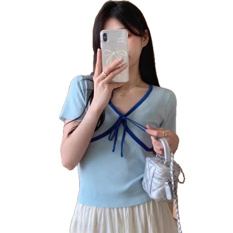 韩版设计感v领气质交叉撞色系带针织衫夏季新款修身显瘦短袖上衣