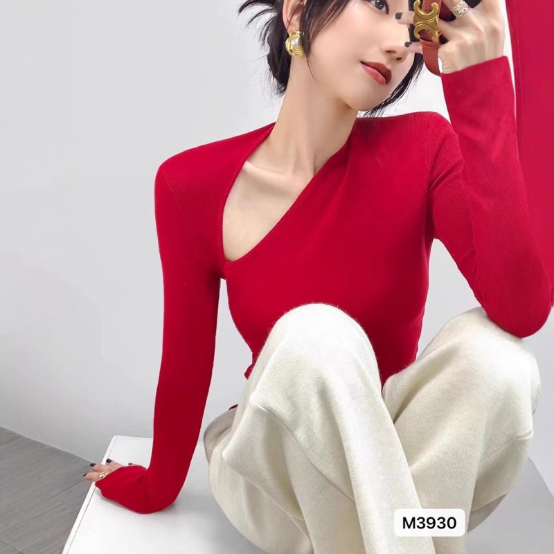 高级感时尚不规则斜肩v领针织衫女小心机露锁骨长袖修身打底上衣