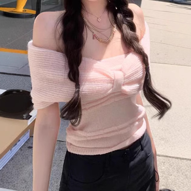 2025夏季新款甜美清新设计感软糯两色蝴蝶结一字肩抹胸短款上衣女
