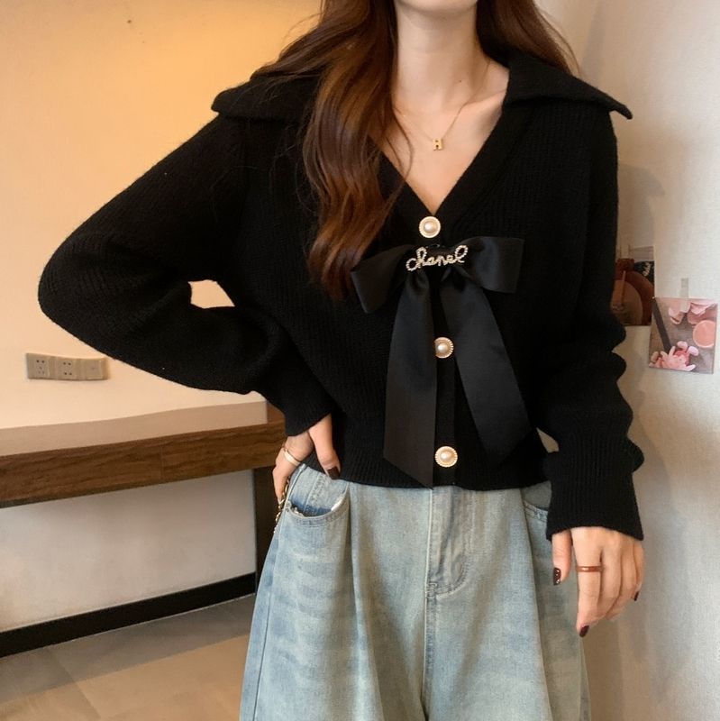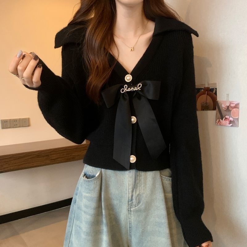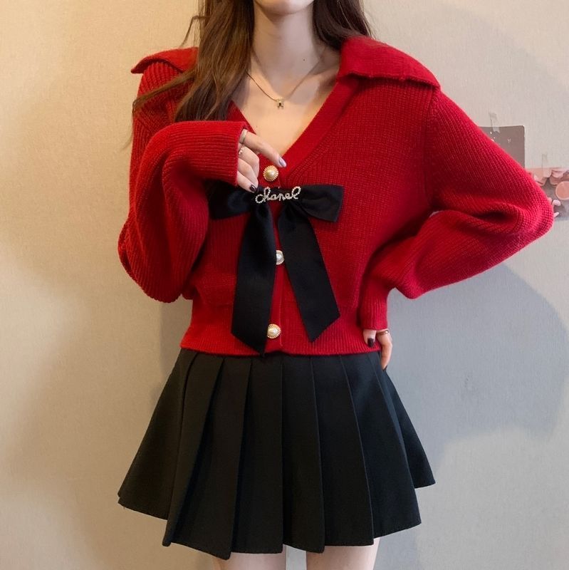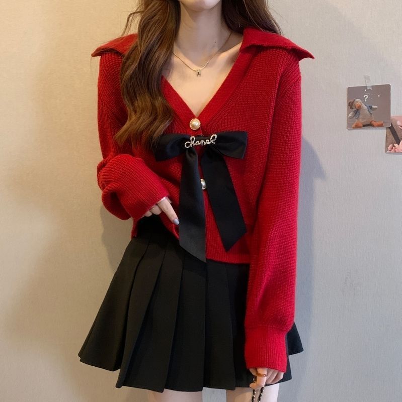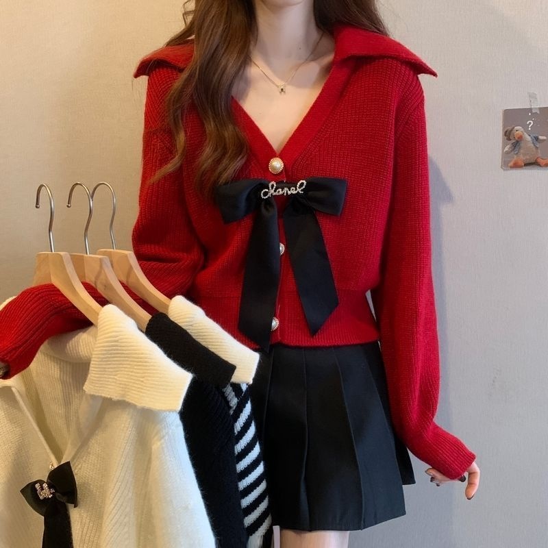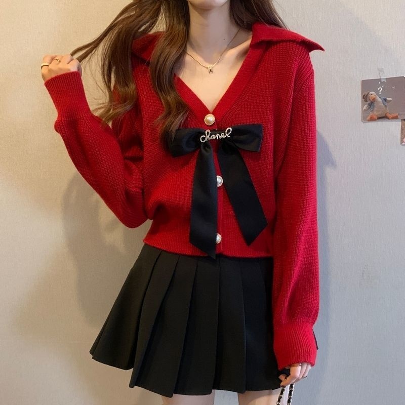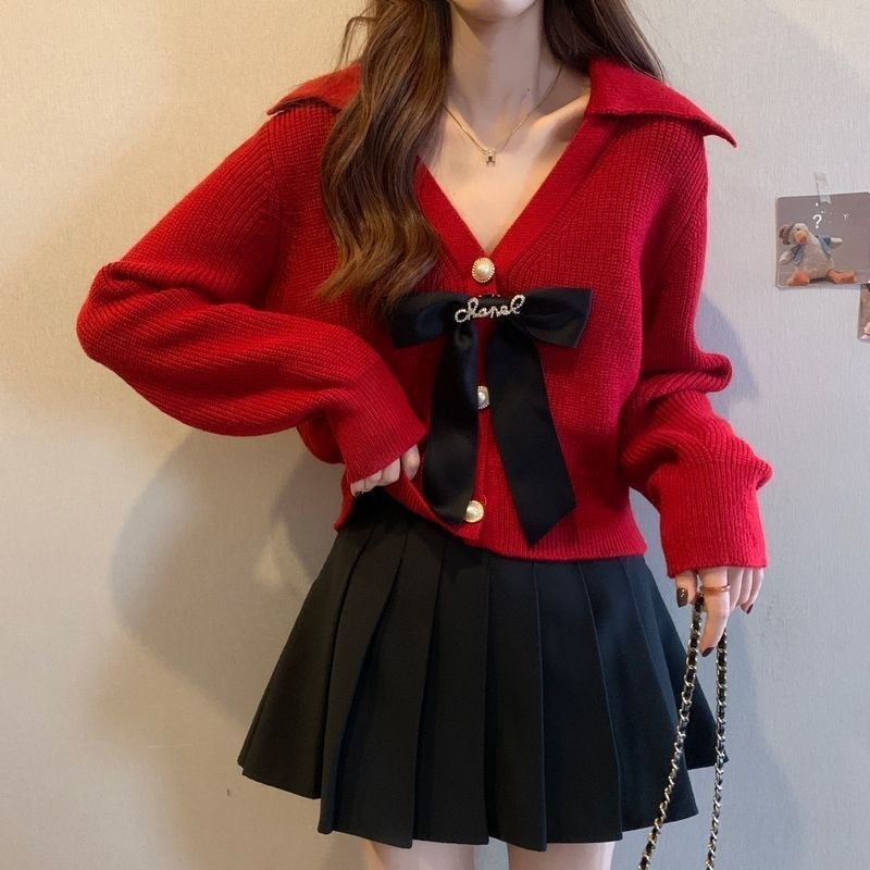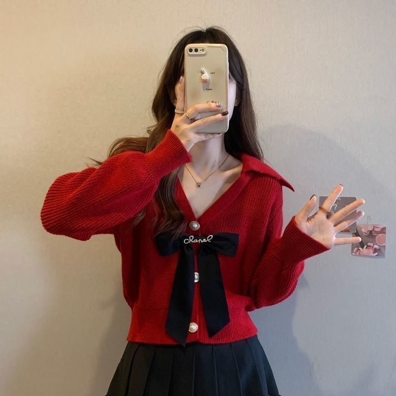 法式红色针织设计翻领开衫毛衣秋冬感小众蝴蝶结秋季短款显瘦上衣