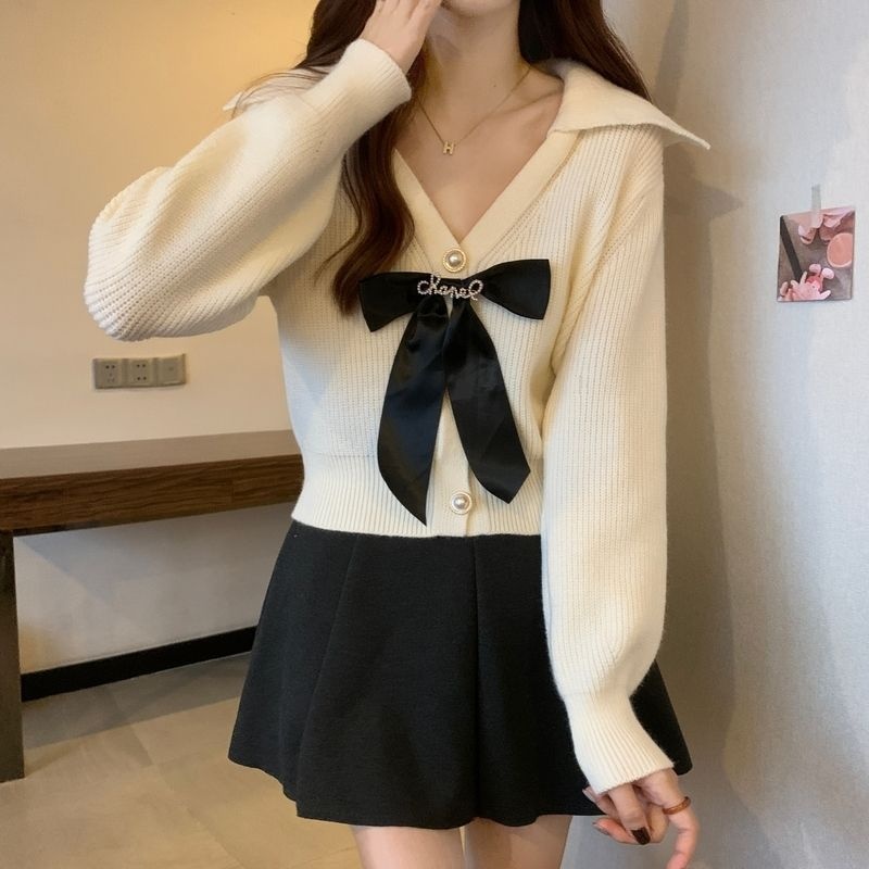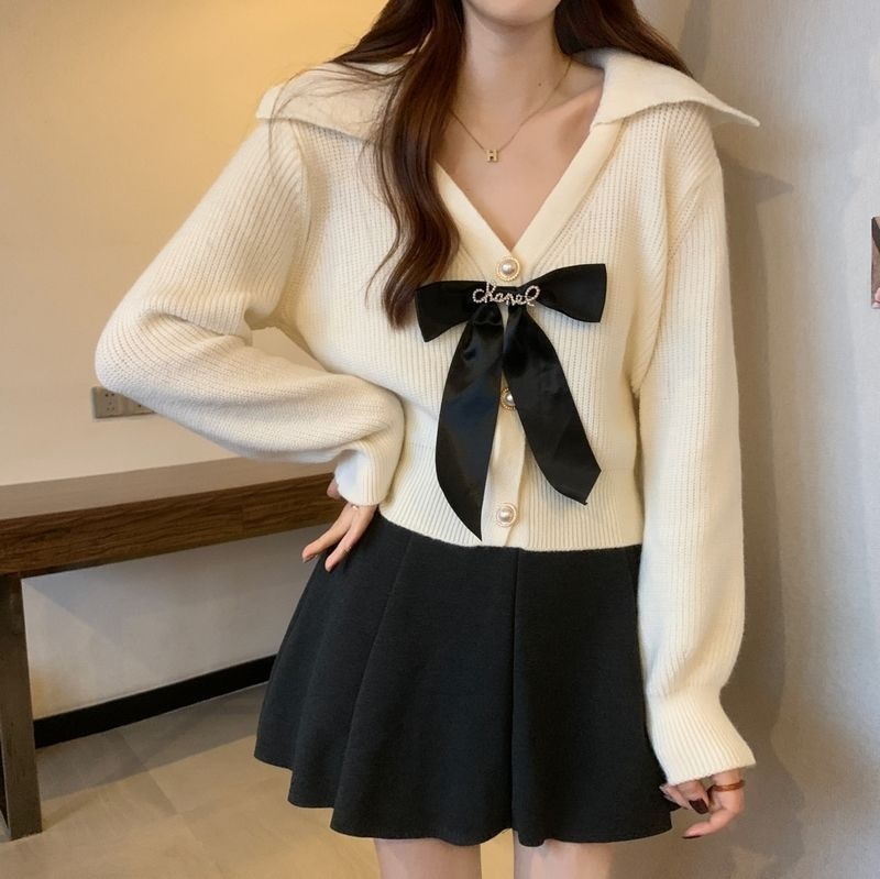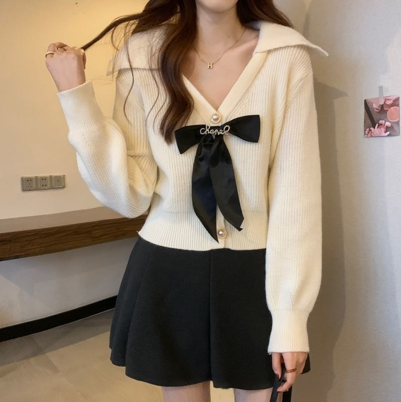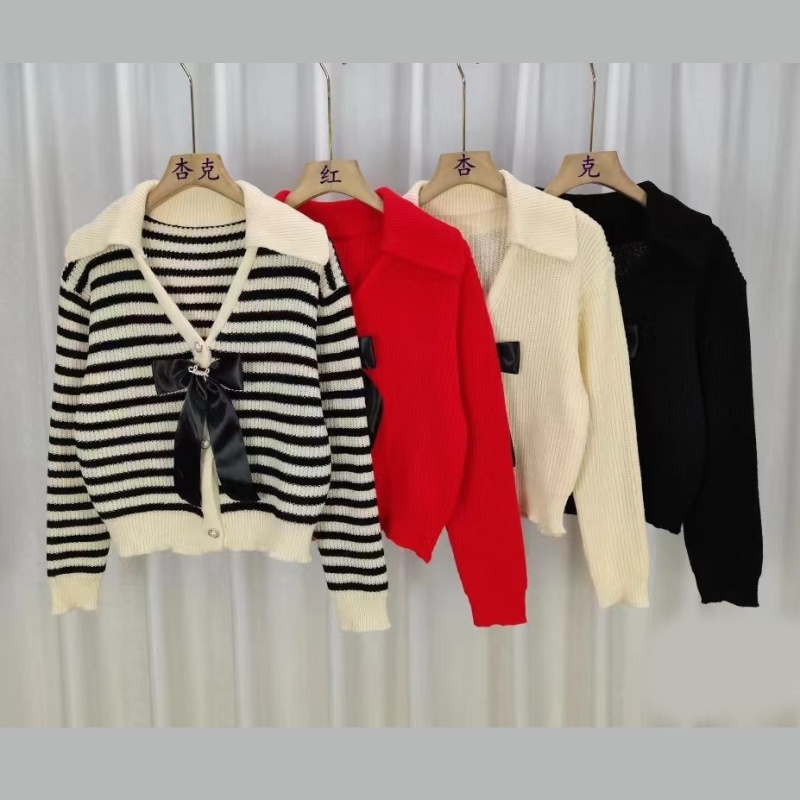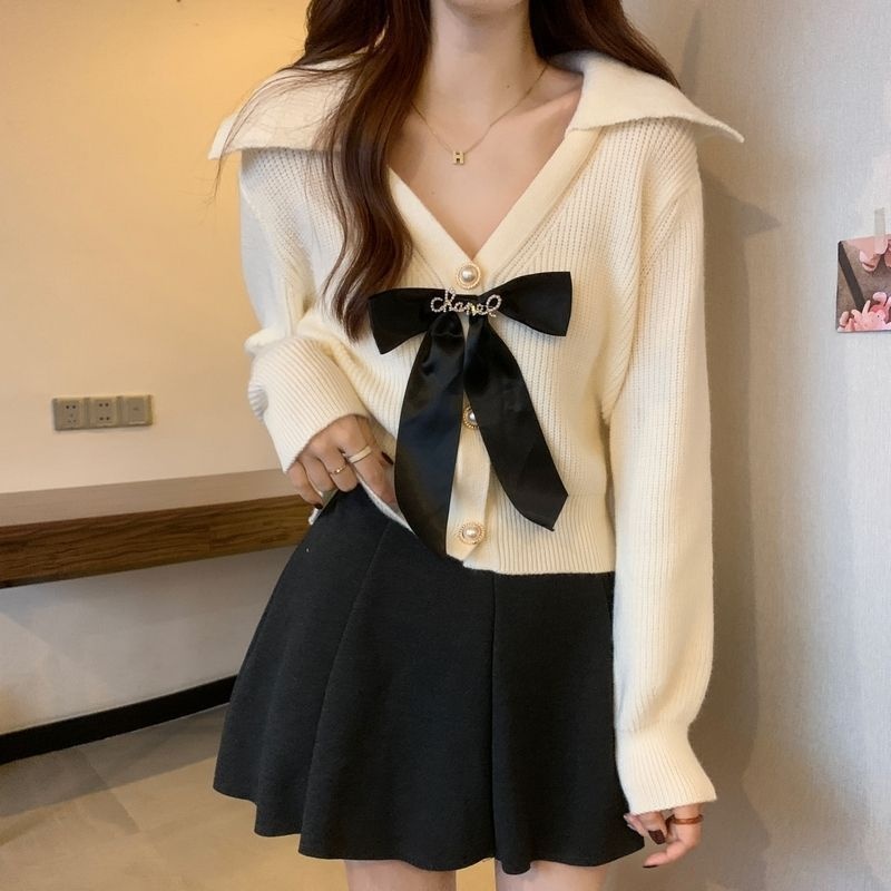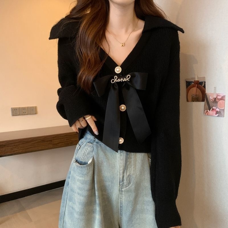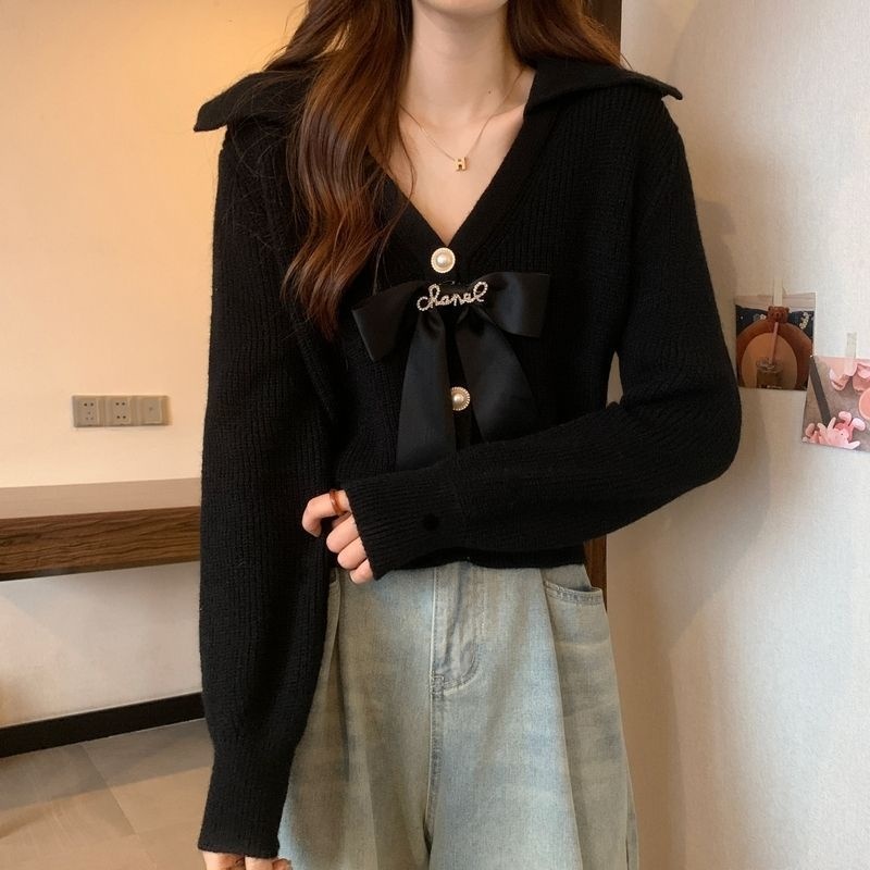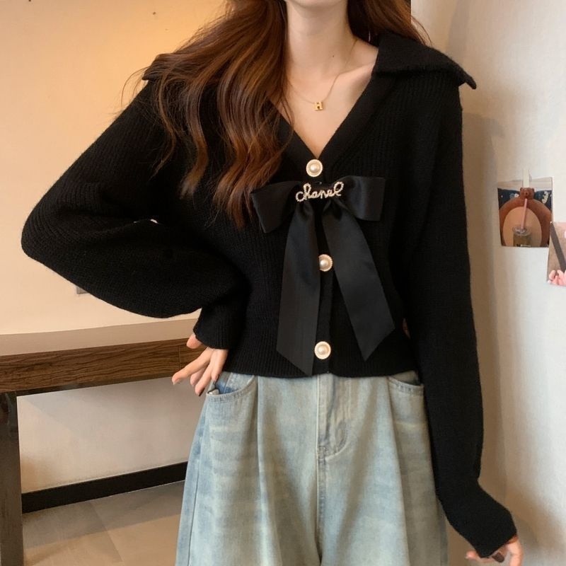 法式红色针织设计翻领开衫毛衣秋冬感小众蝴蝶结秋季短款显瘦上衣