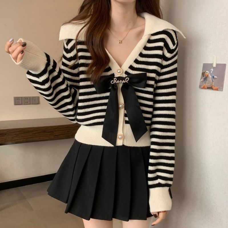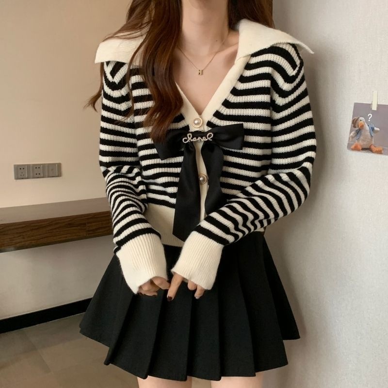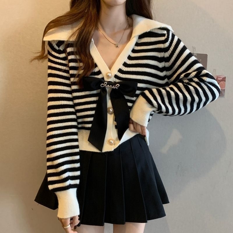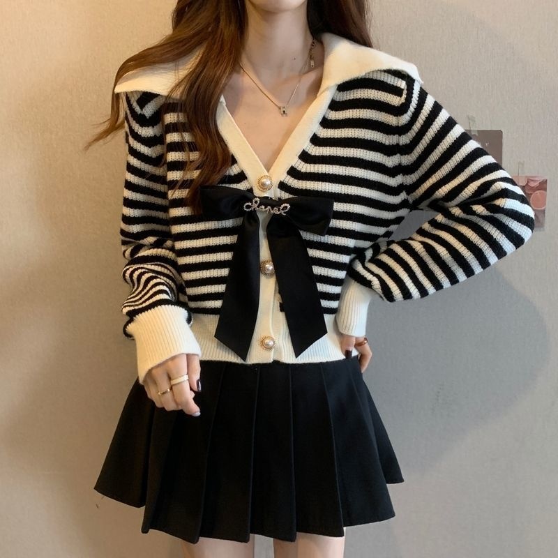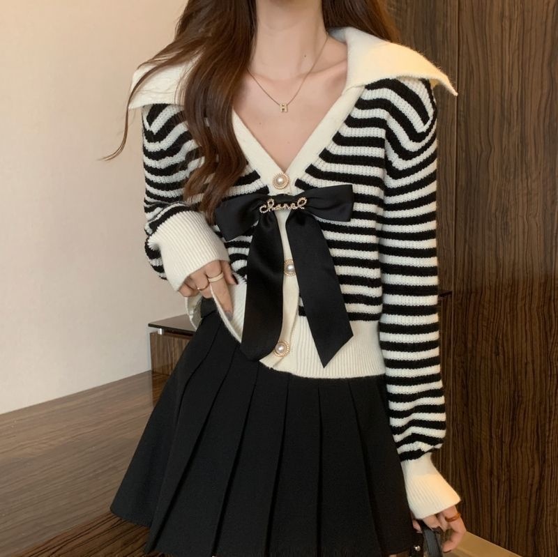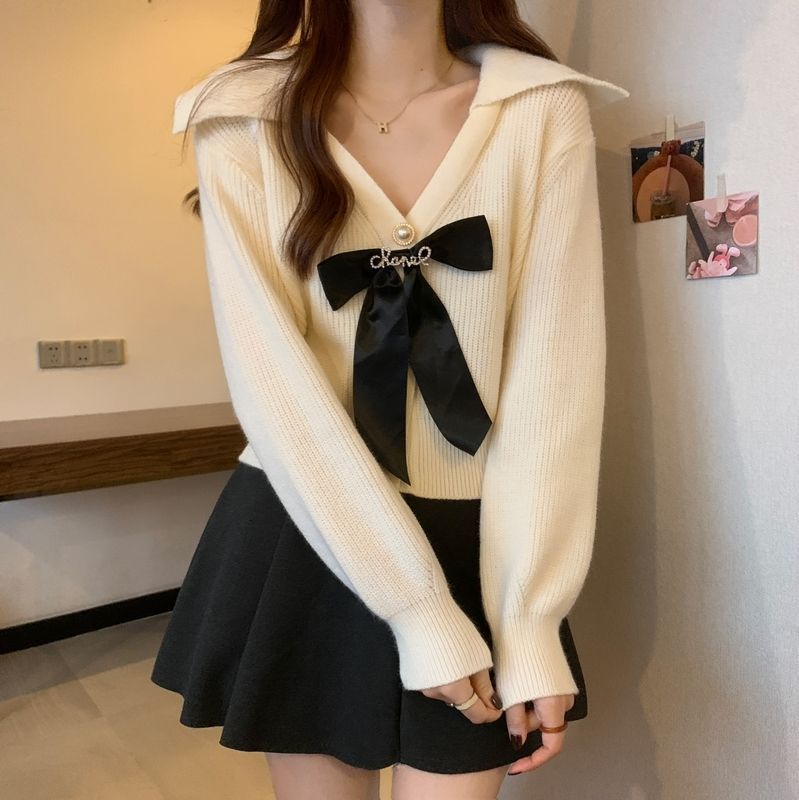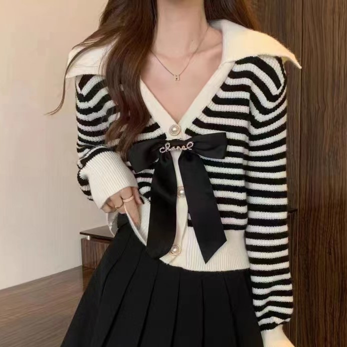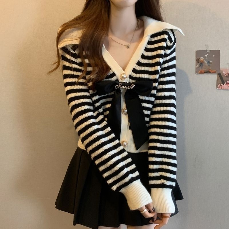 法式红色针织设计翻领开衫毛衣秋冬感小众蝴蝶结秋季短款显瘦上衣