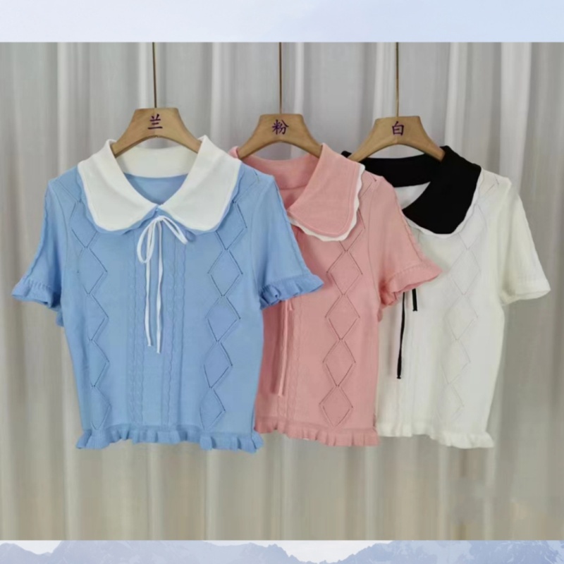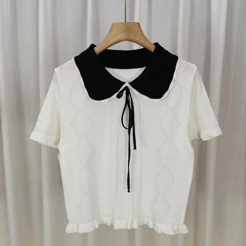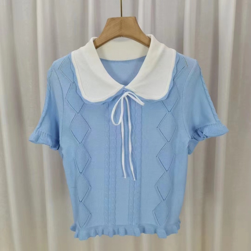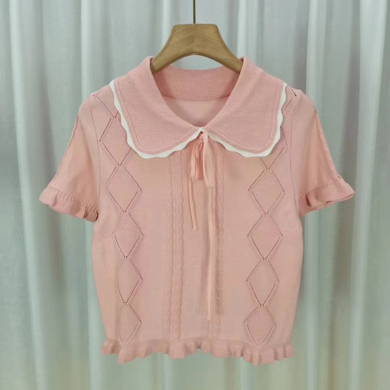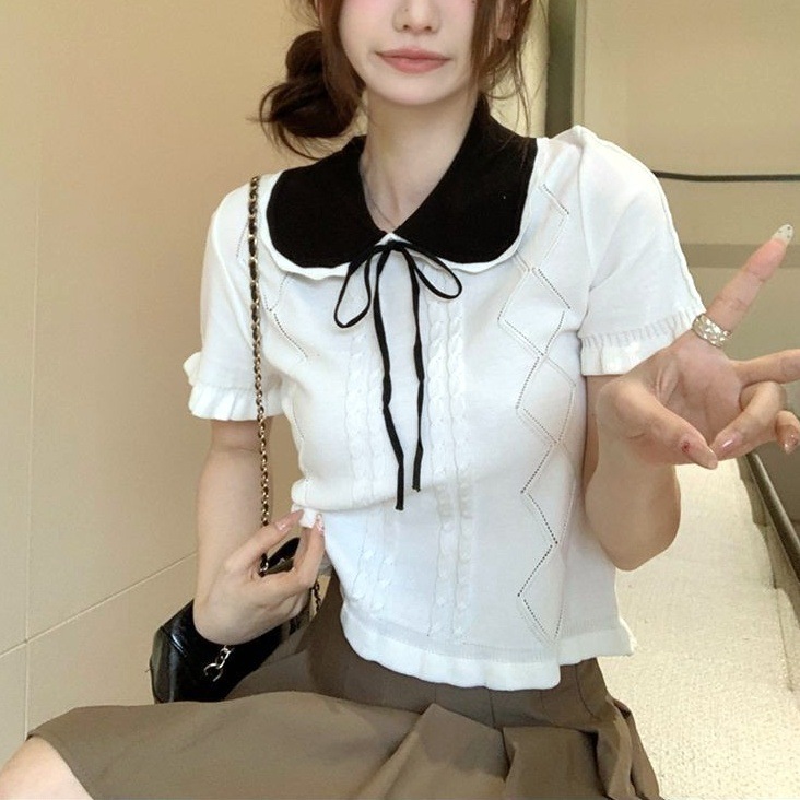 春夏季新款压花短款洋气小衫女木耳边娃娃领甜美蝴蝶结短袖上衣