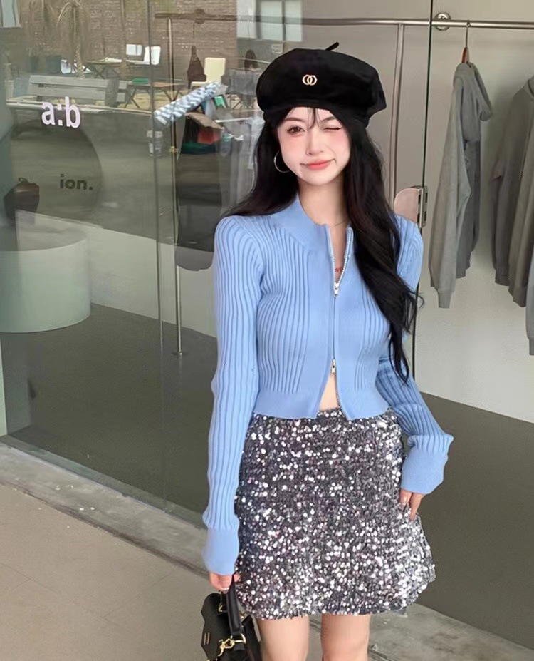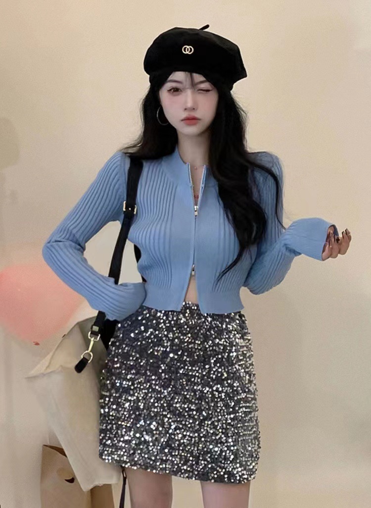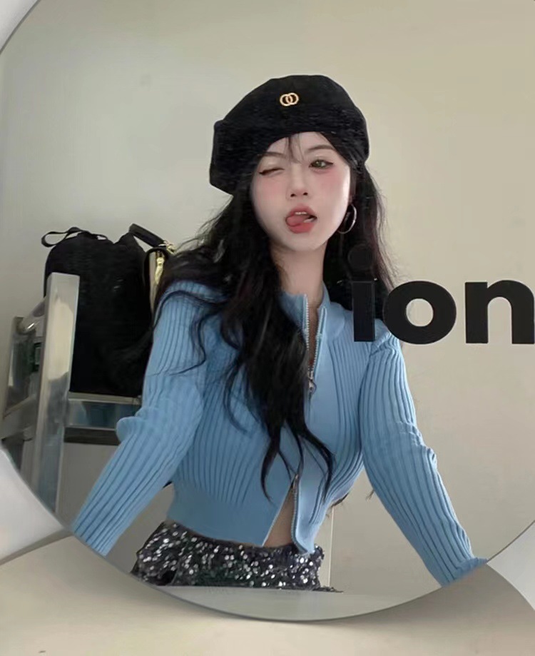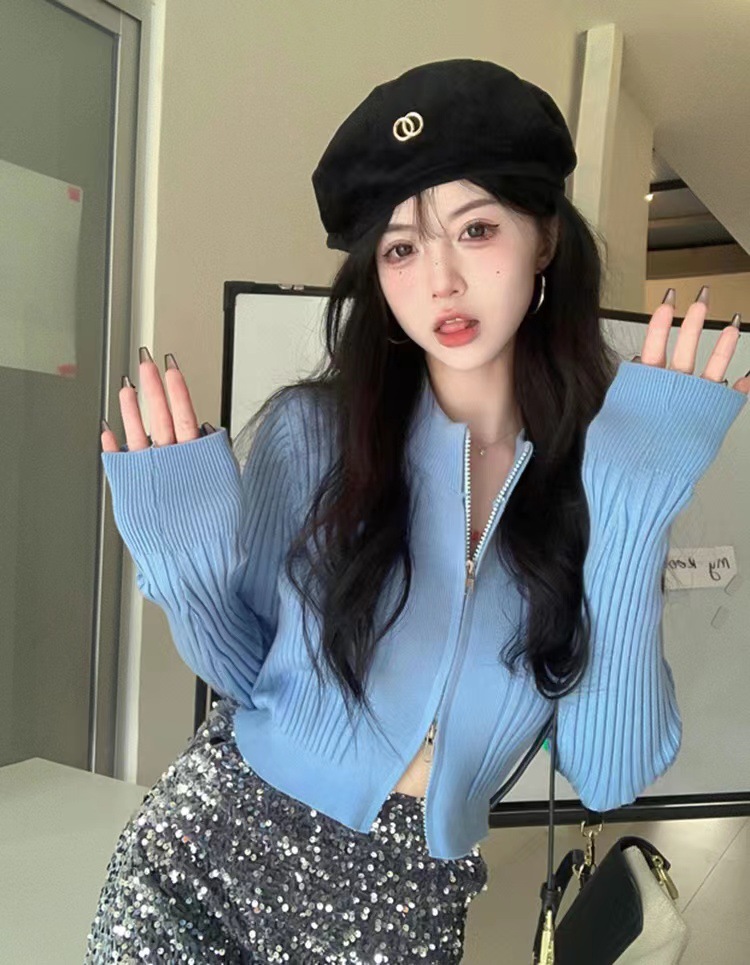 时尚辣妹修身短款长袖针织衫春秋季2024新款显瘦拉链开衫上衣女潮
