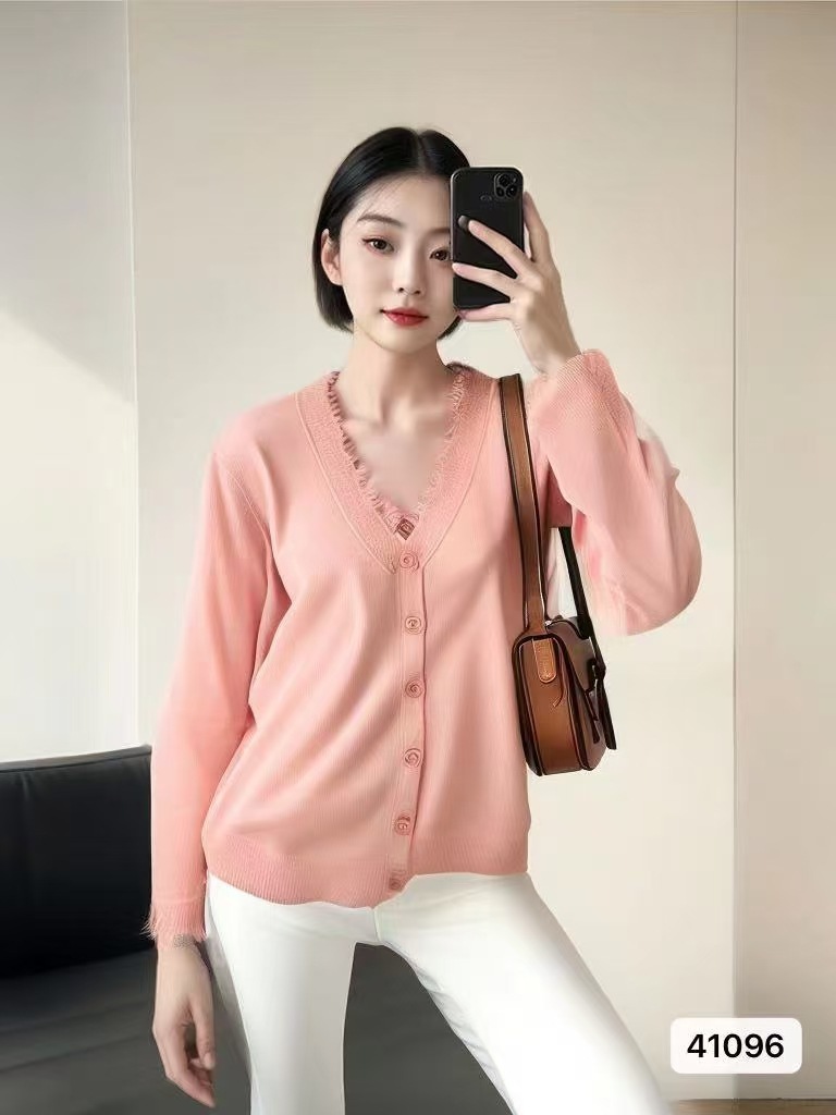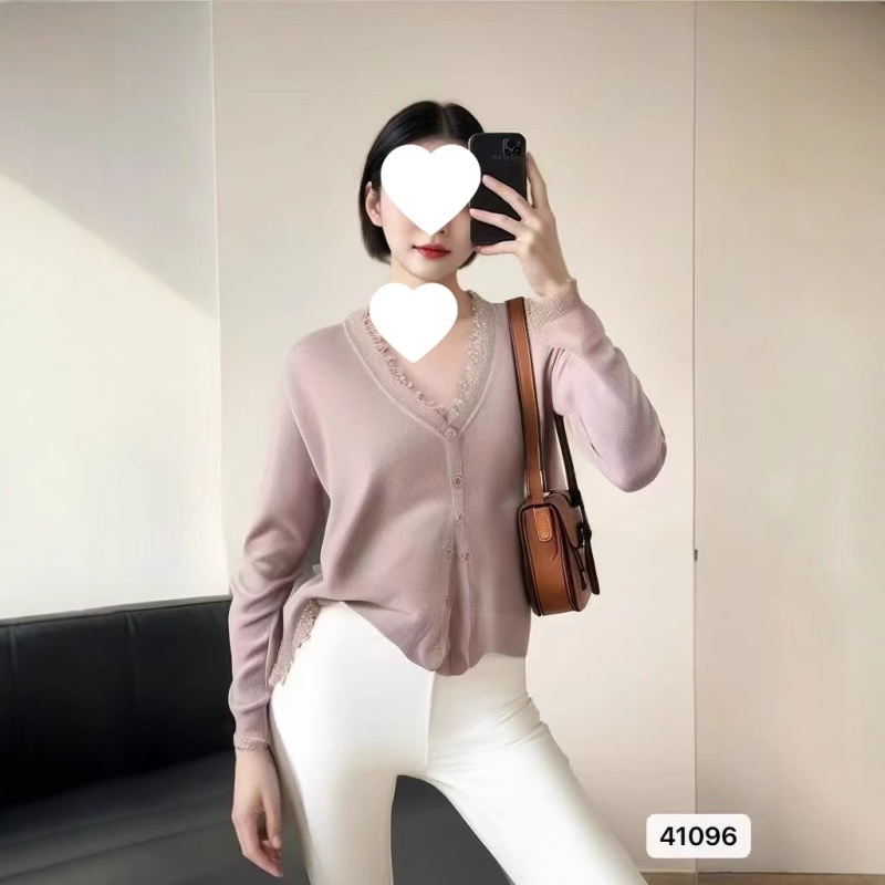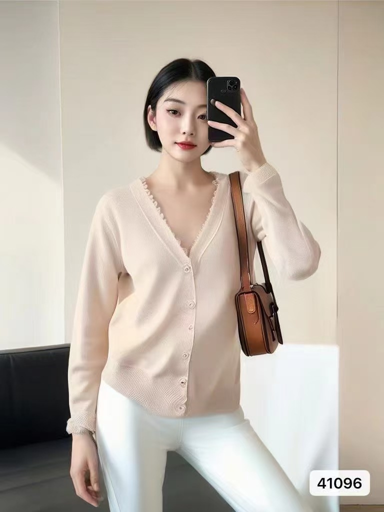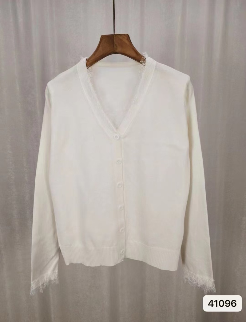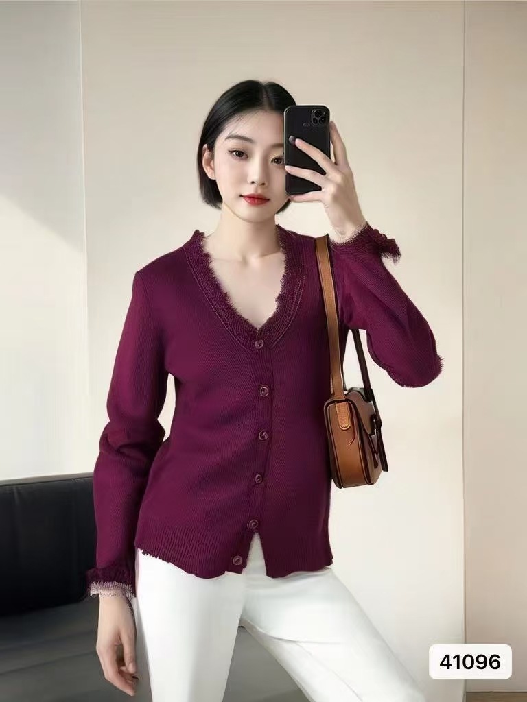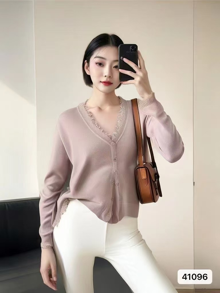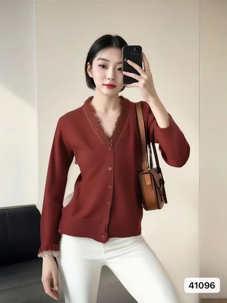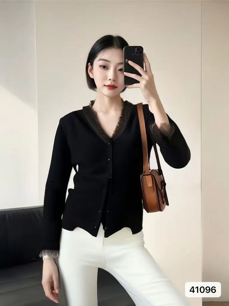 2024秋冬新款百搭小众韩版时尚V领蕾丝边拼接长袖开衫短款上衣女