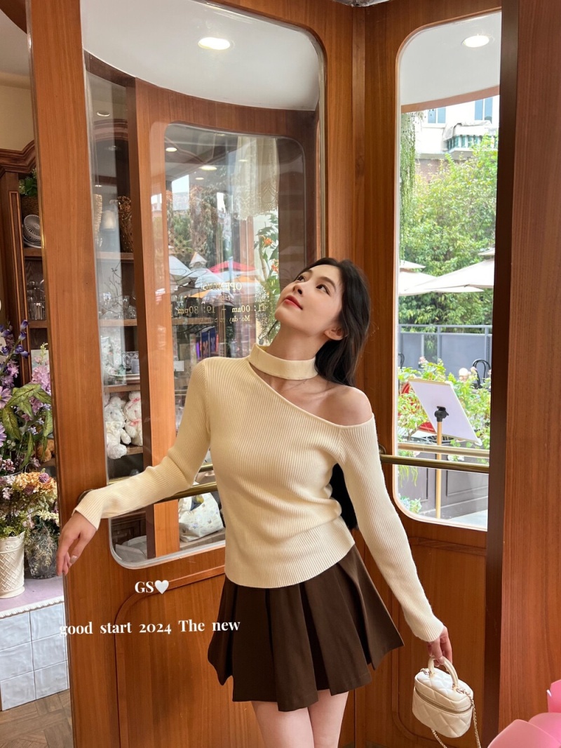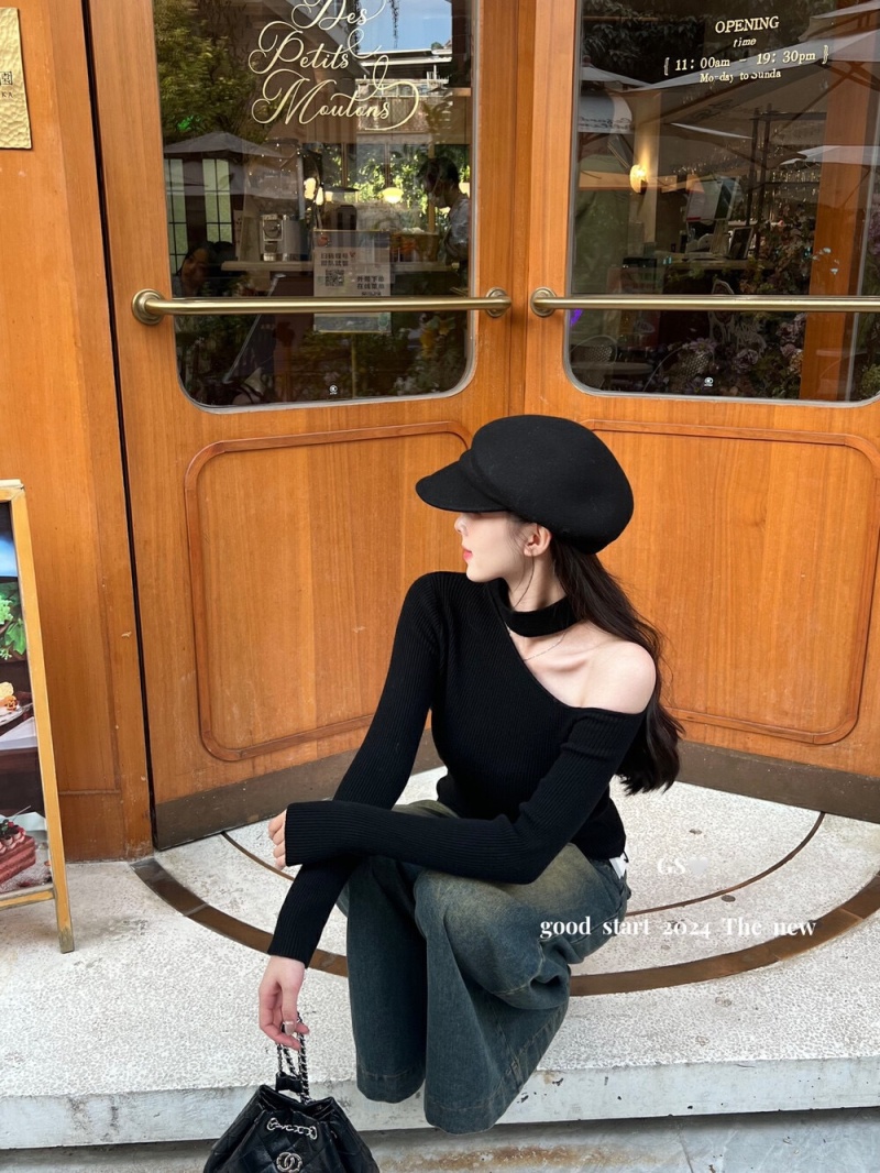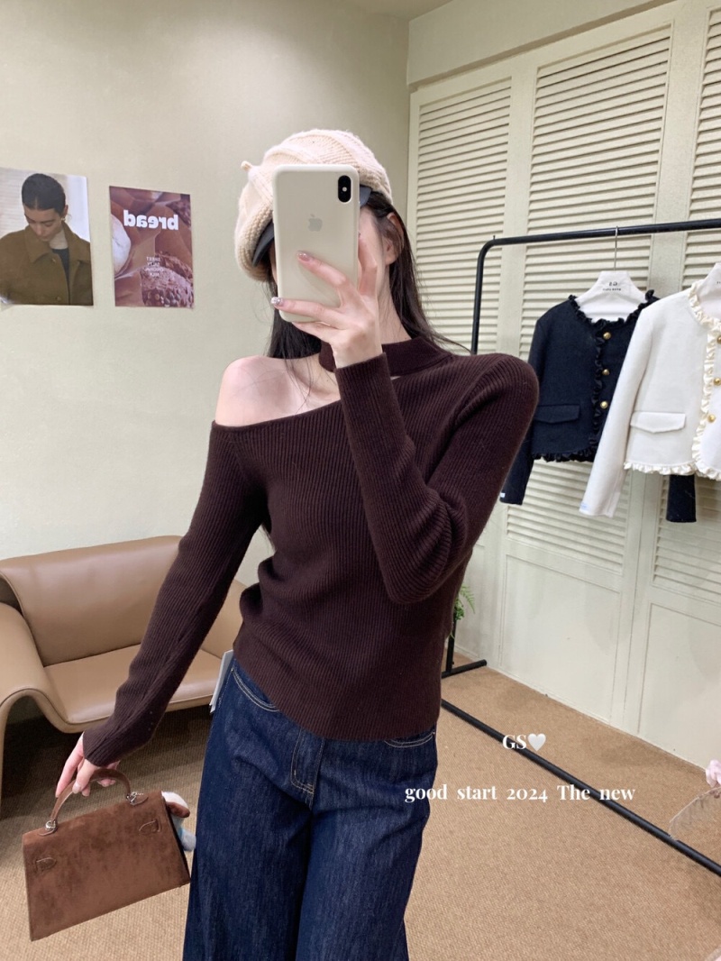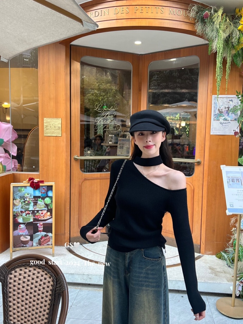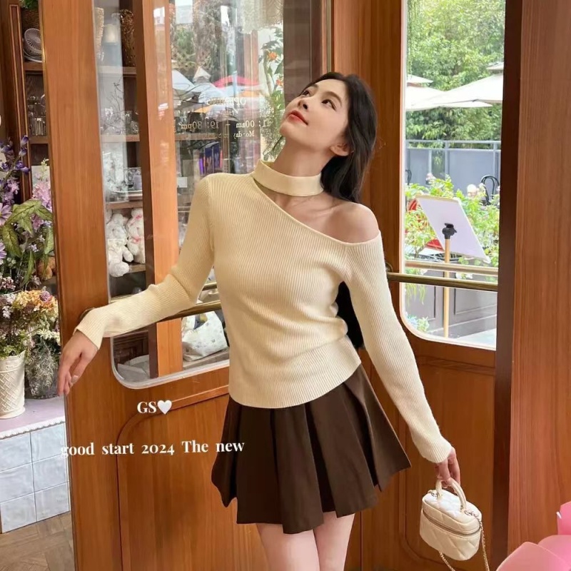 2024秋冬新款强推爆品韩系气质纯欲挂脖露肩长袖针织保暖短款毛衣
