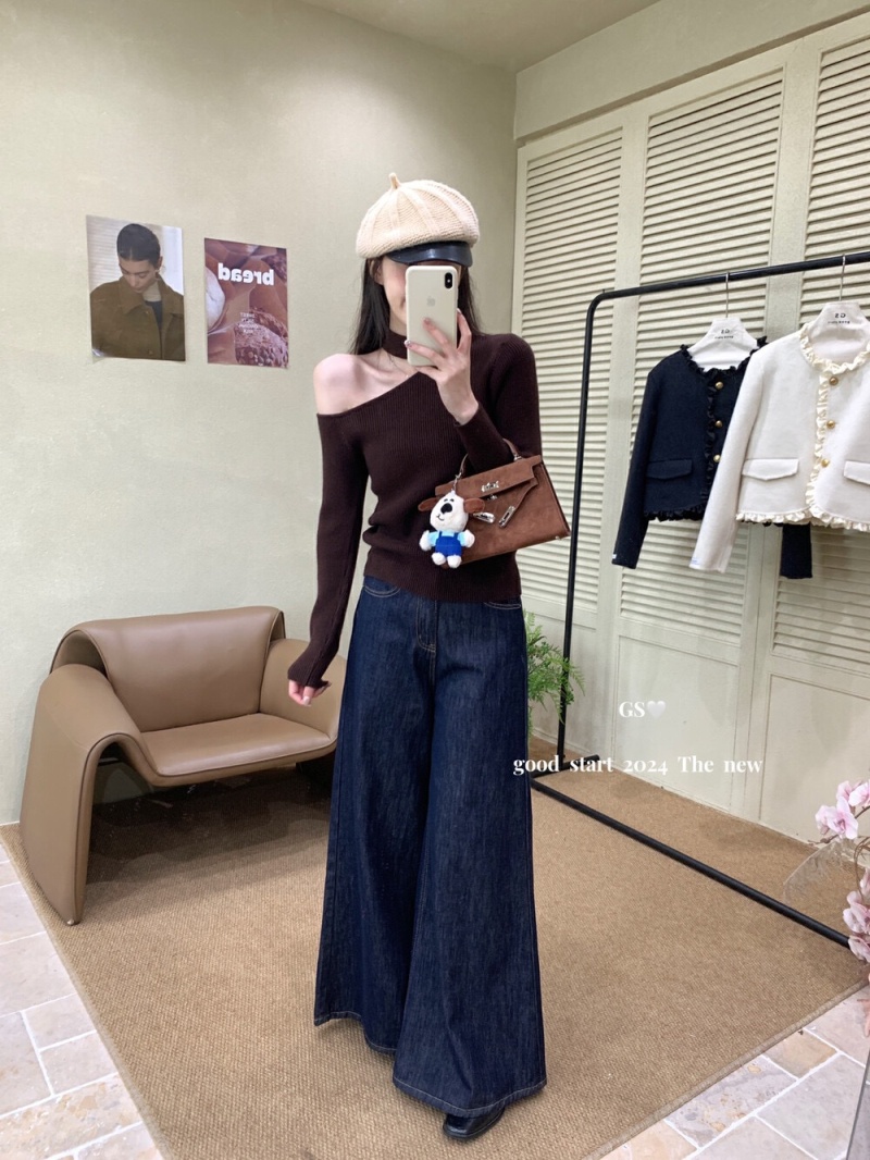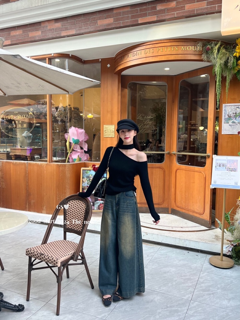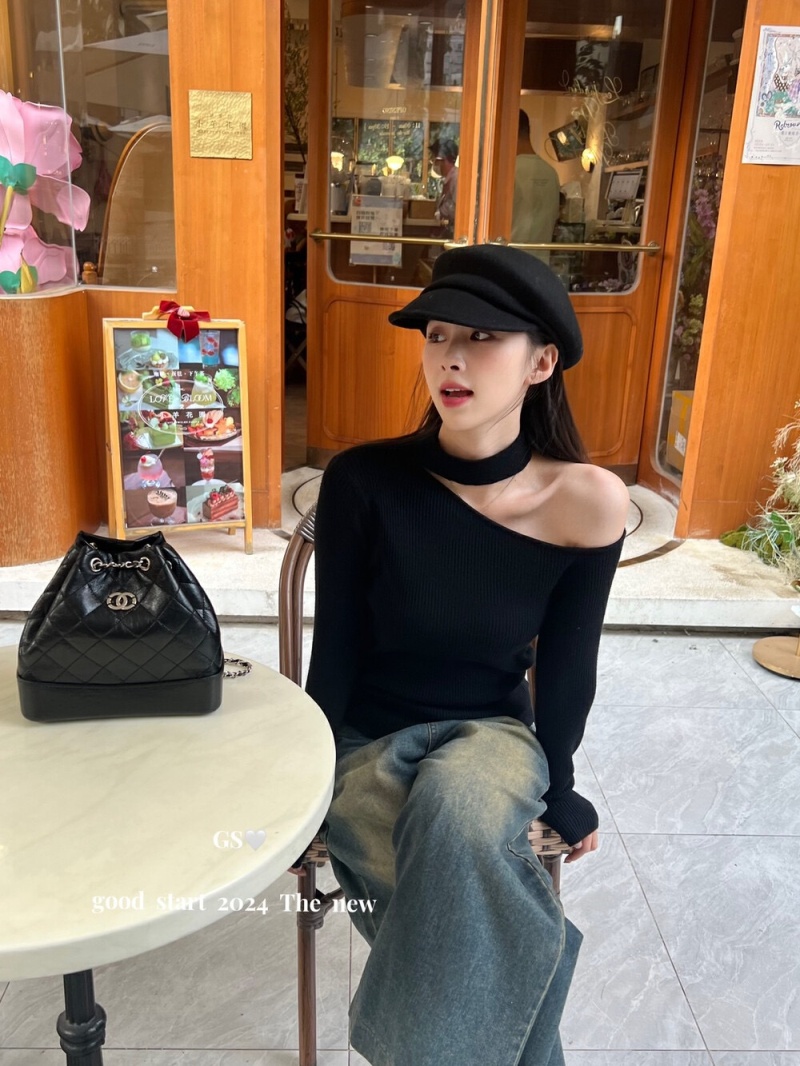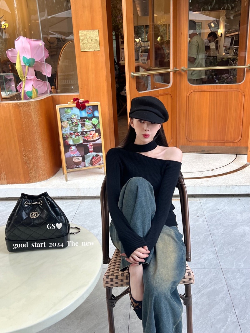 2024秋冬新款强推爆品韩系气质纯欲挂脖露肩长袖针织保暖短款毛衣