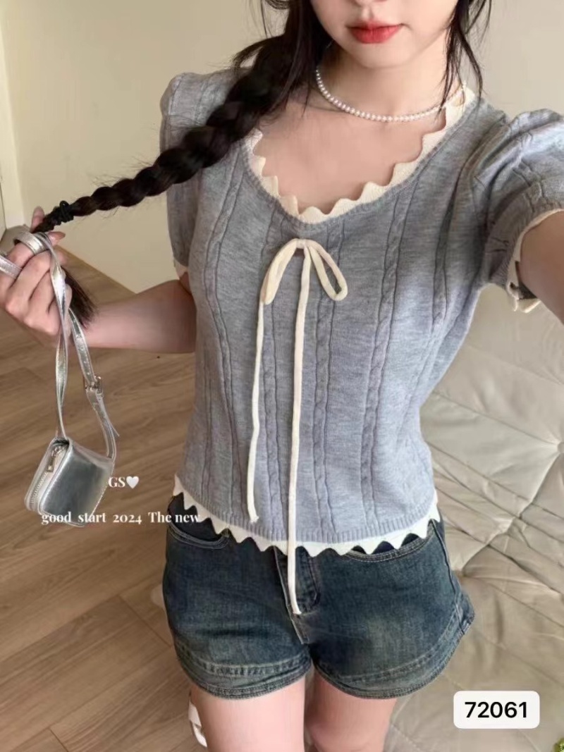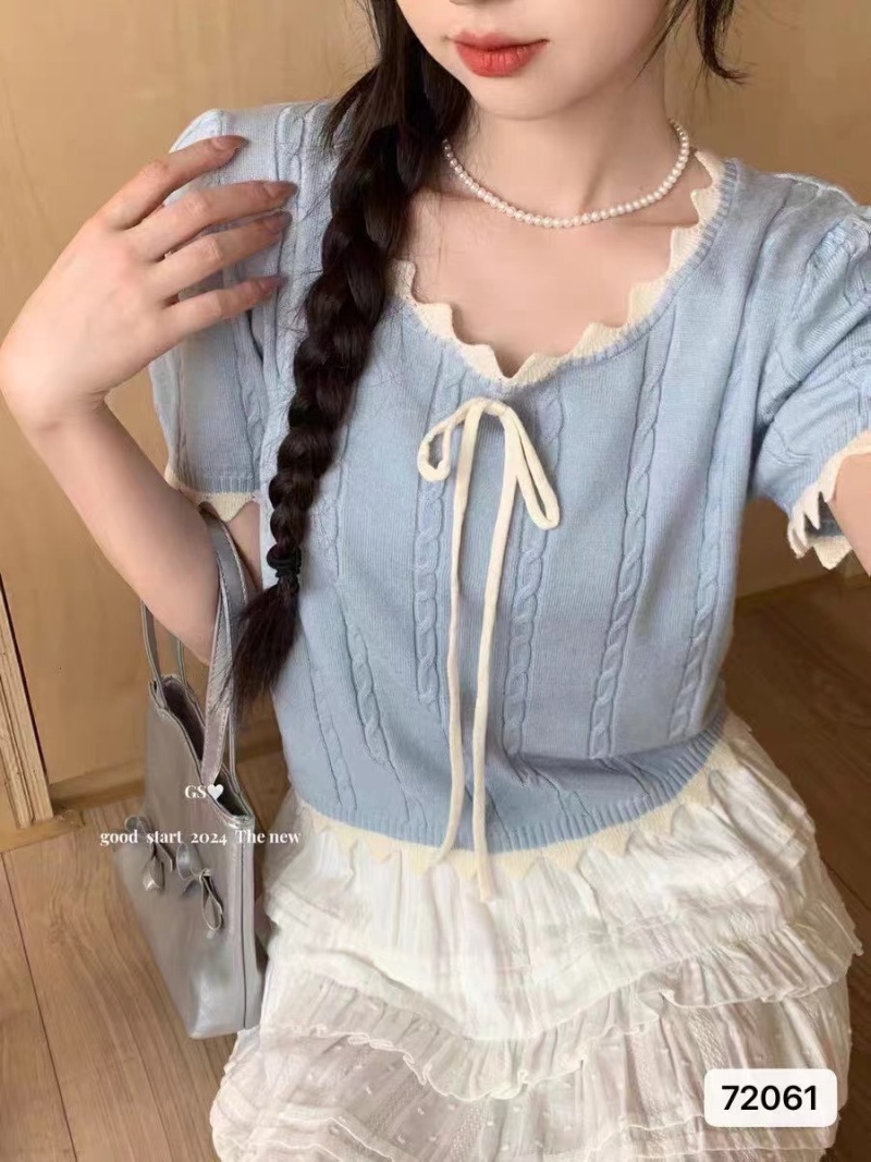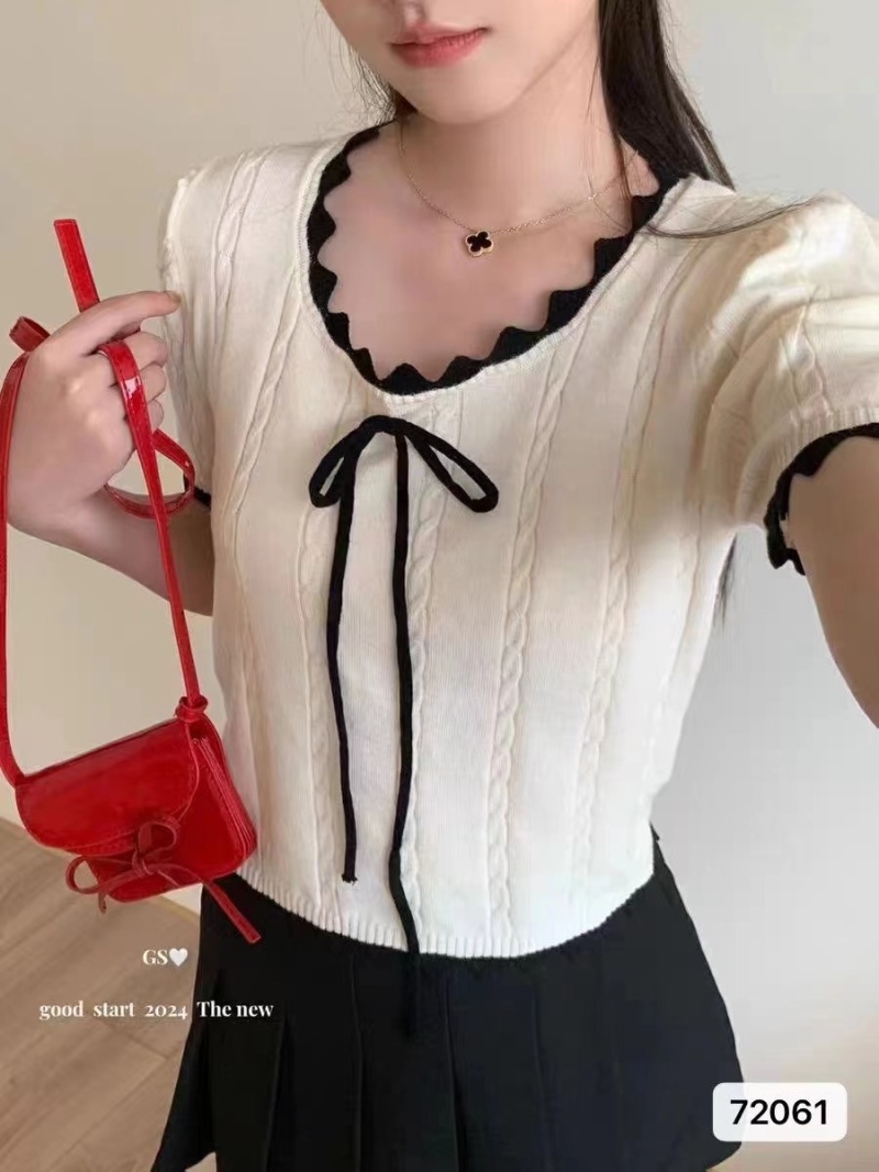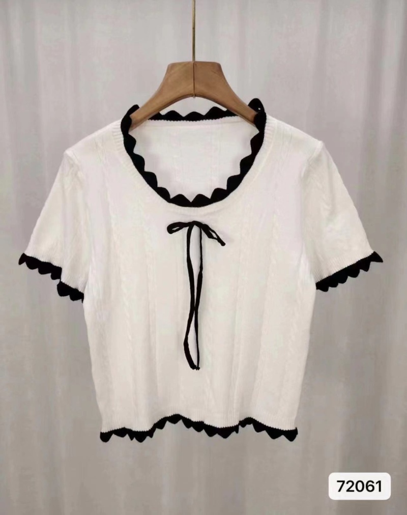 夏季2024年新款韩系波浪边撞色蝴蝶结系带百搭上衣修身针织短袖女