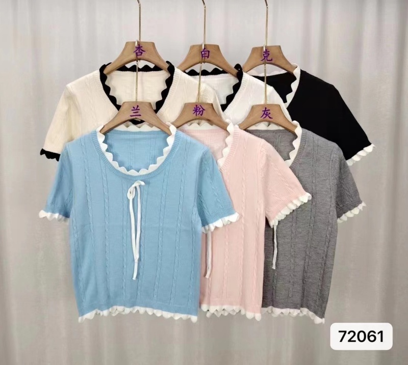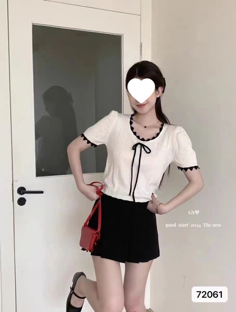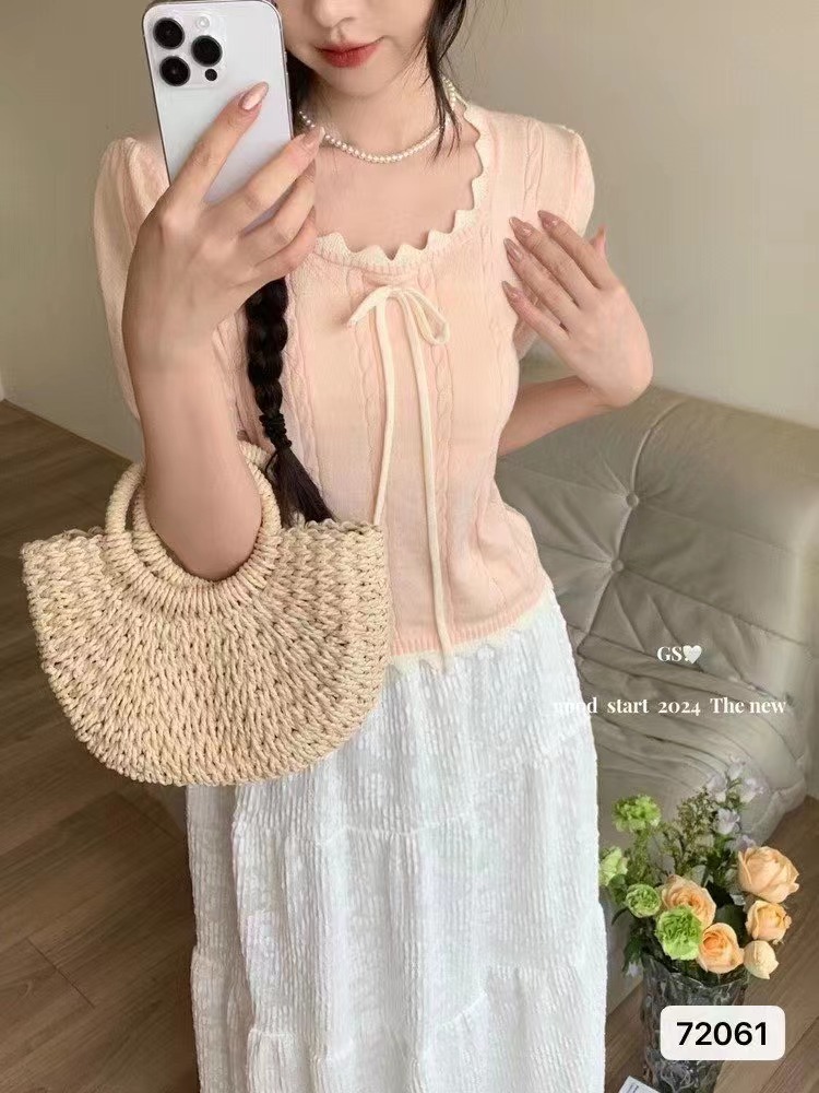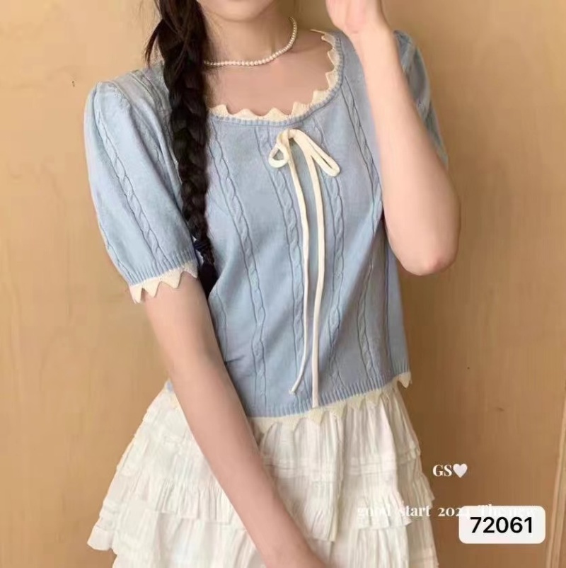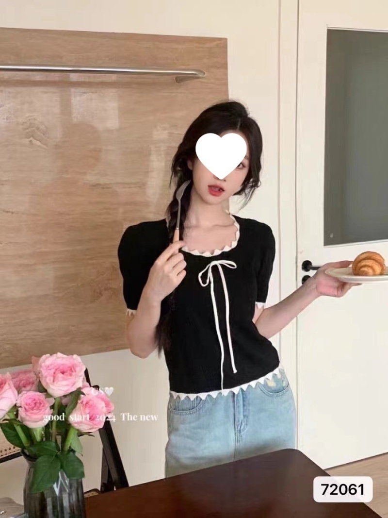 夏季2024年新款韩系波浪边撞色蝴蝶结系带百搭上衣修身针织短袖女