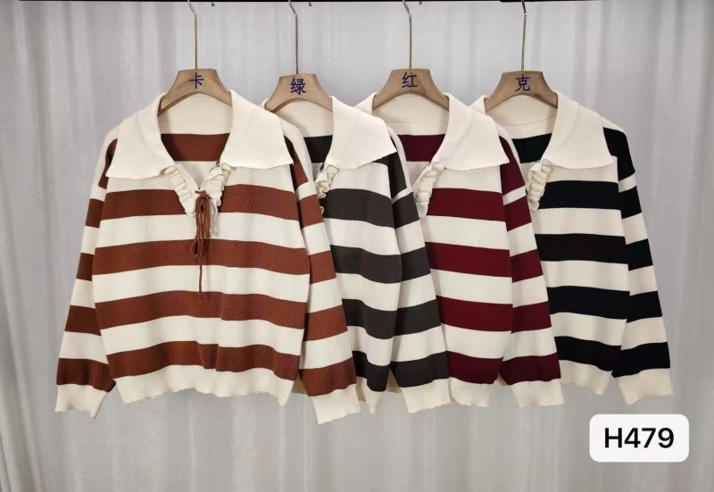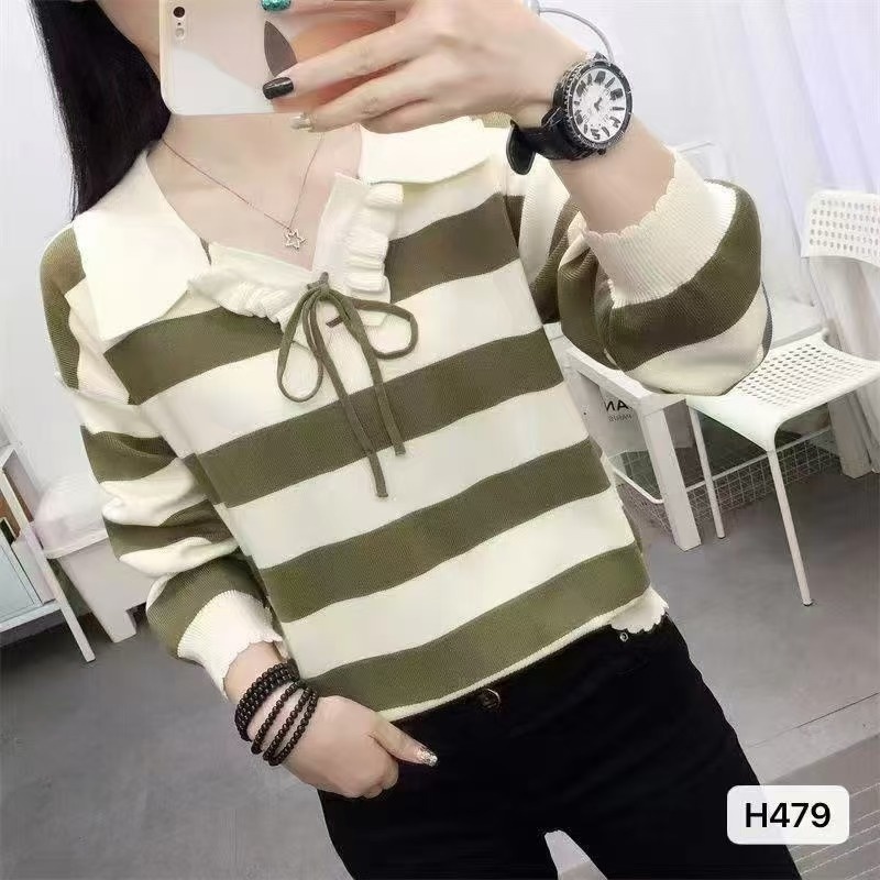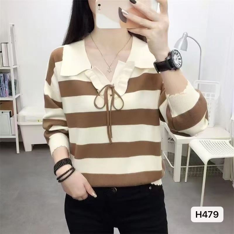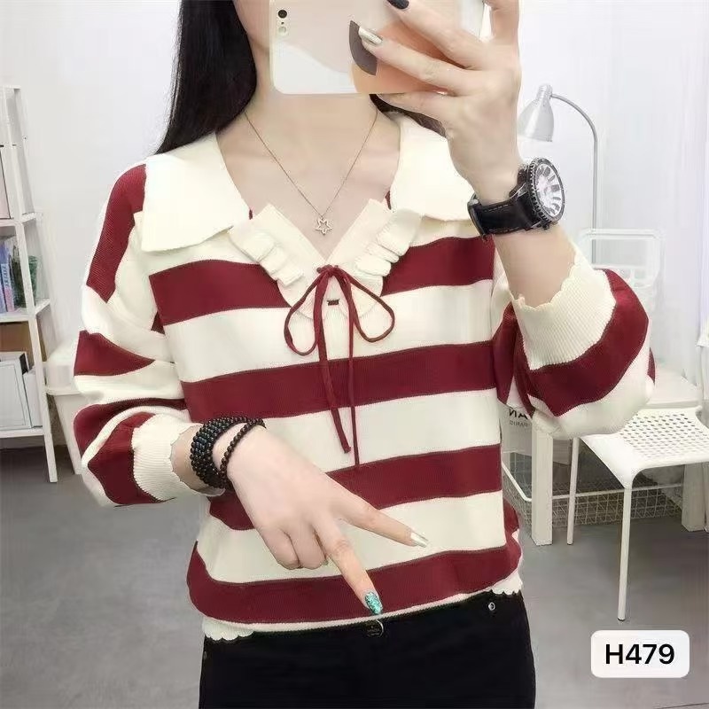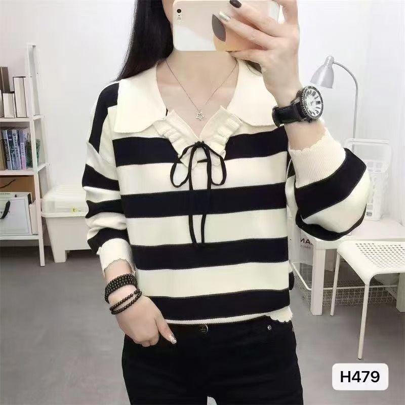 2024秋冬新款韩版小众设计感polo领系带条纹宽松长袖上衣女