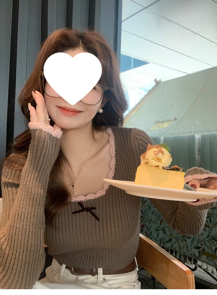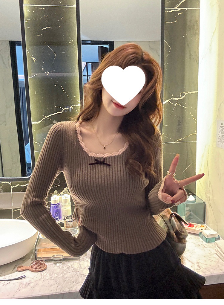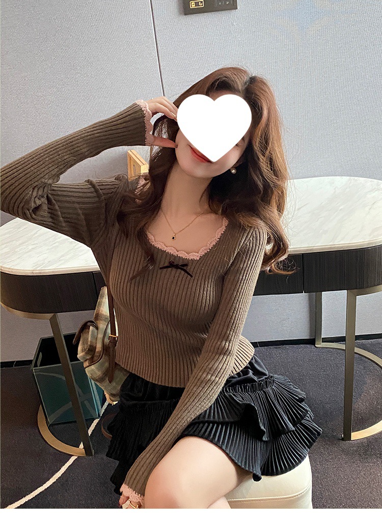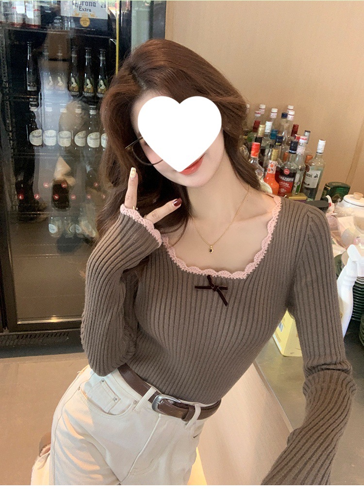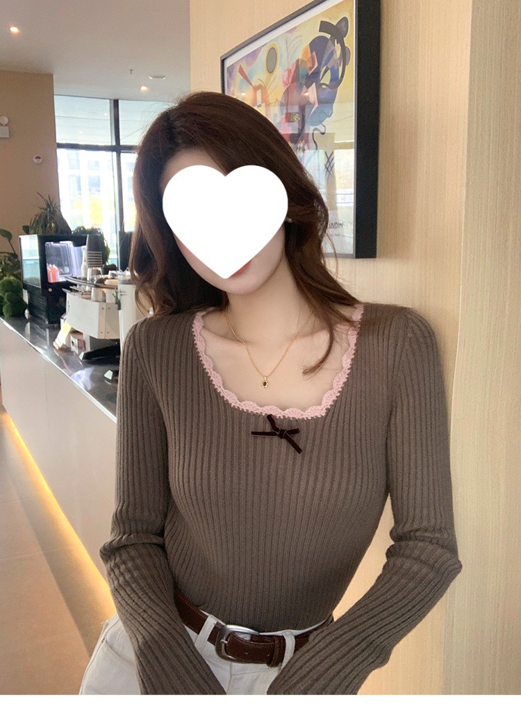 方领蕾丝针织打底衫女2024新款美拉德内搭蝴蝶结毛衣撞色低领上衣