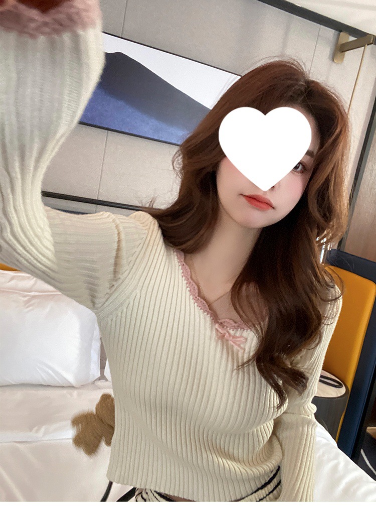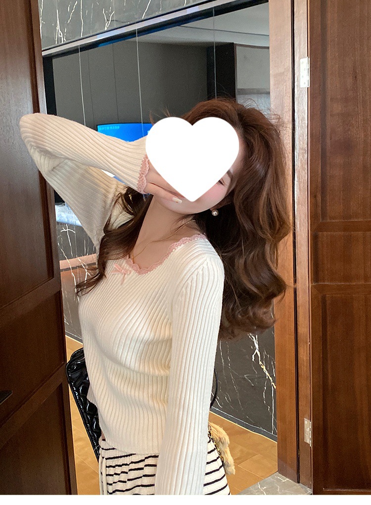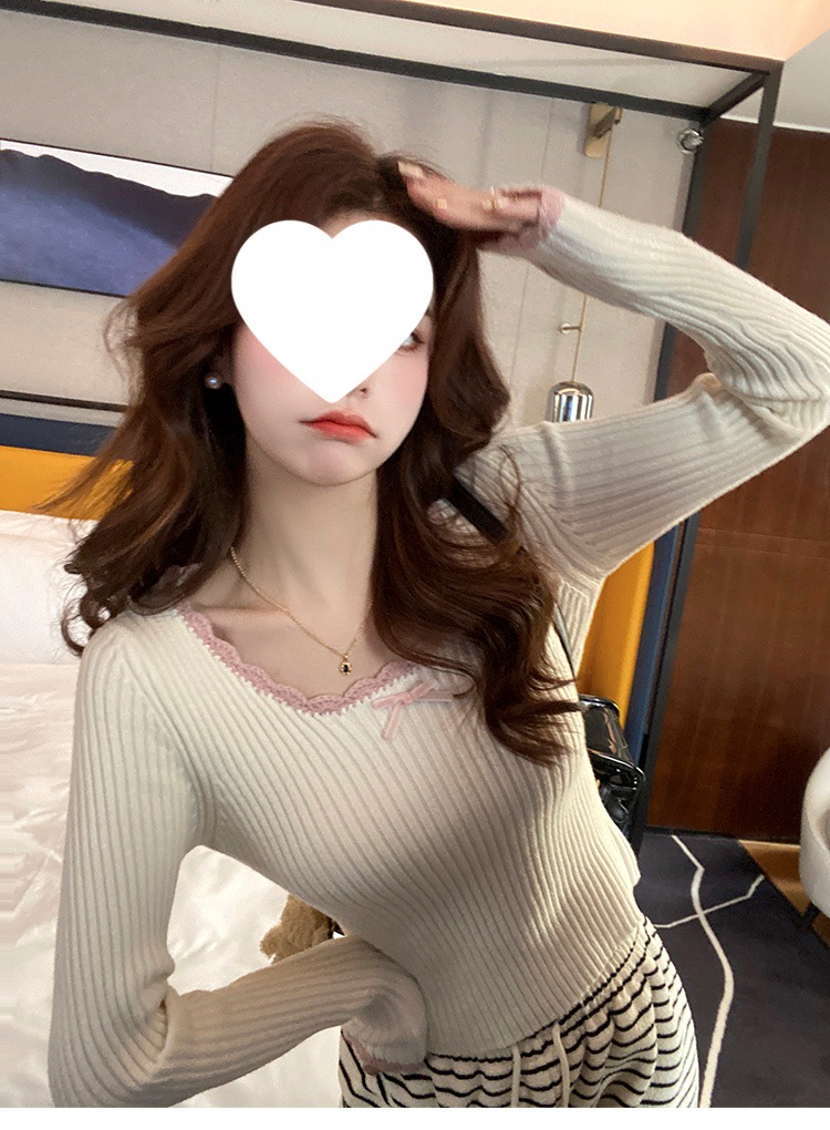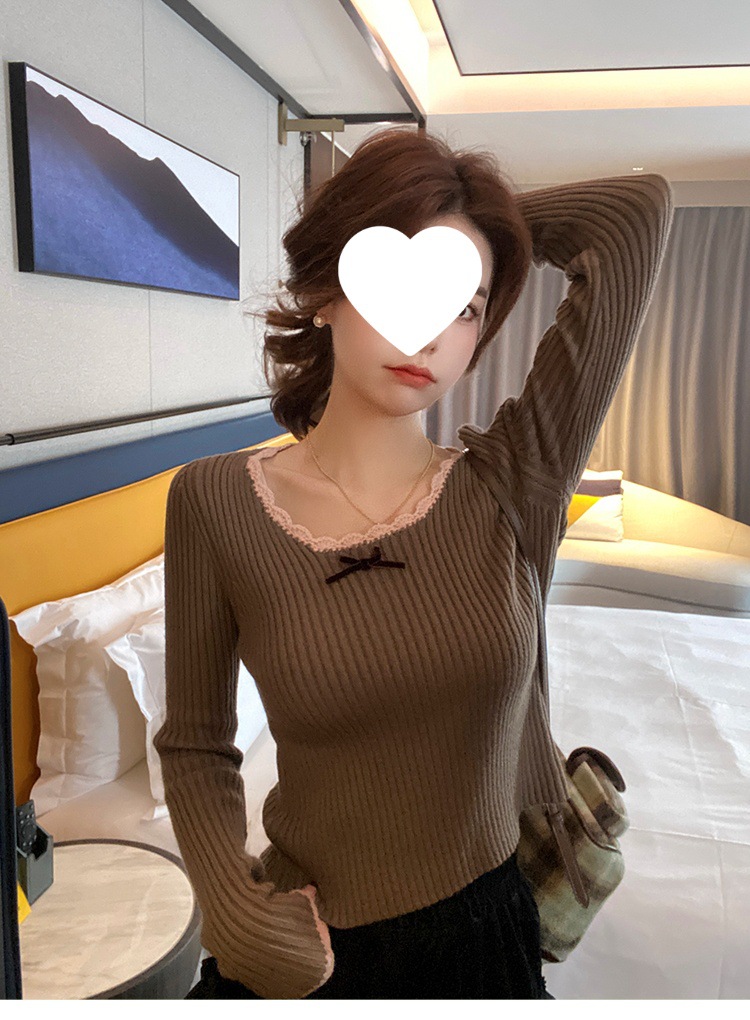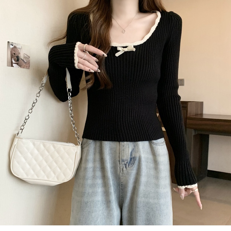 方领蕾丝针织打底衫女2024新款美拉德内搭蝴蝶结毛衣撞色低领上衣
