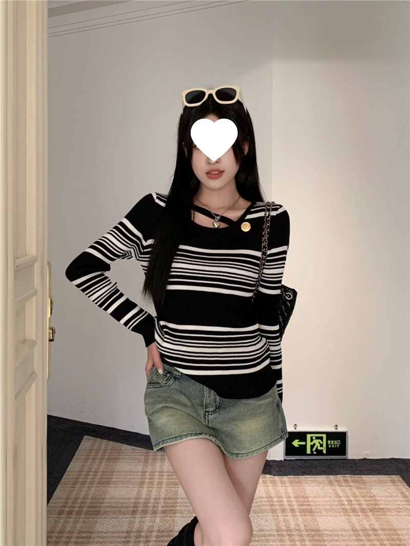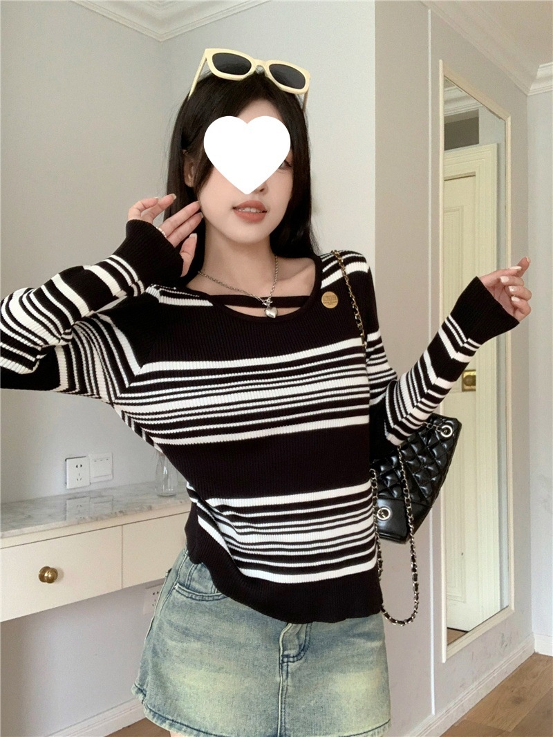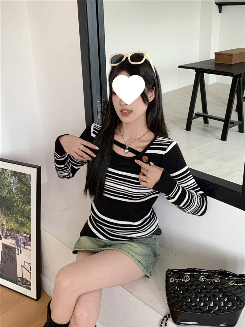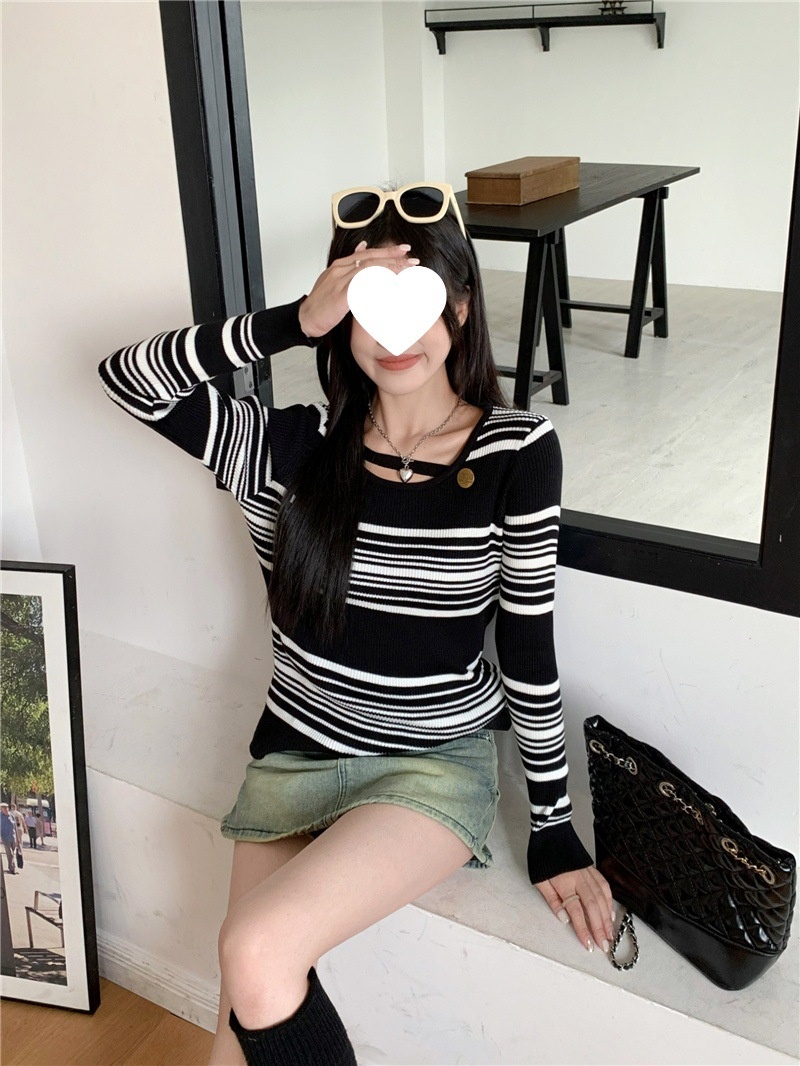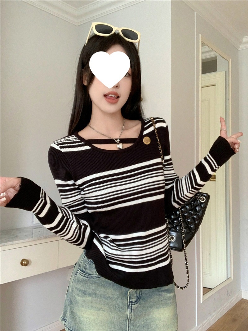 2024洋气小心机气质条纹长袖针织衫女修身显瘦内搭打底衫短款上衣