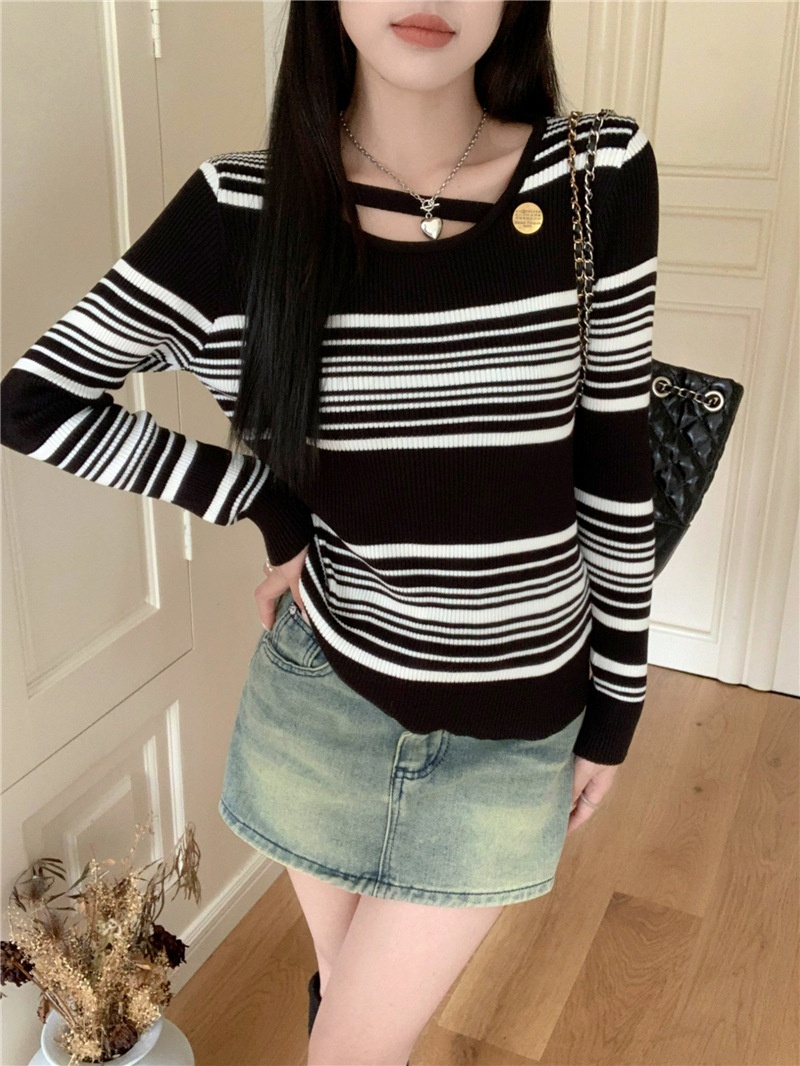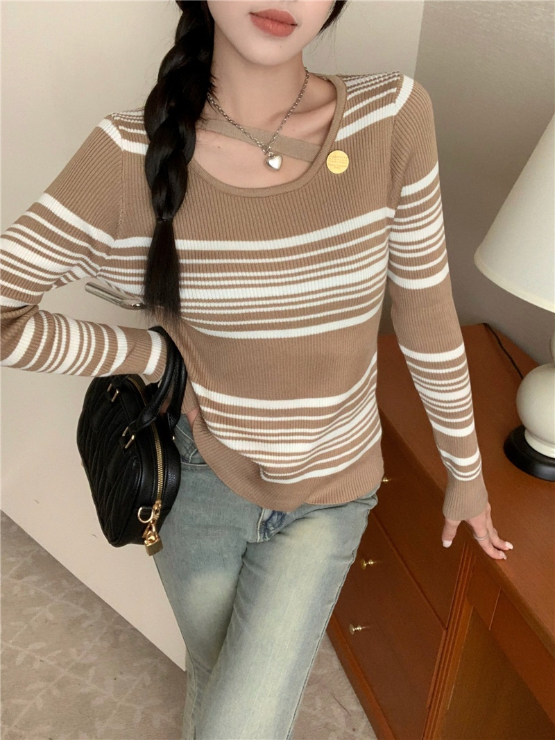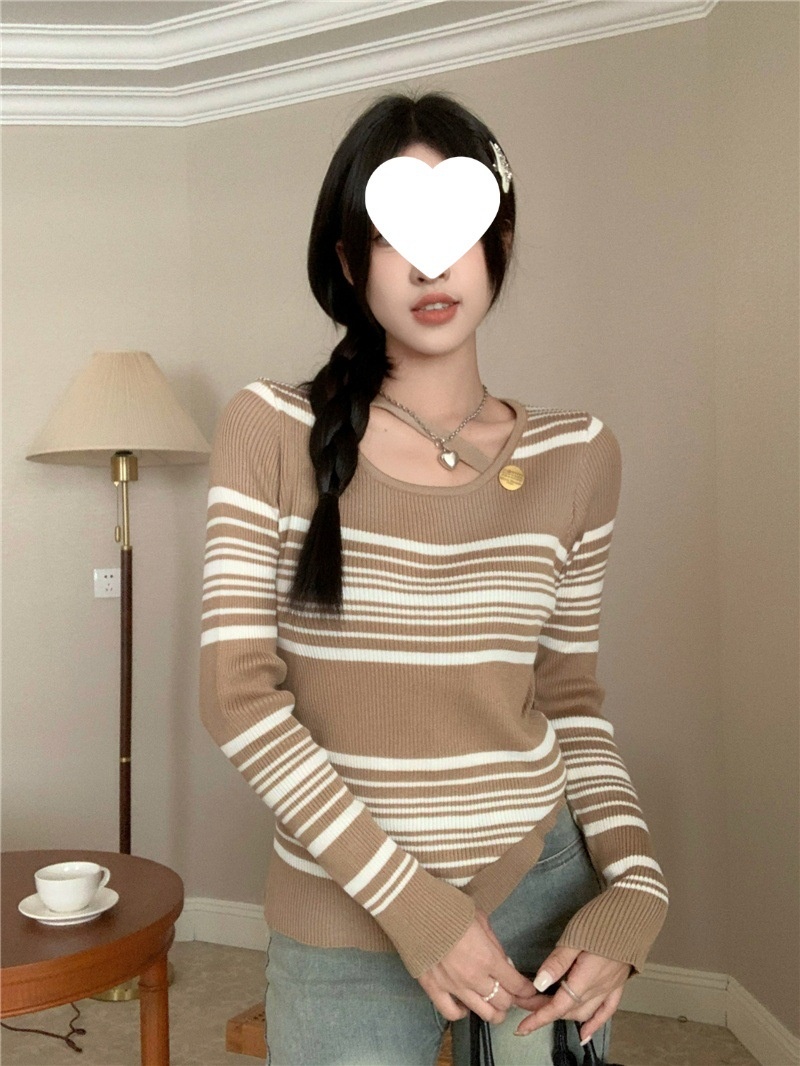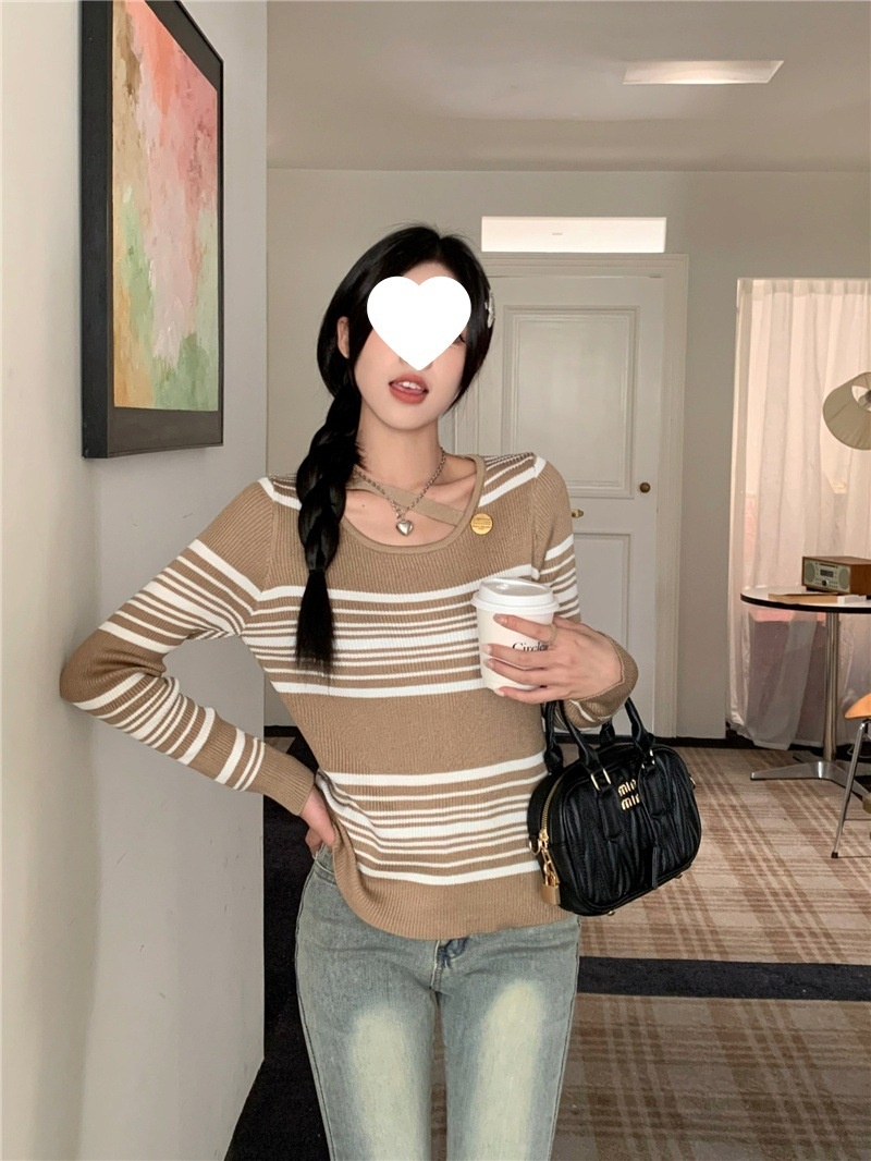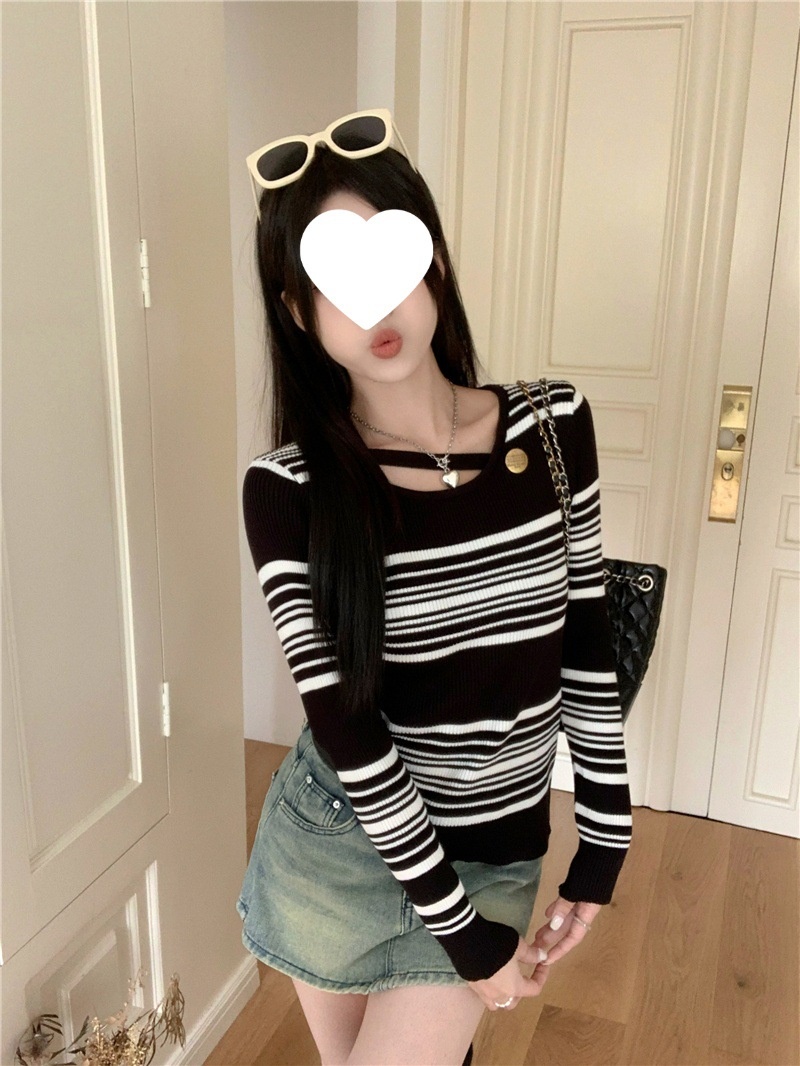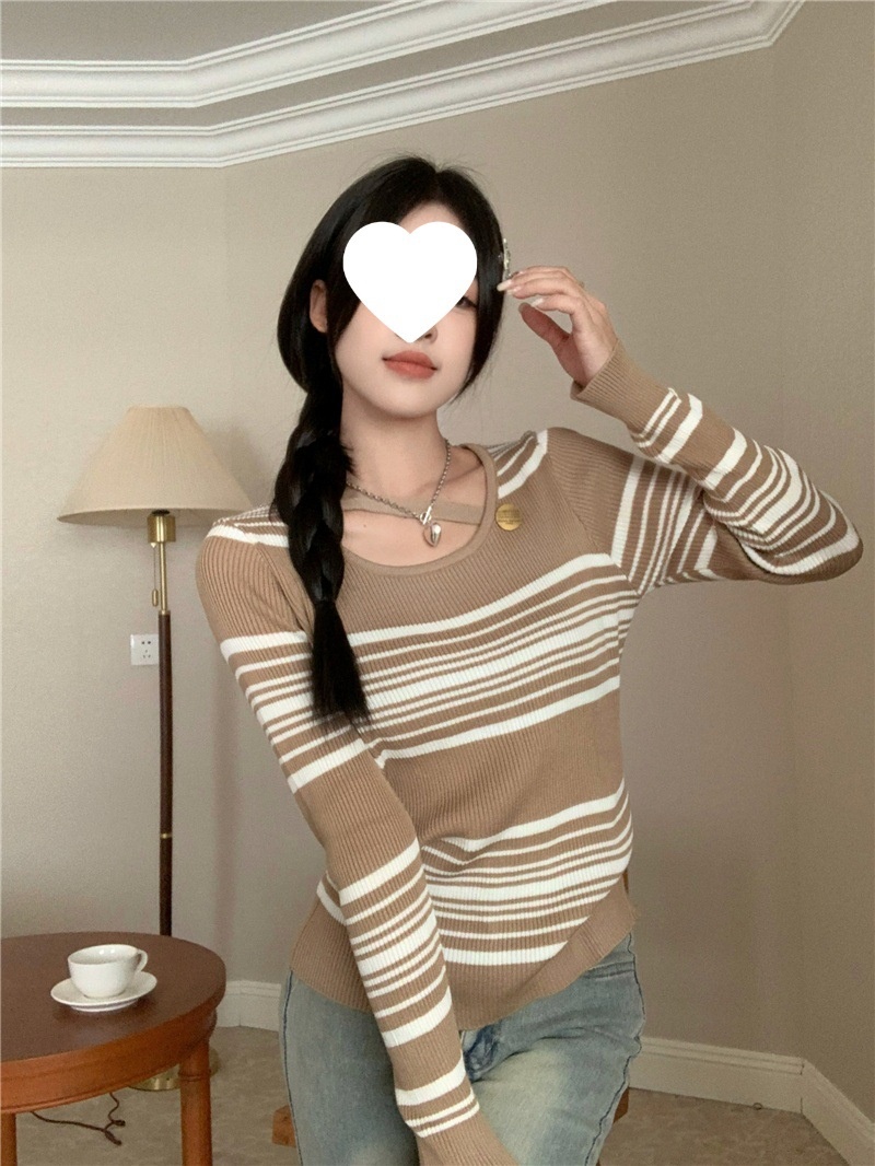 2024洋气小心机气质条纹长袖针织衫女修身显瘦内搭打底衫短款上衣
