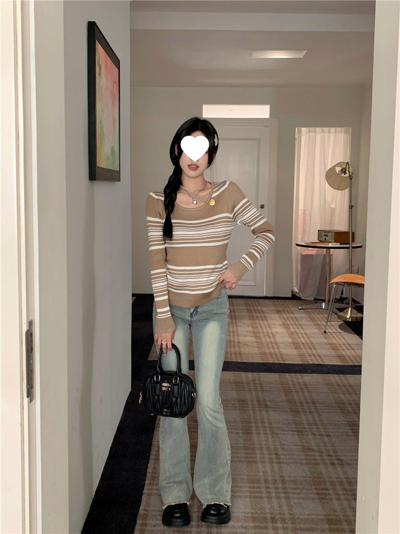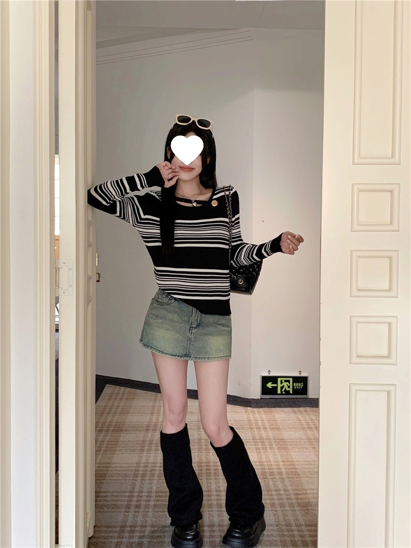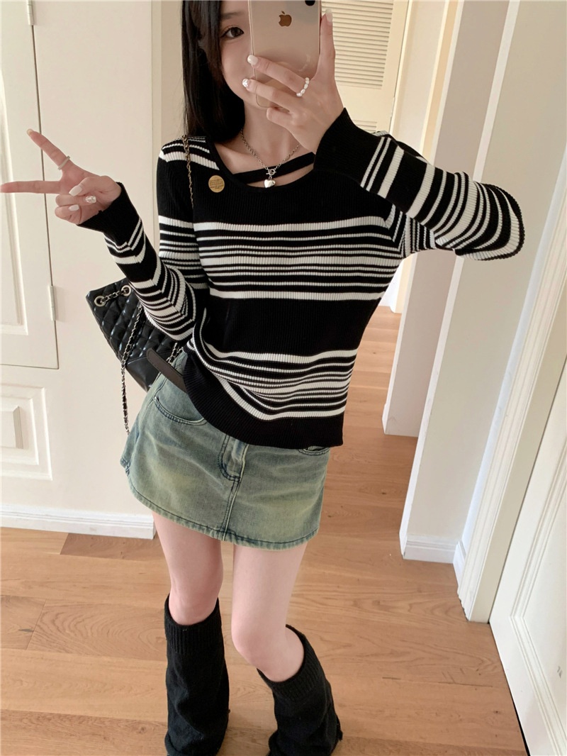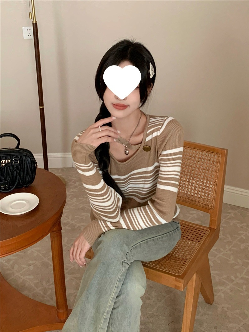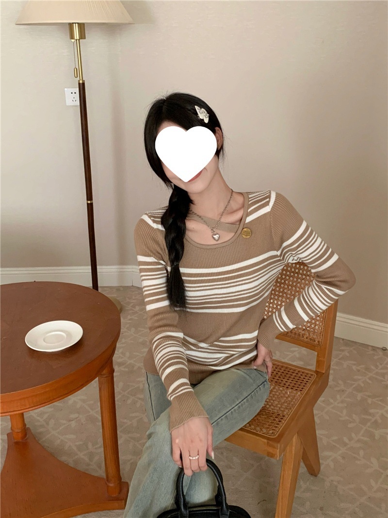 2024洋气小心机气质条纹长袖针织衫女修身显瘦内搭打底衫短款上衣