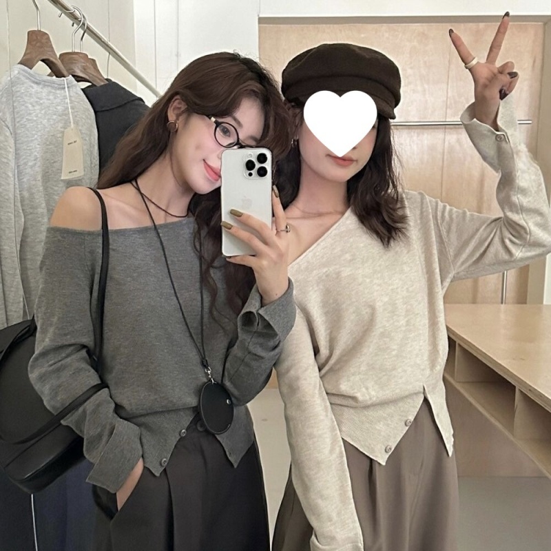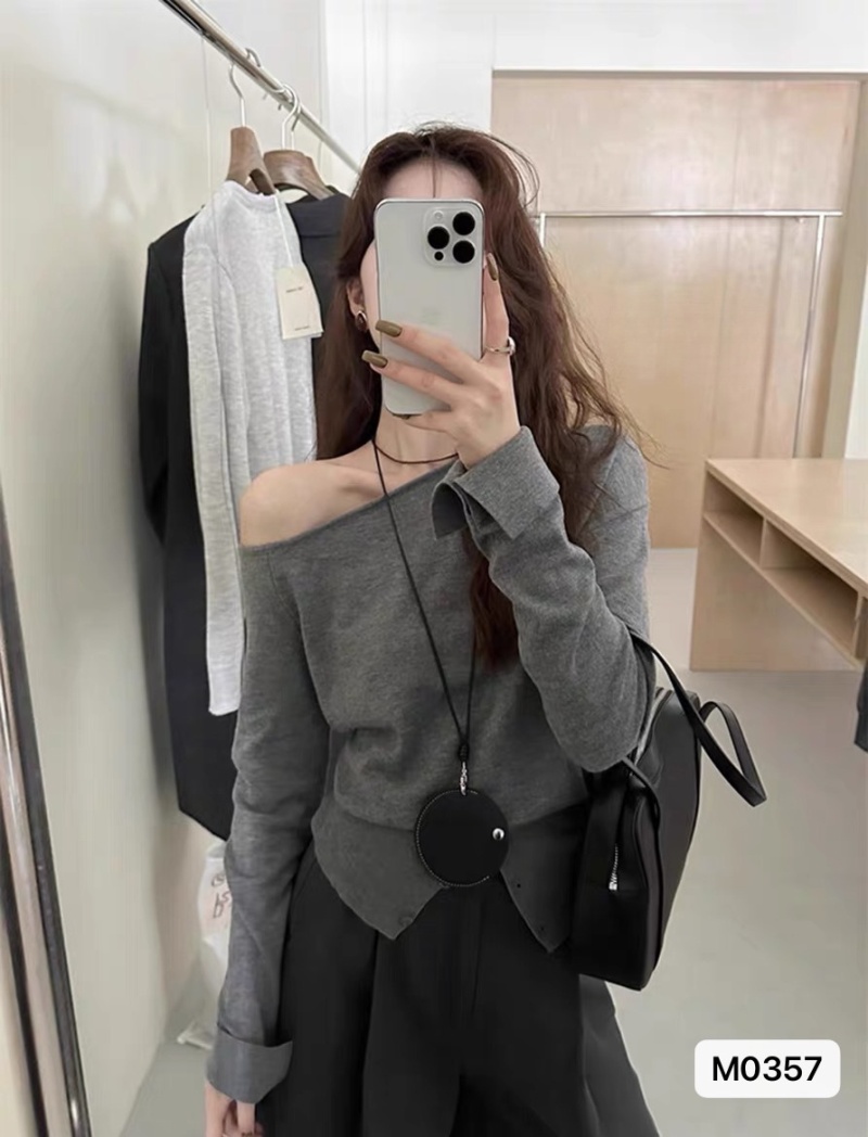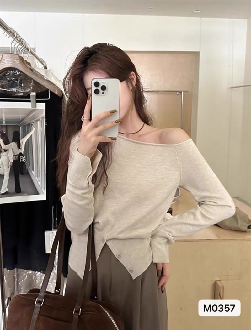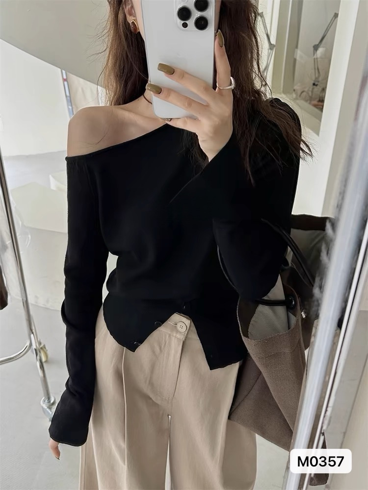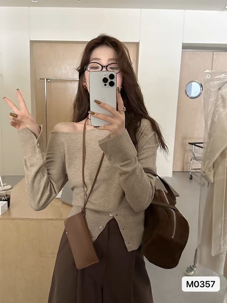 2024秋季新款甜美风修身显瘦斜肩开衩针织衫女宽松休闲百搭上衣潮