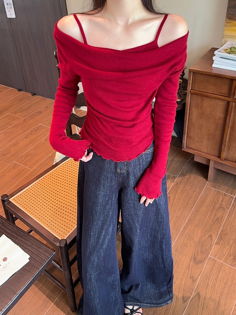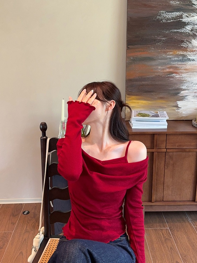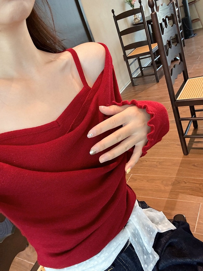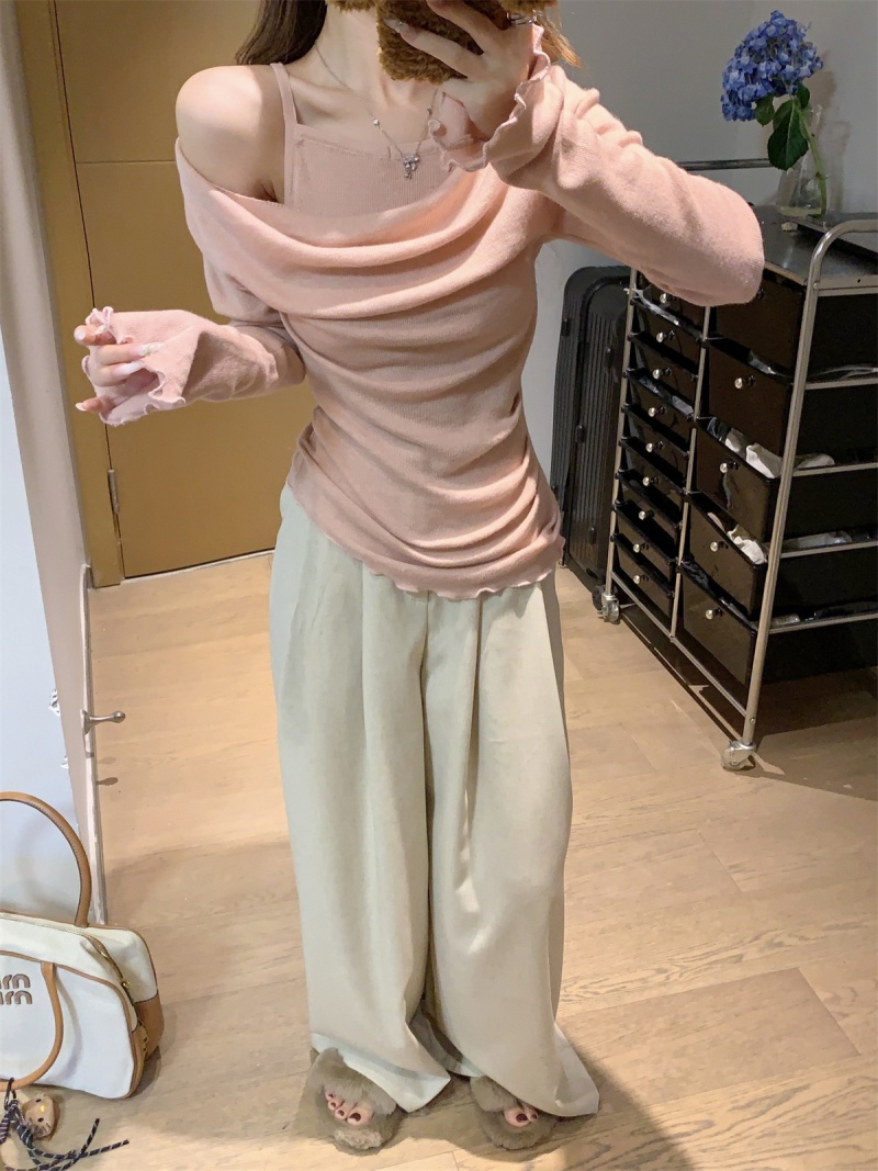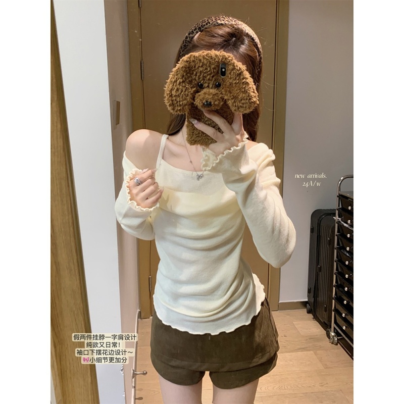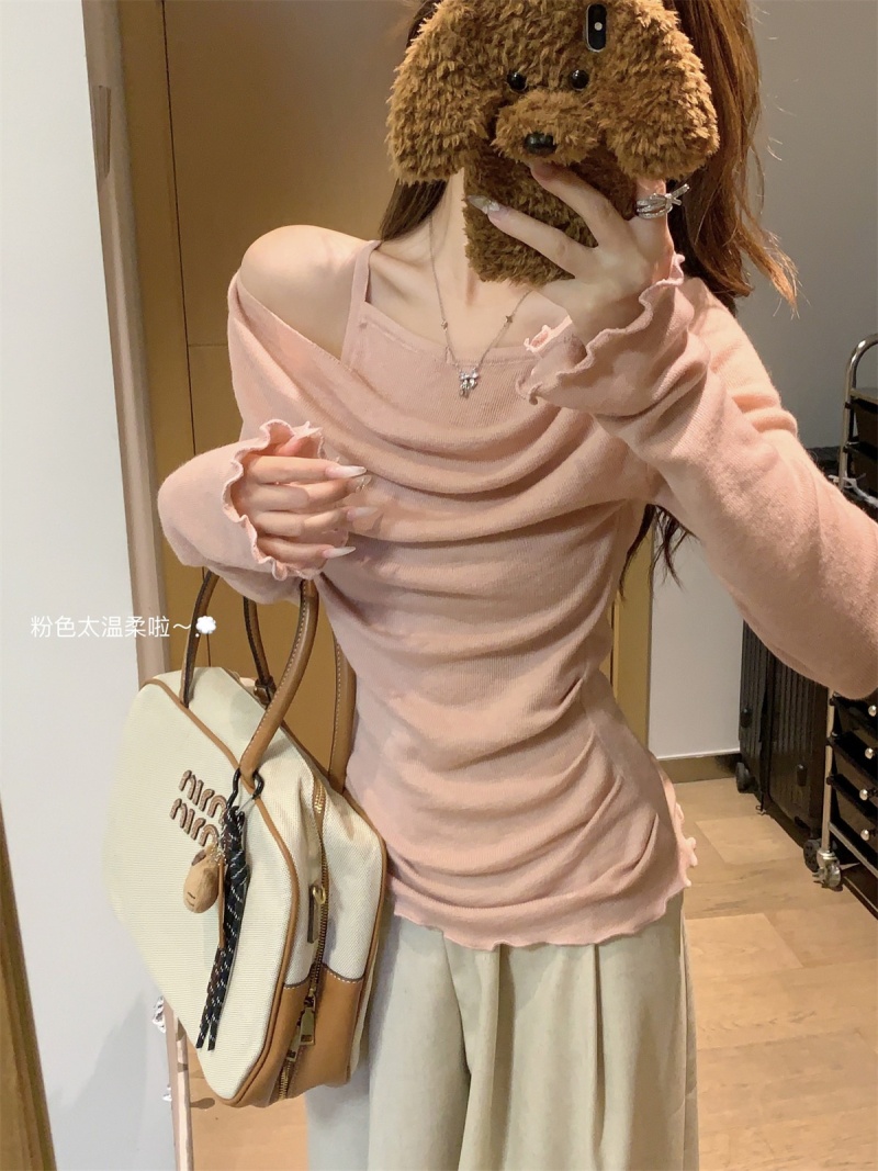 2024春秋季新款荡领木耳边假两件针织衫女修身显瘦长袖上衣打底衫
