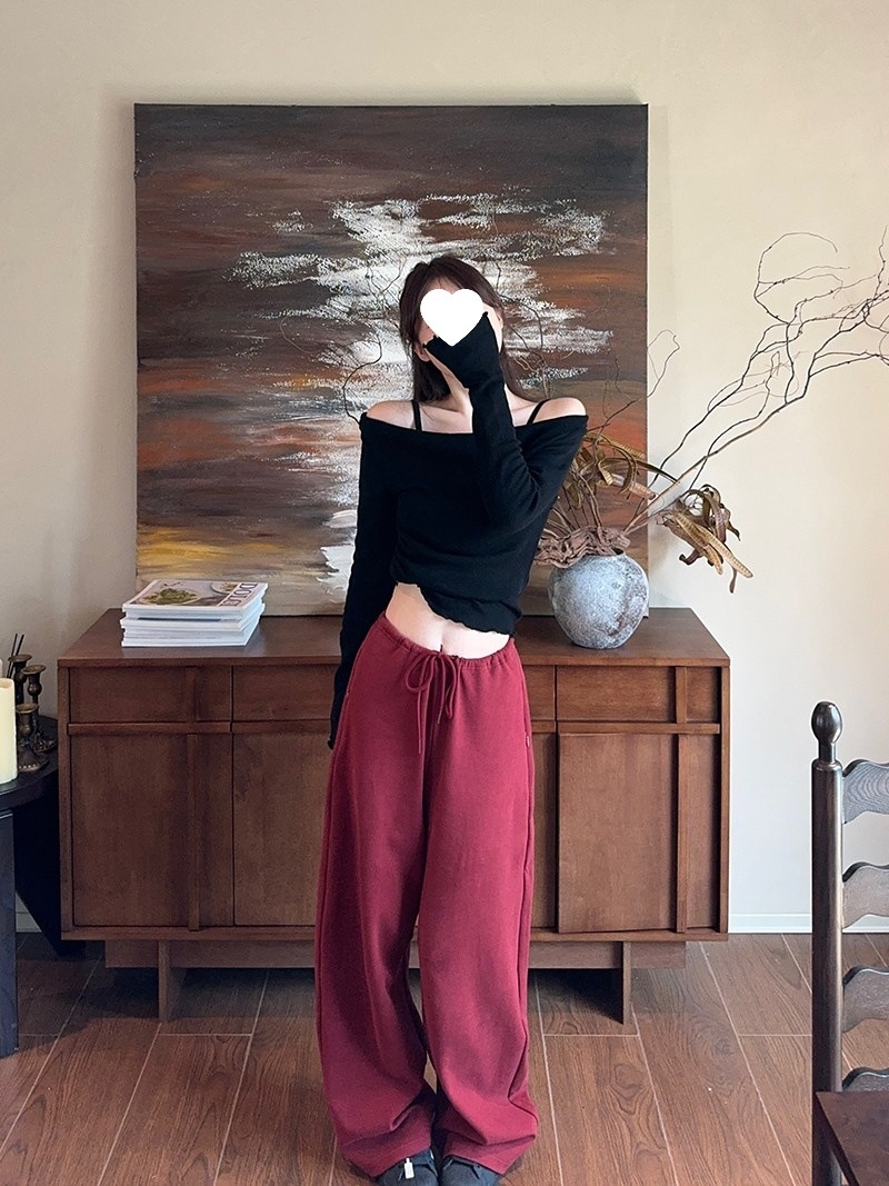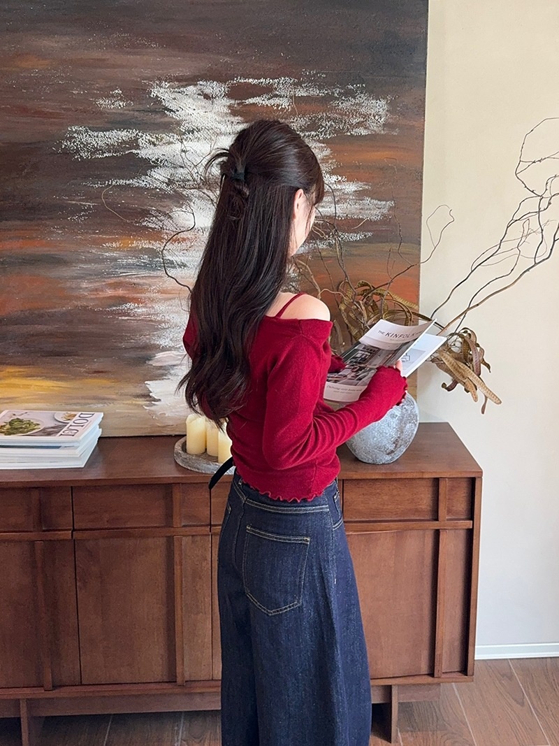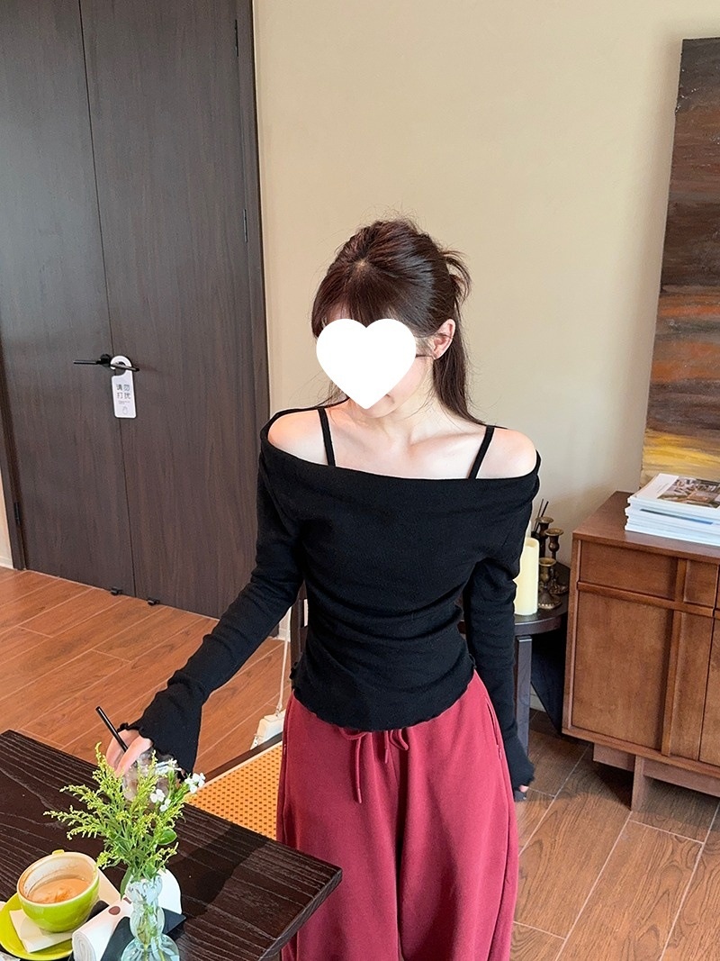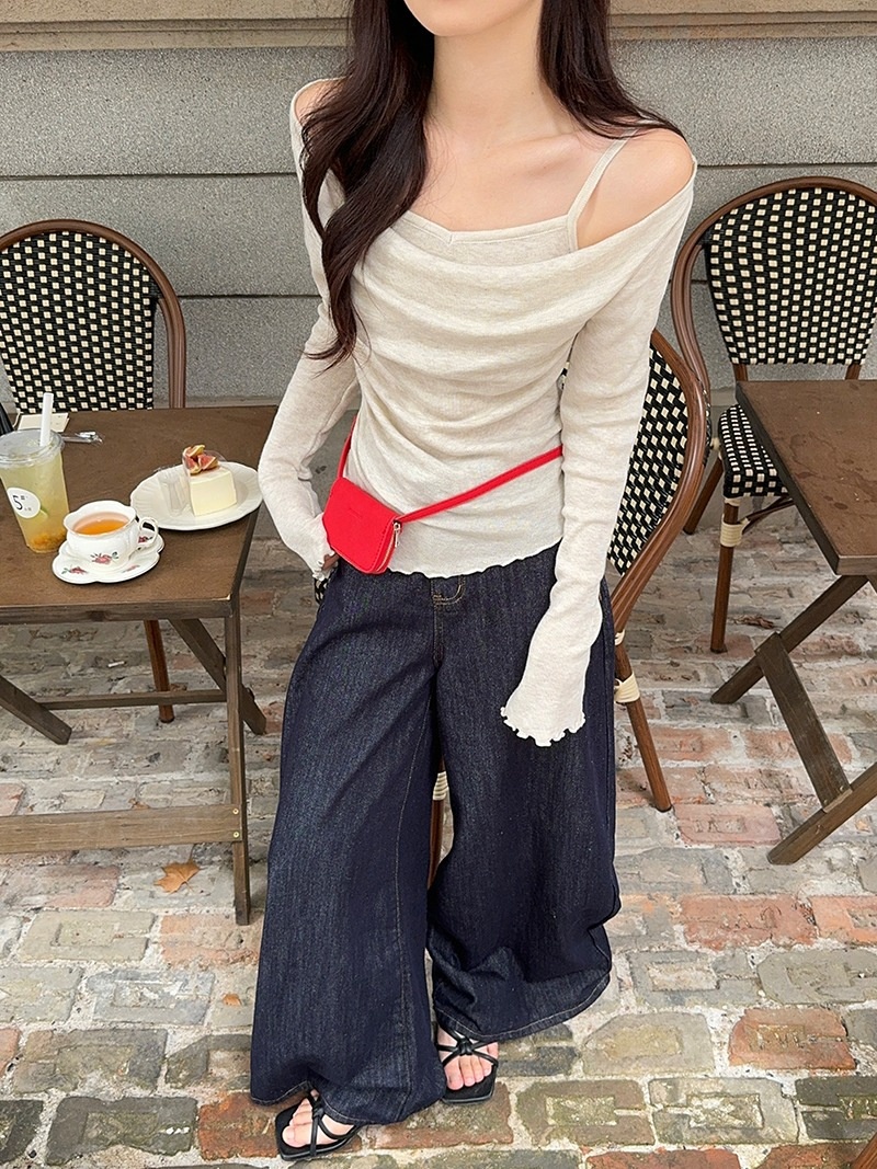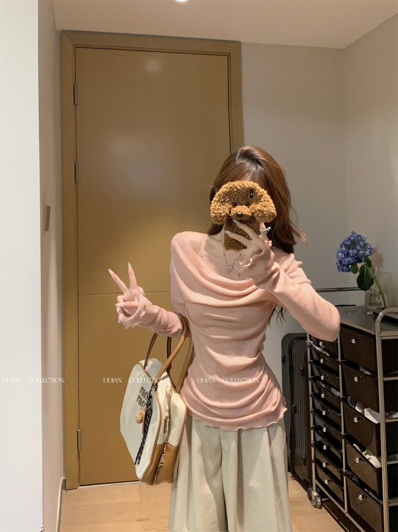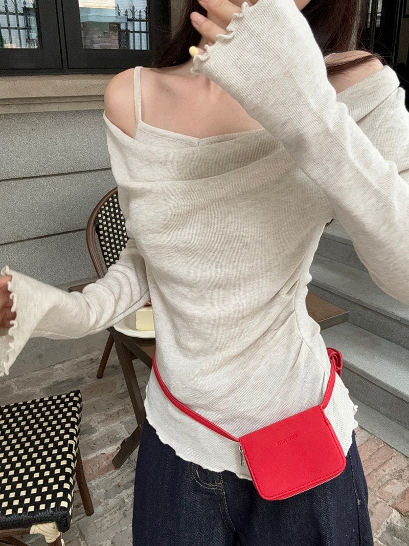 2024春秋季新款荡领木耳边假两件针织衫女修身显瘦长袖上衣打底衫