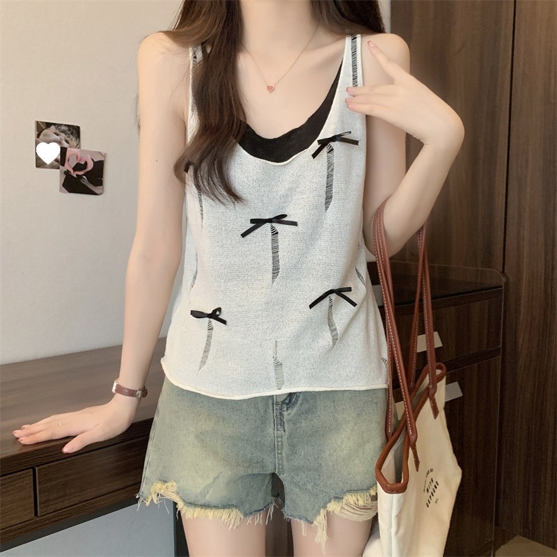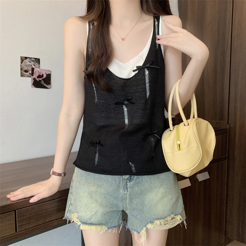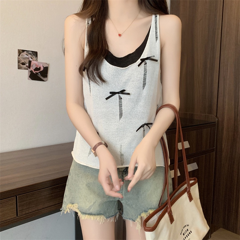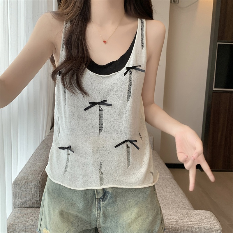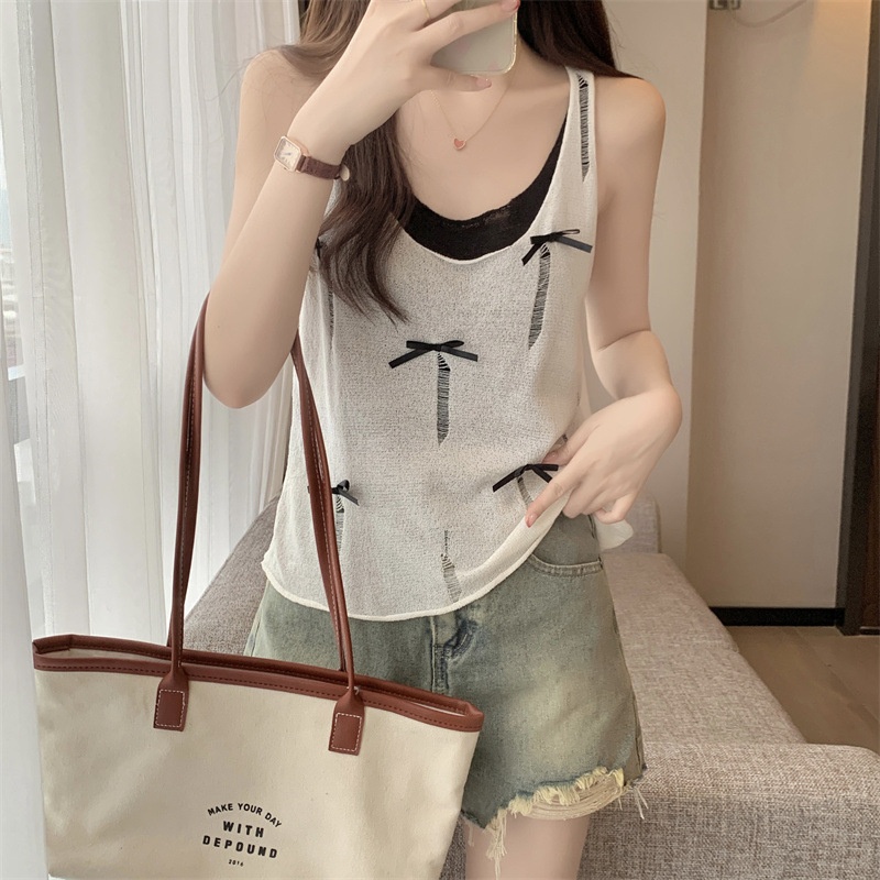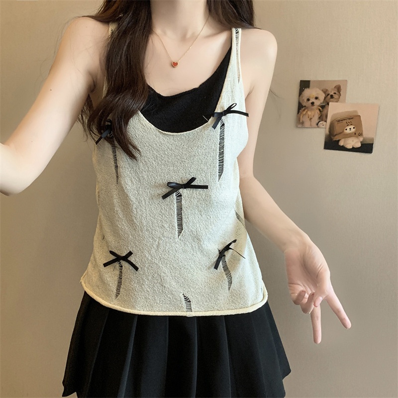 蝴蝶结镂空破洞假两件白色针织衫女装设计感小众卷边无袖短款上衣