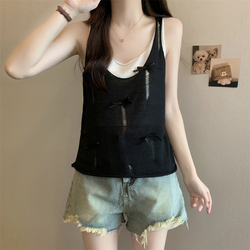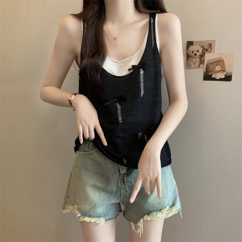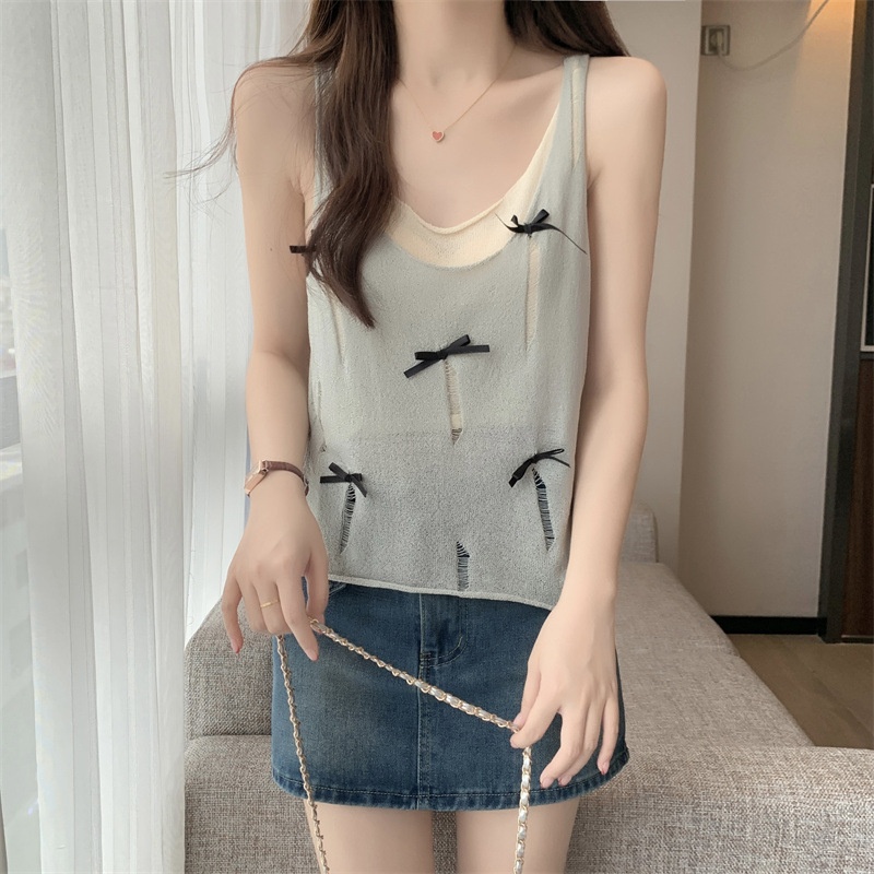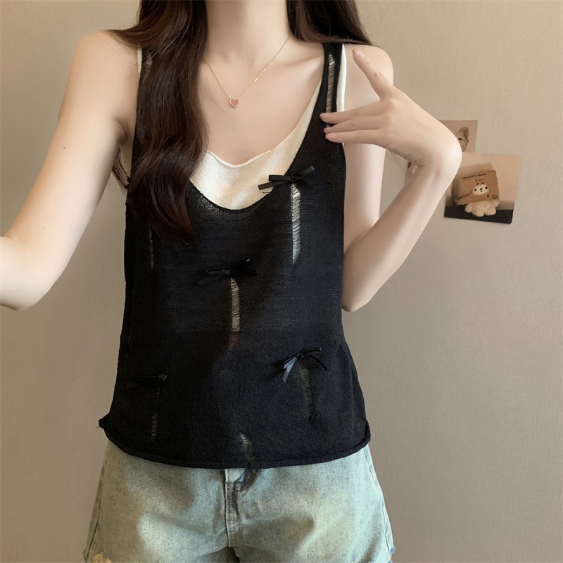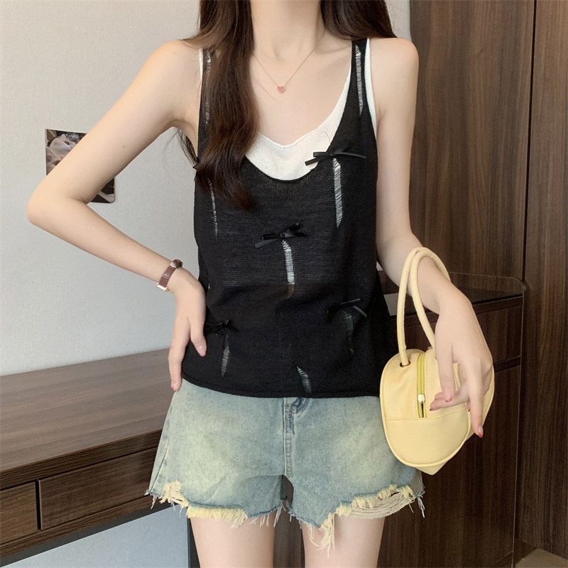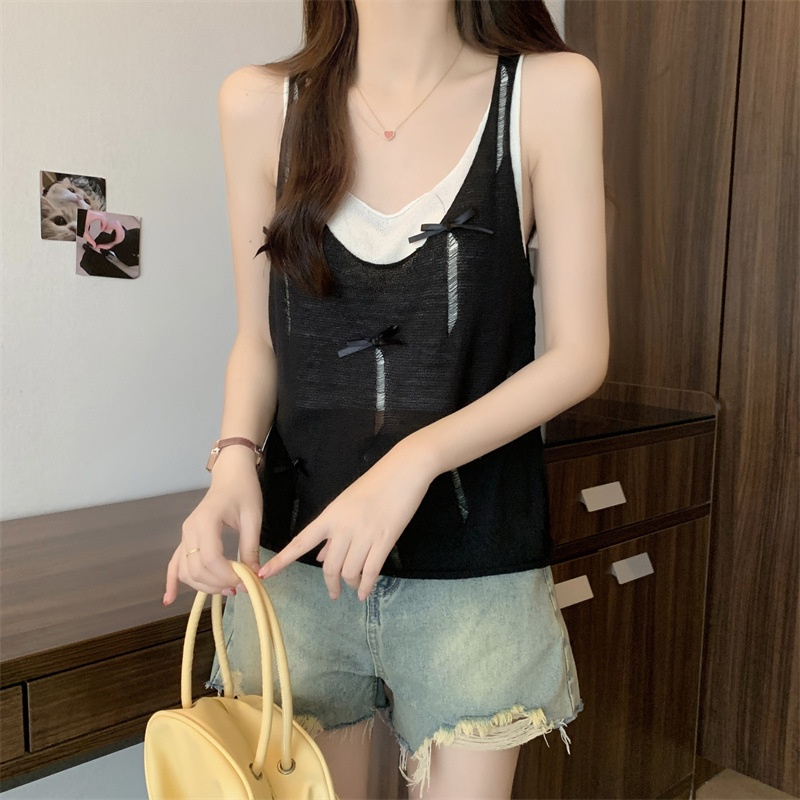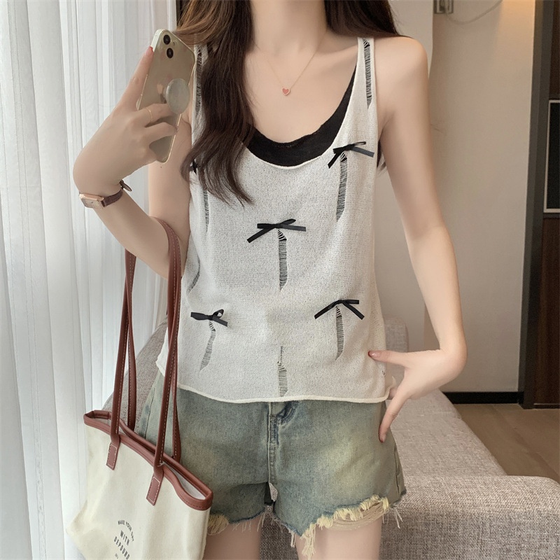 蝴蝶结镂空破洞假两件白色针织衫女装设计感小众卷边无袖短款上衣