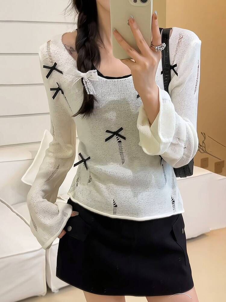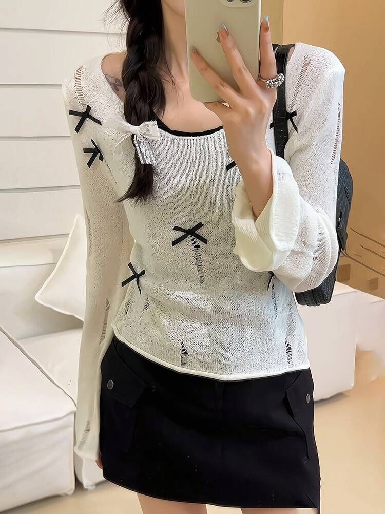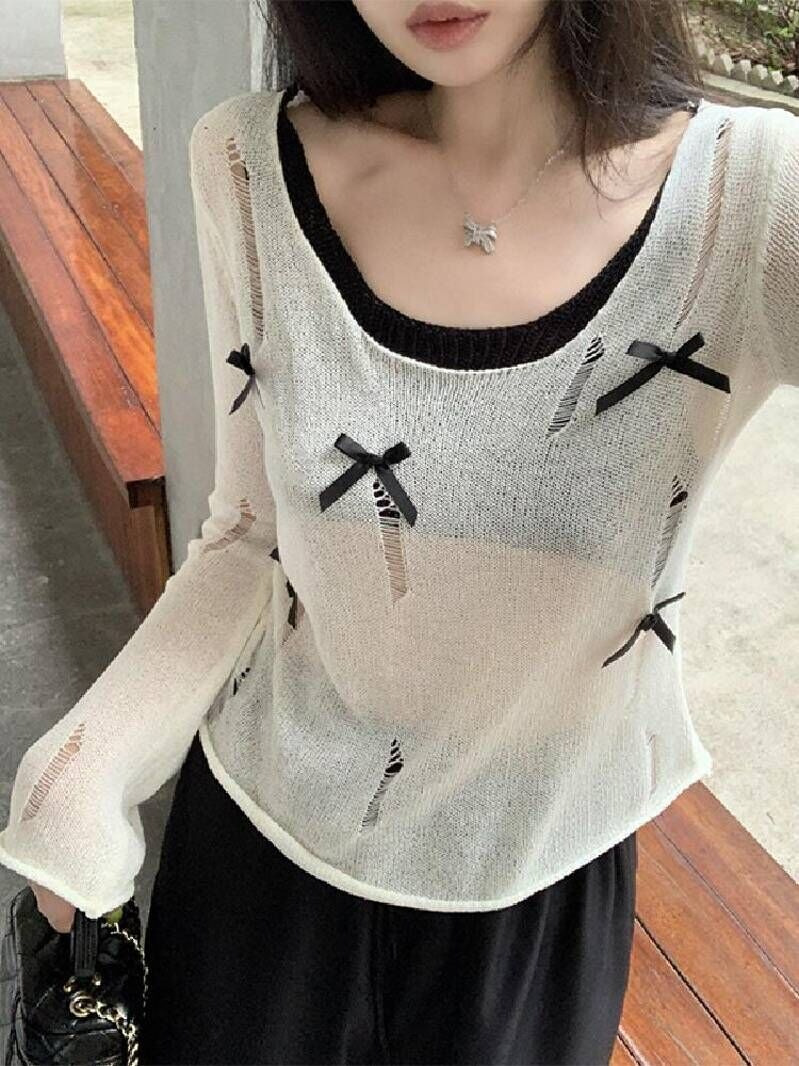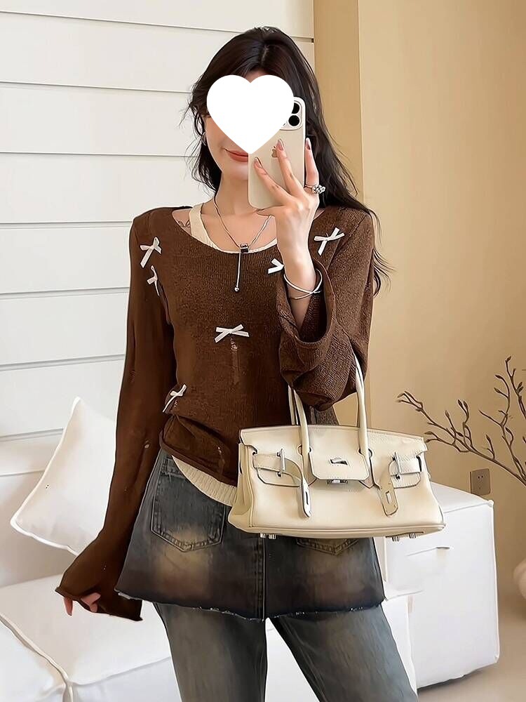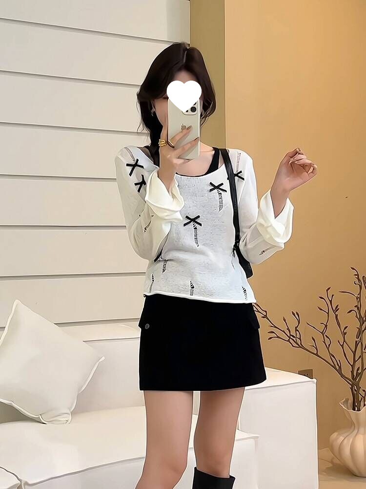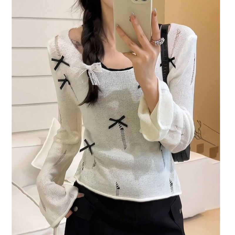 纯欲辣妹假两件破洞撞色针织修身蝴蝶结防晒上衣2024秋季新款小衫