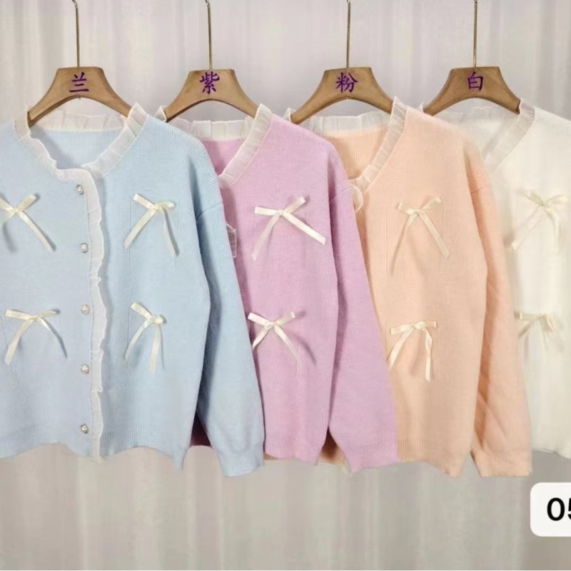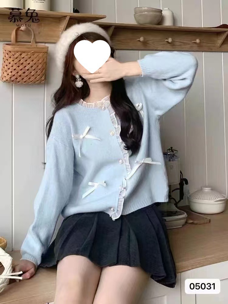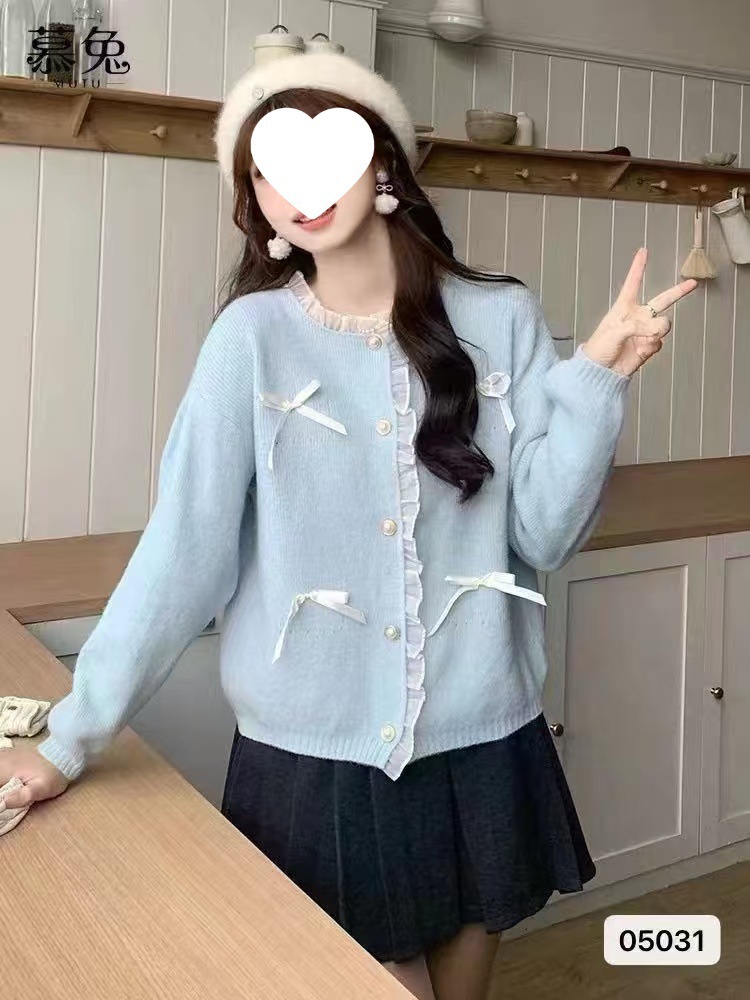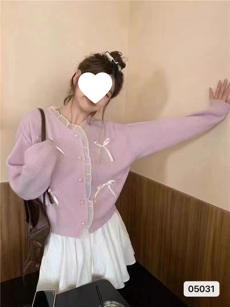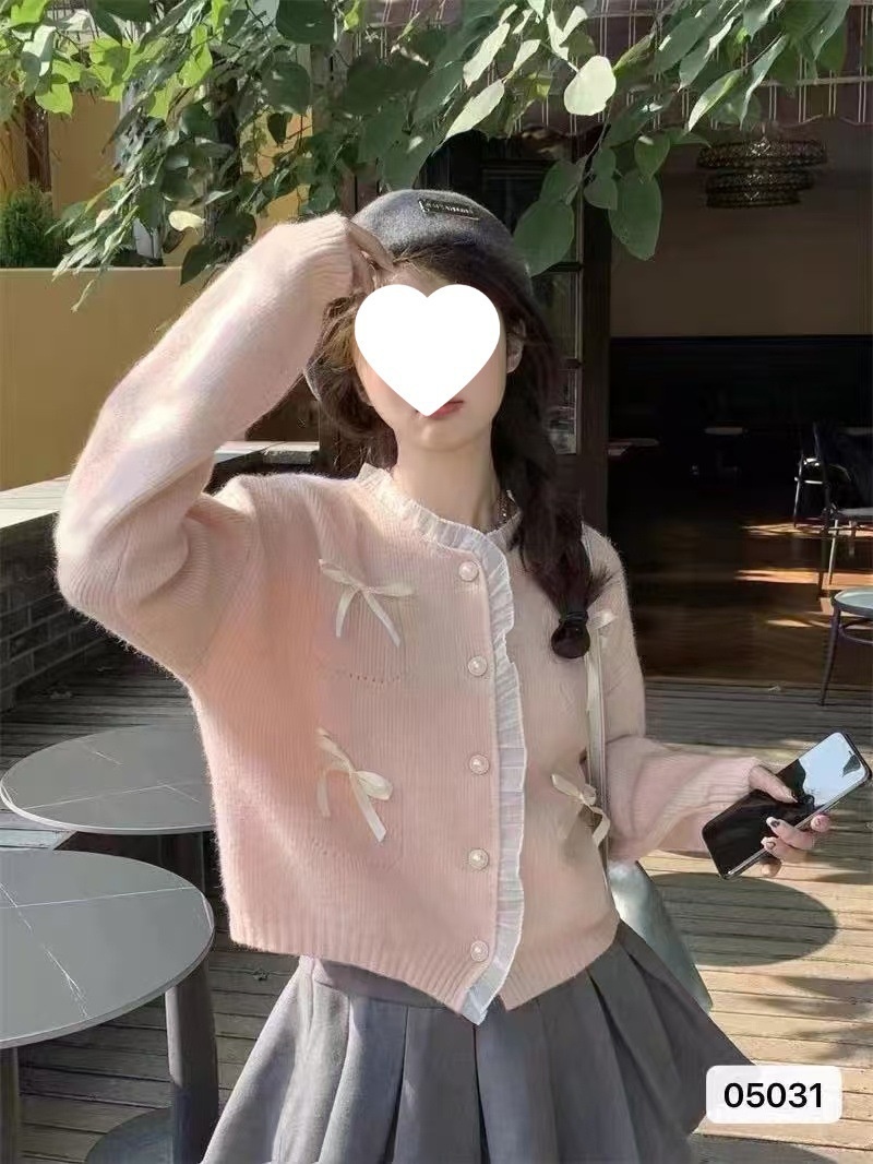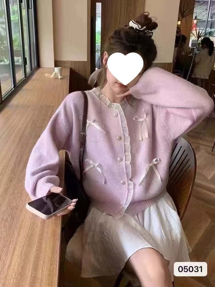 2024秋冬新款韩系甜美少女清新显瘦花边拼接蝴蝶结长袖短款外套女