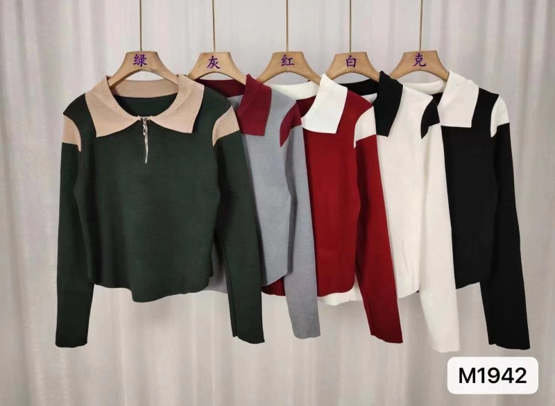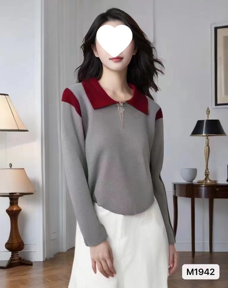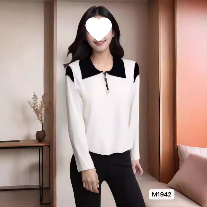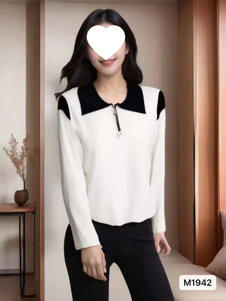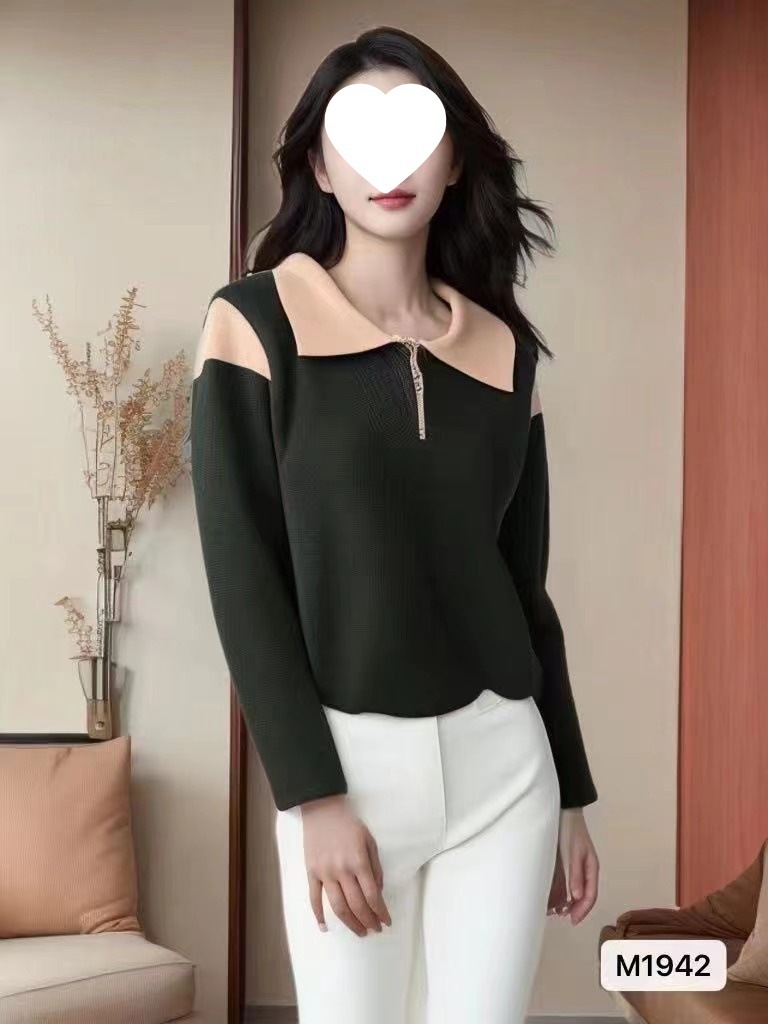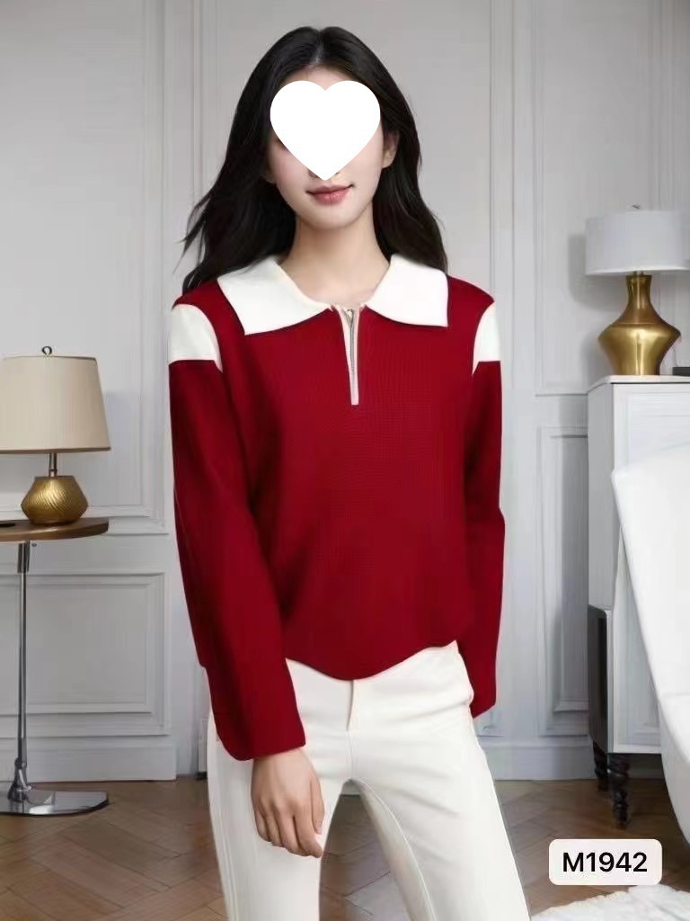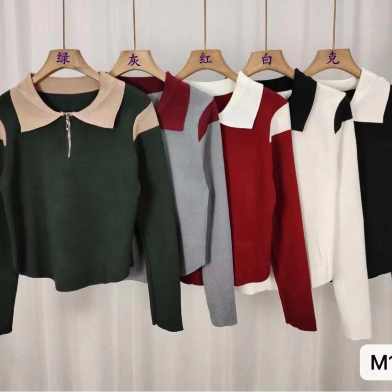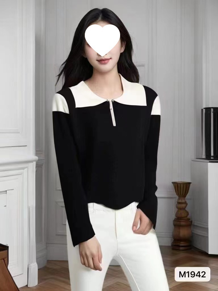 2024秋冬新款韩版百搭显瘦时尚翻领拉链半开胸拼色长袖短款上衣女