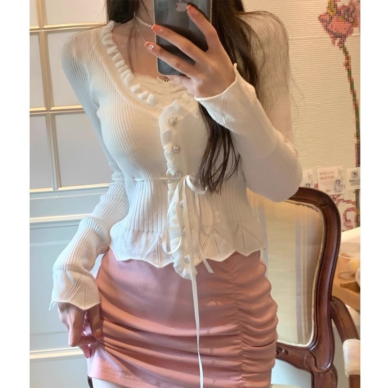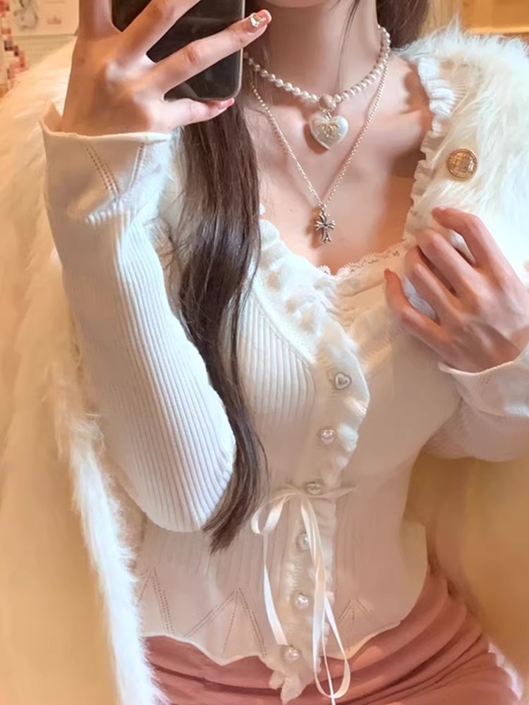 早春装纯欲假两件粉色v领针织开衫女木耳边修身内搭收腰短款上衣