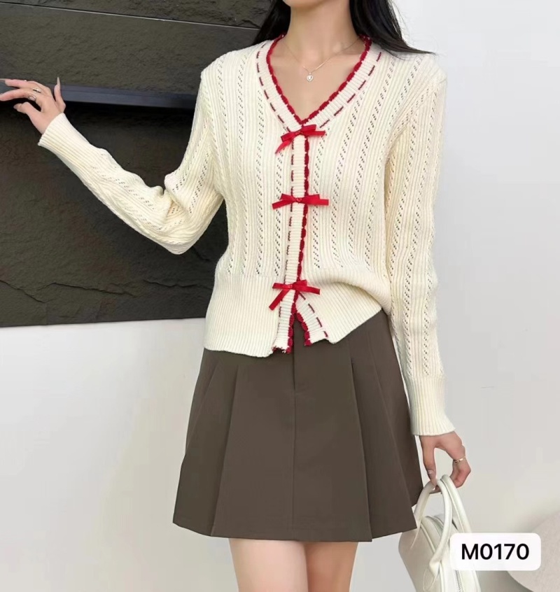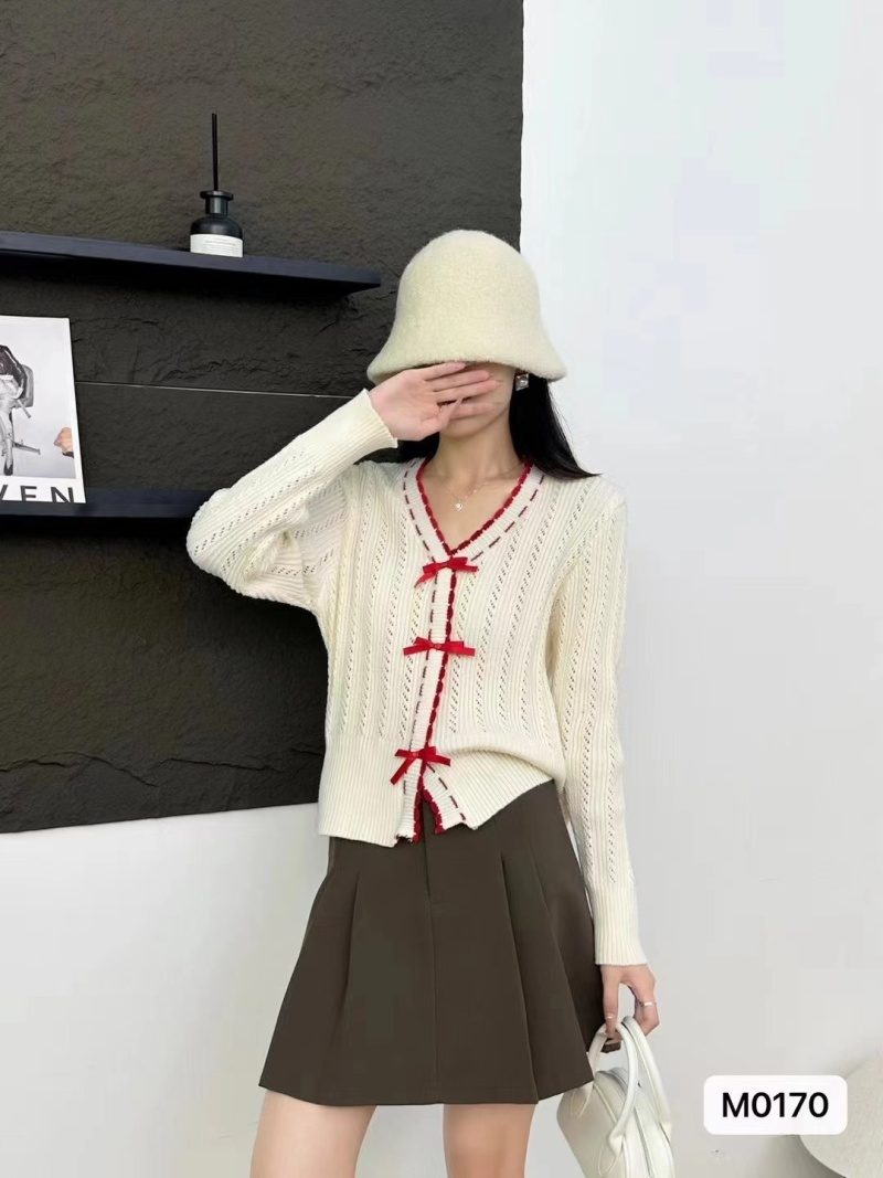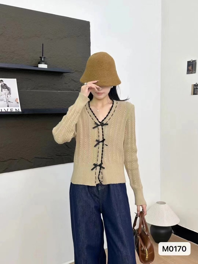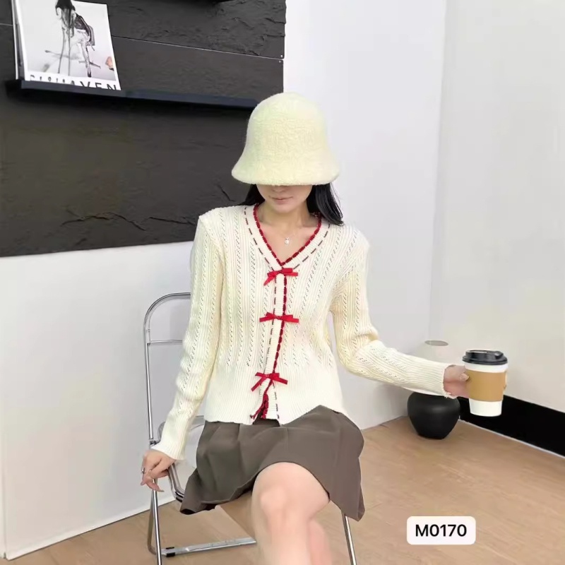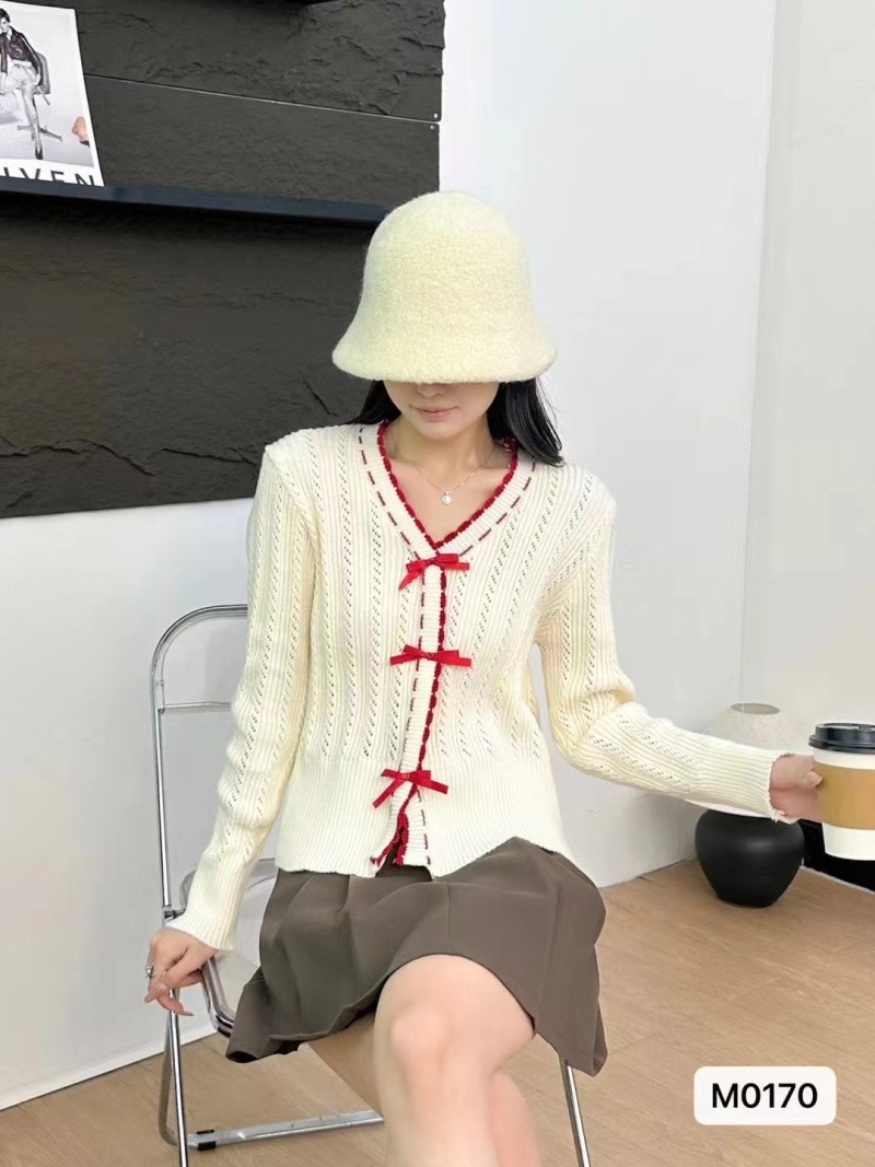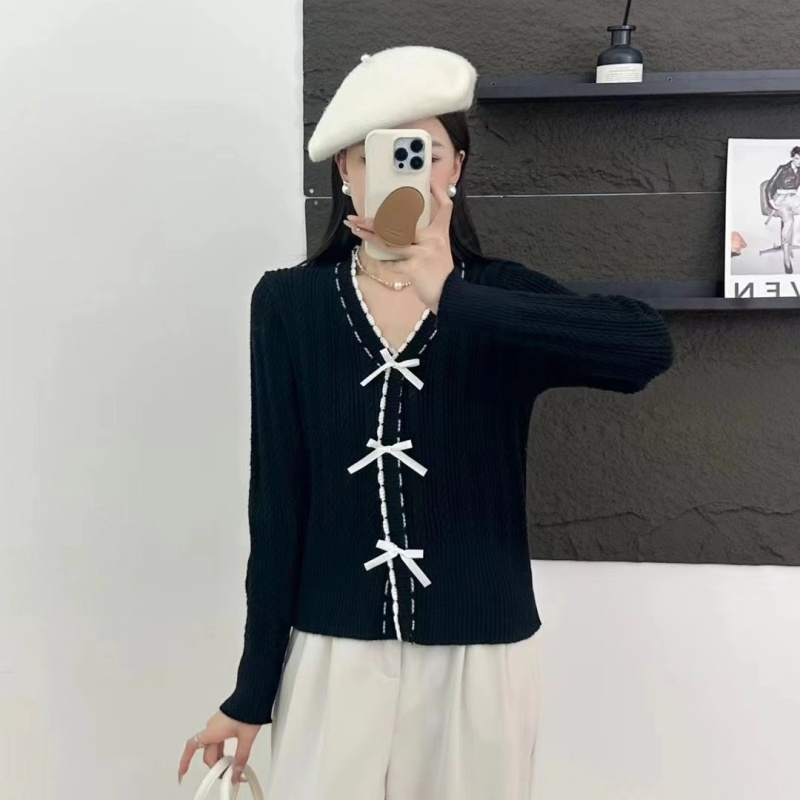 2024年春秋季新款女短款蝴蝶结毛衣外套v领镂空针织开衫百搭上衣