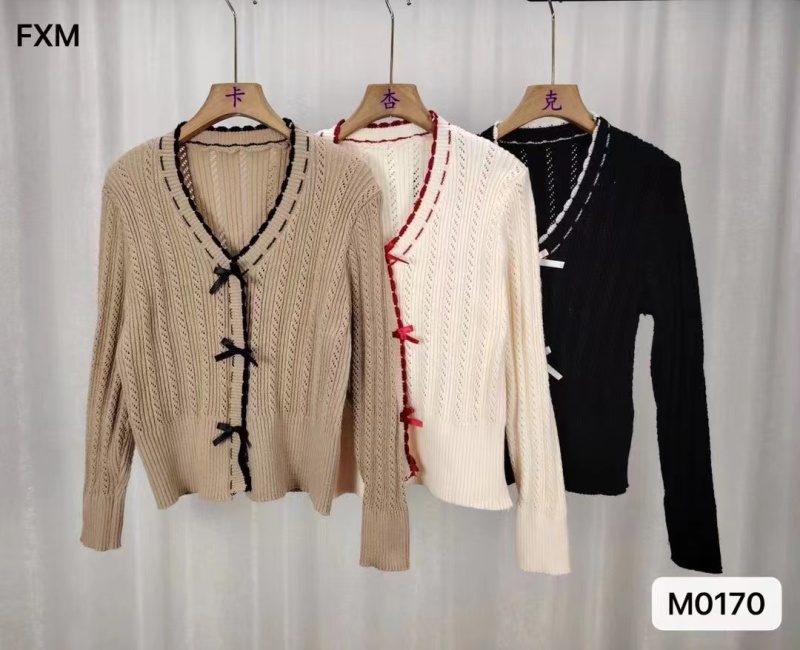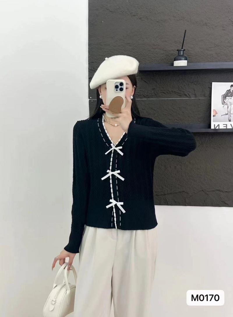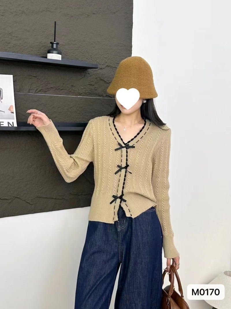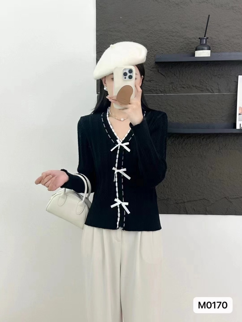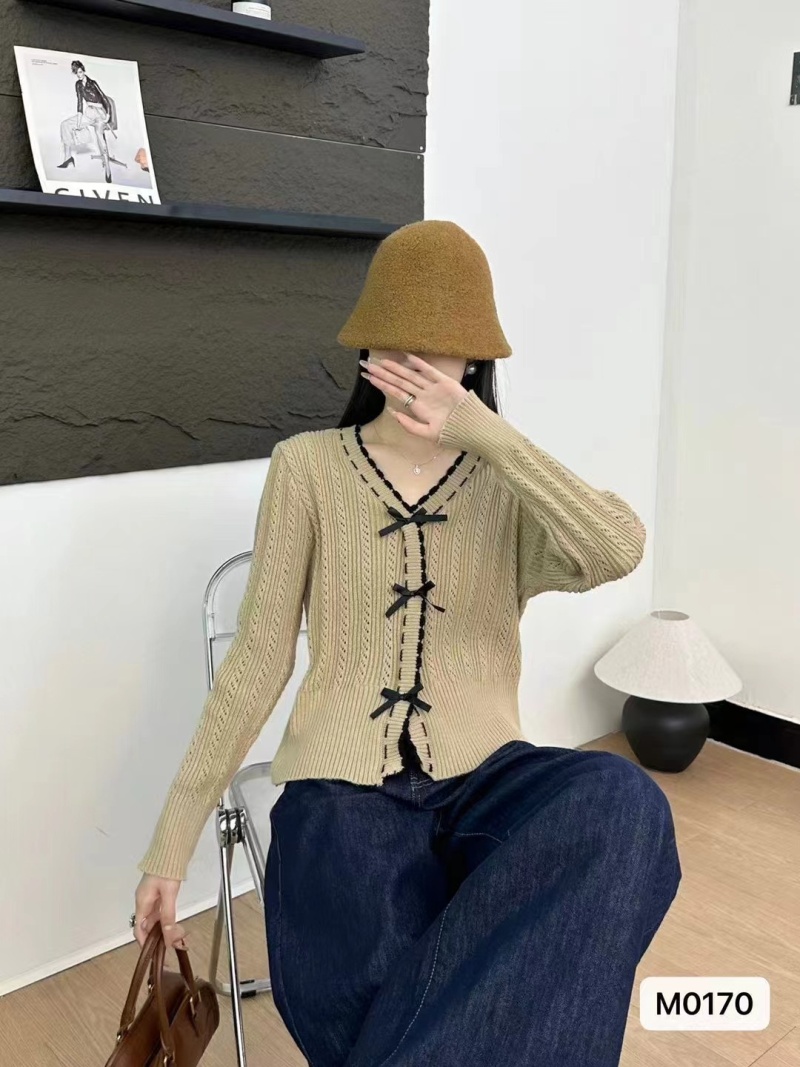 2024年春秋季新款女短款蝴蝶结毛衣外套v领镂空针织开衫百搭上衣