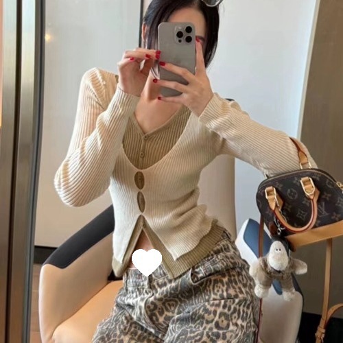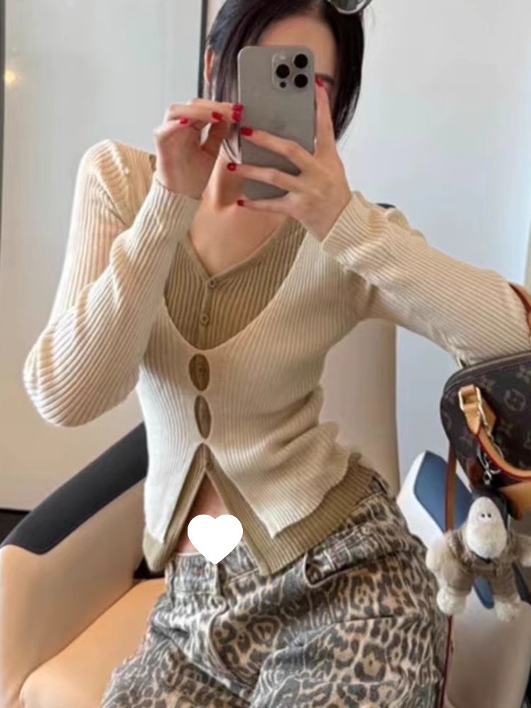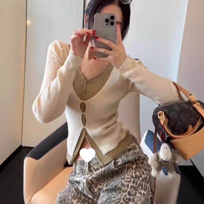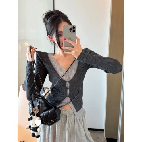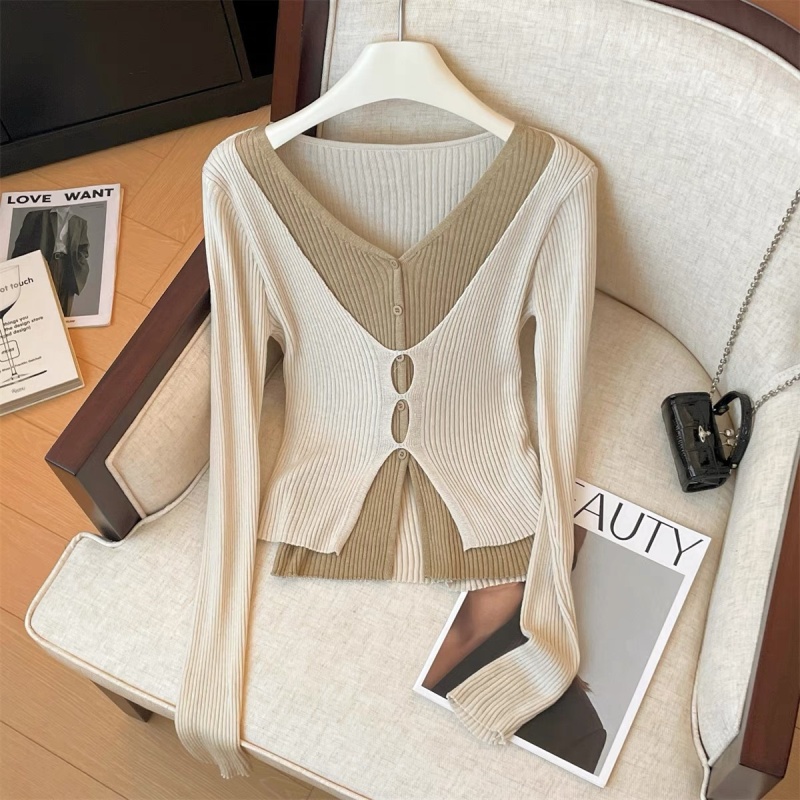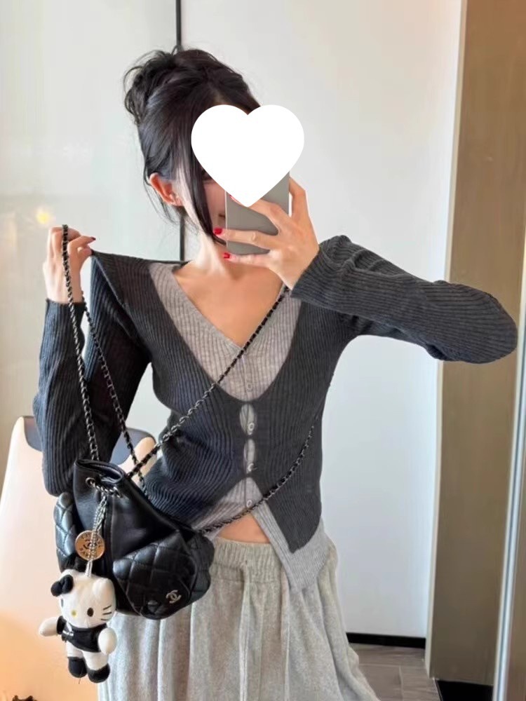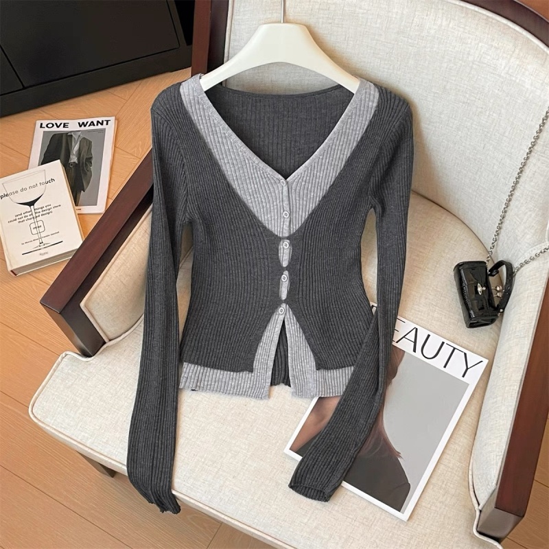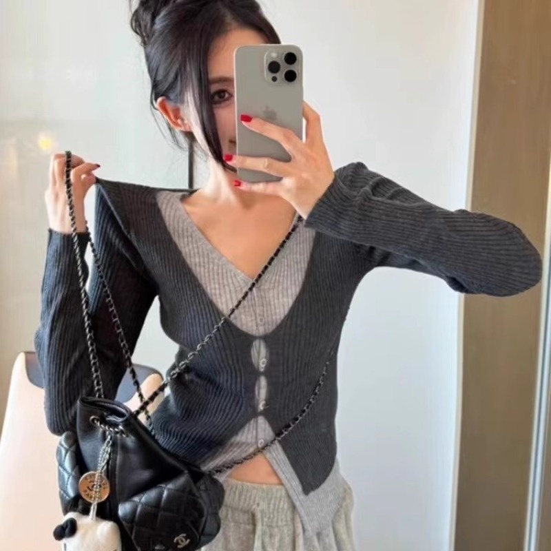 2024韩系穿搭V领撞色假两件灰色针织秋季女设计感长袖短款上衣潮