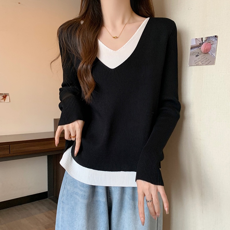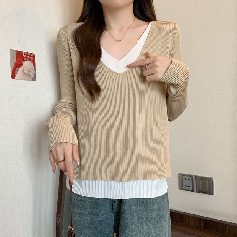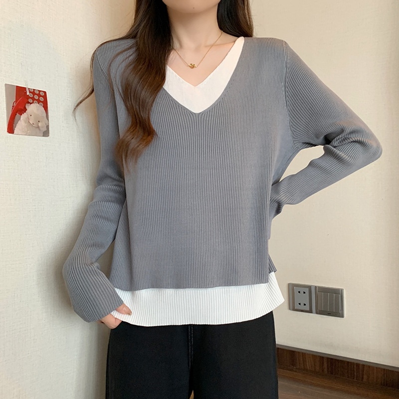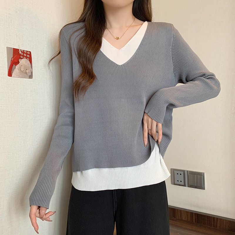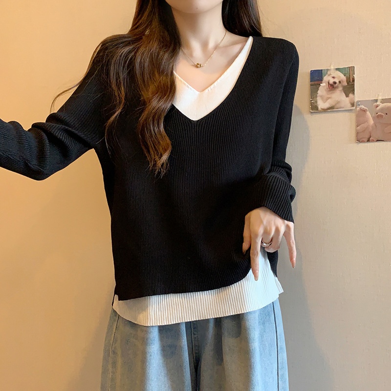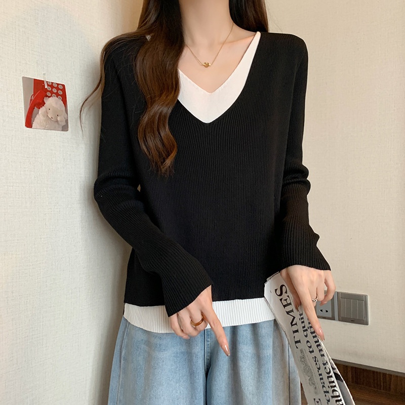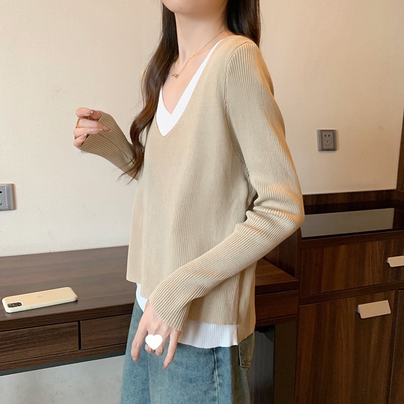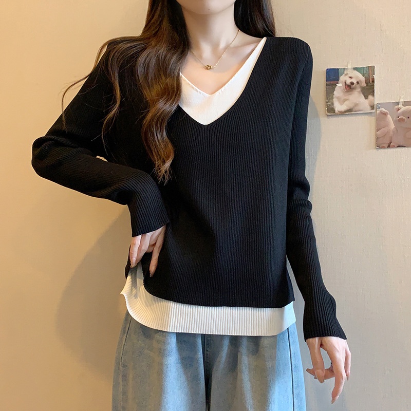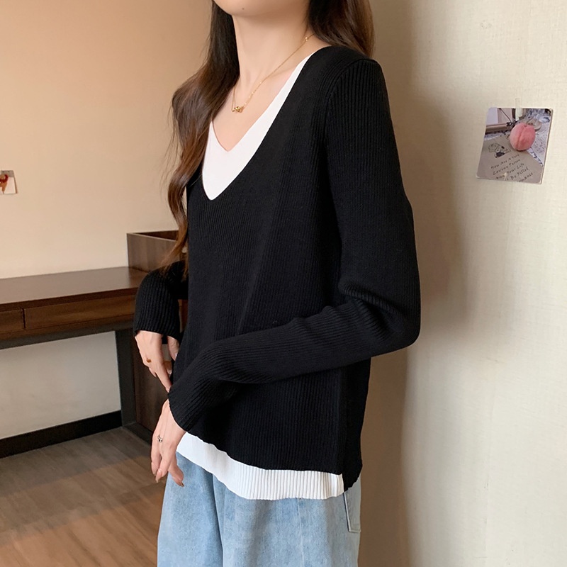 早秋新款外穿韩系设计感v领假两件针织衫女慵懒风长袖T恤打底上衣