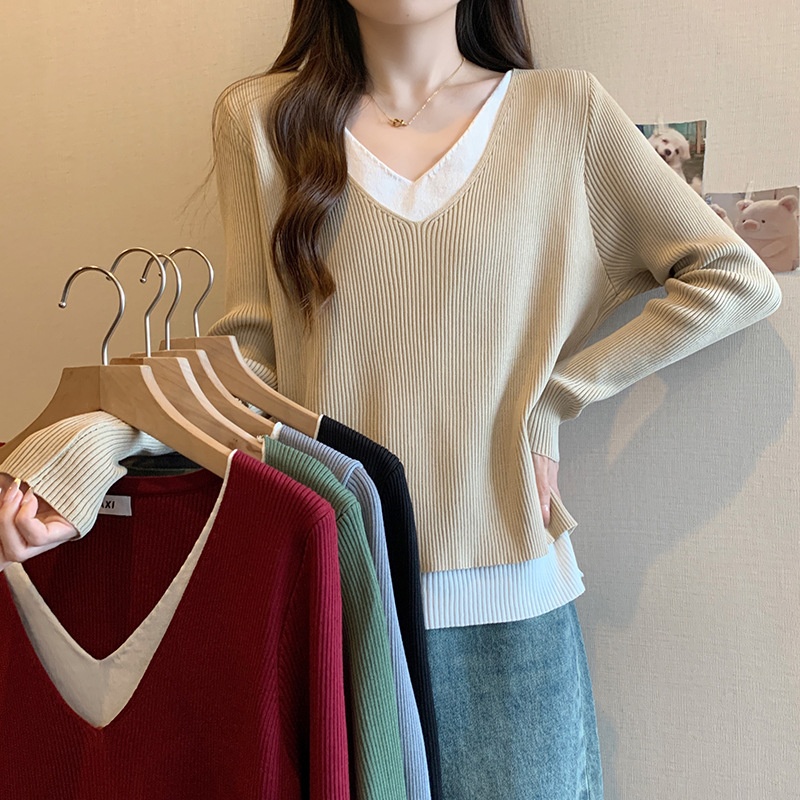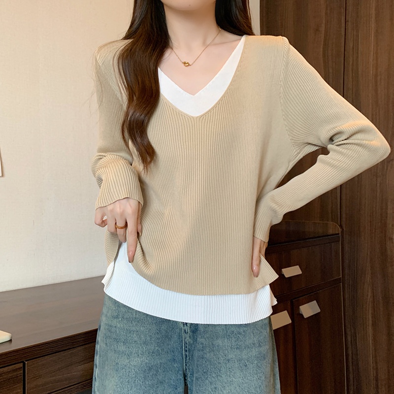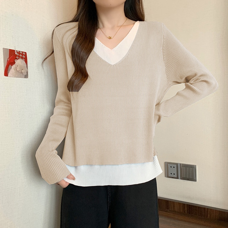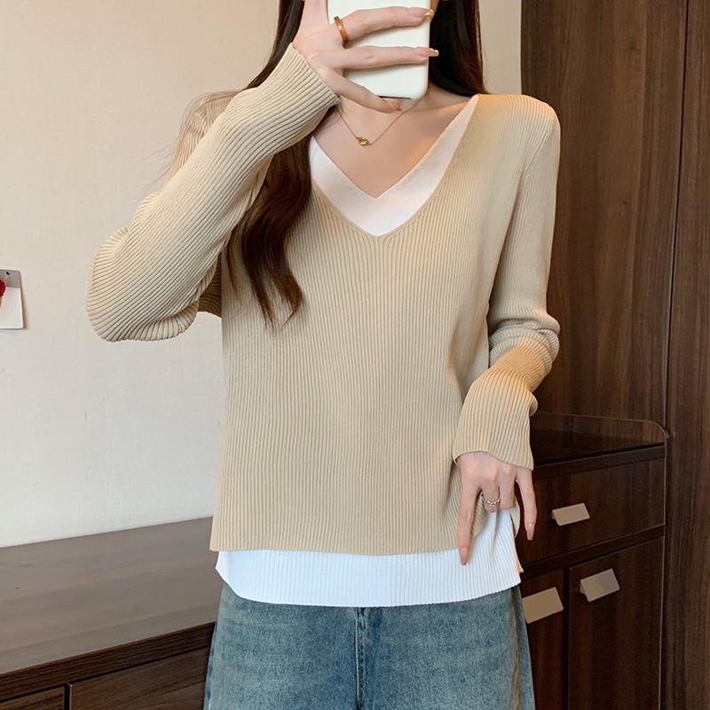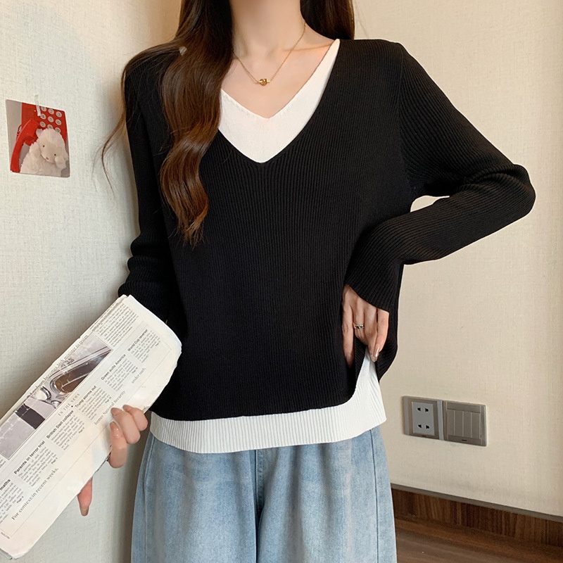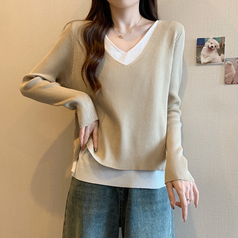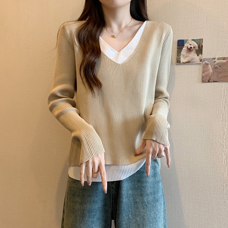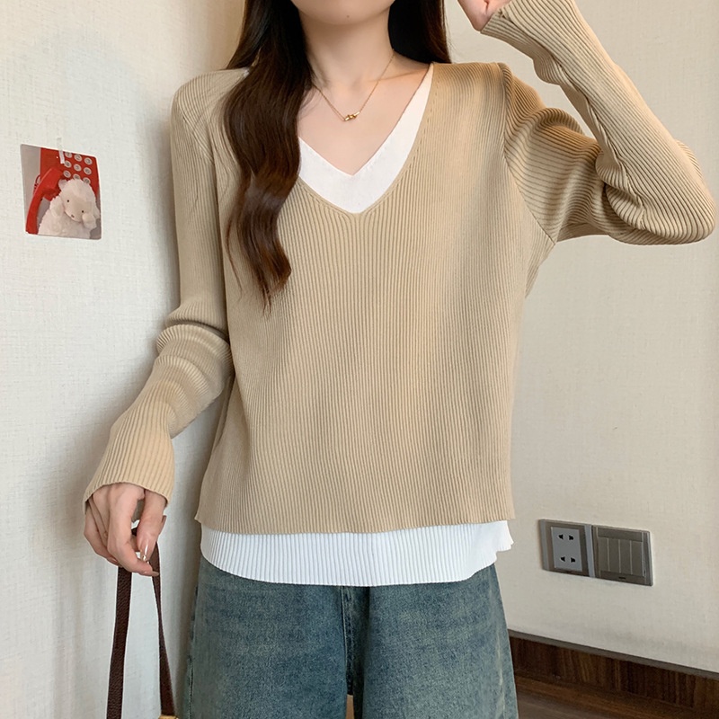 早秋新款外穿韩系设计感v领假两件针织衫女慵懒风长袖T恤打底上衣