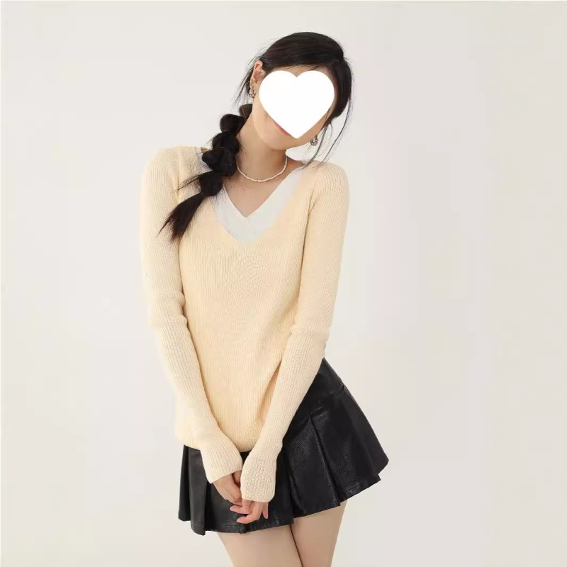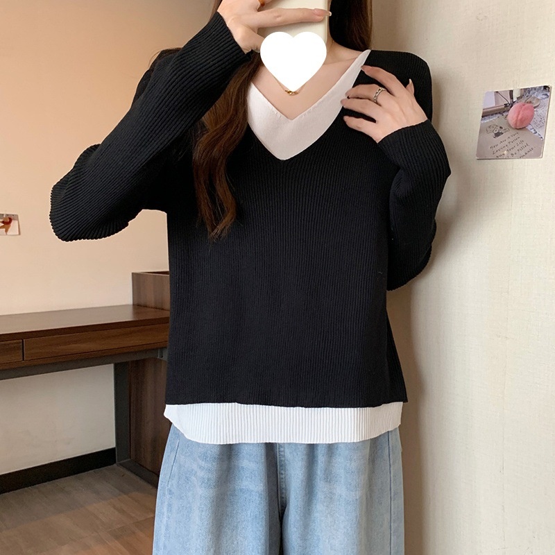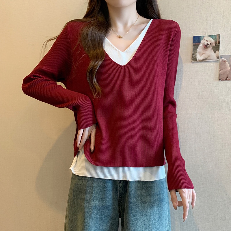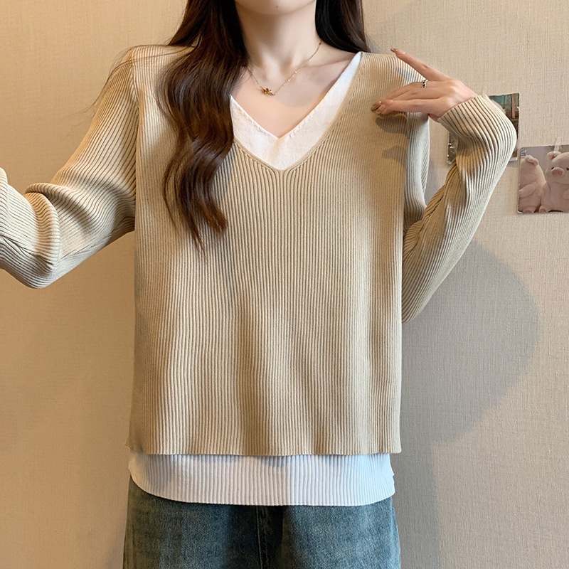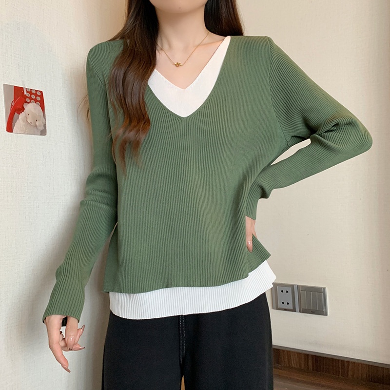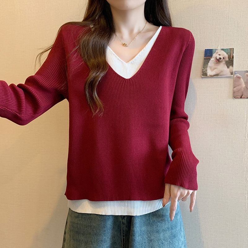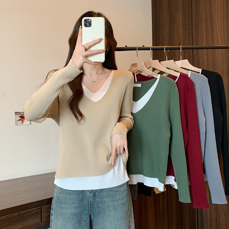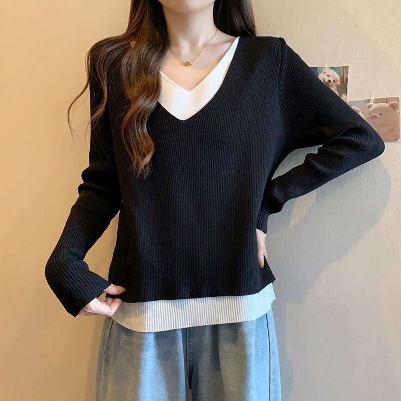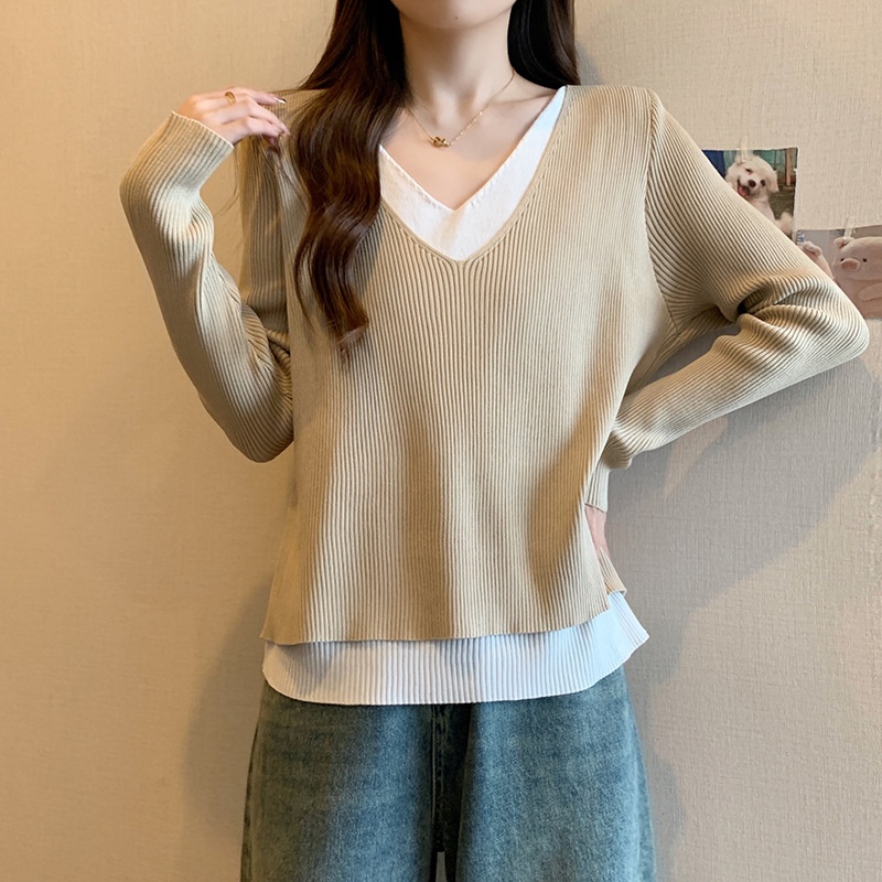 早秋新款外穿韩系设计感v领假两件针织衫女慵懒风长袖T恤打底上衣