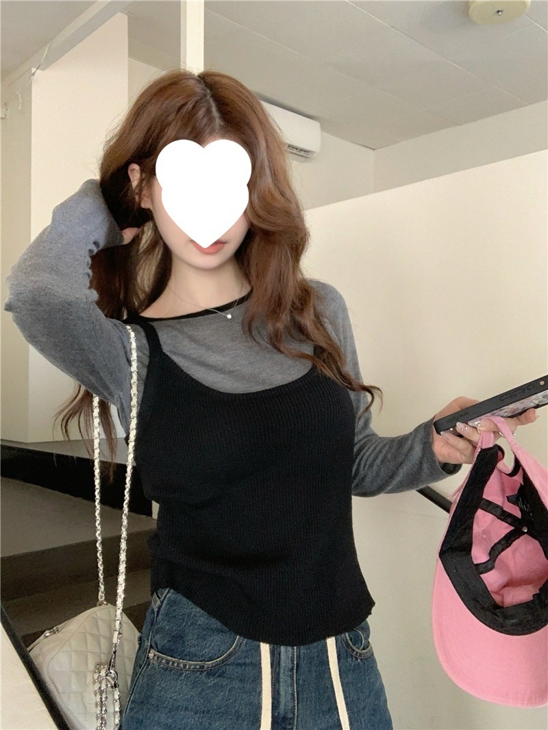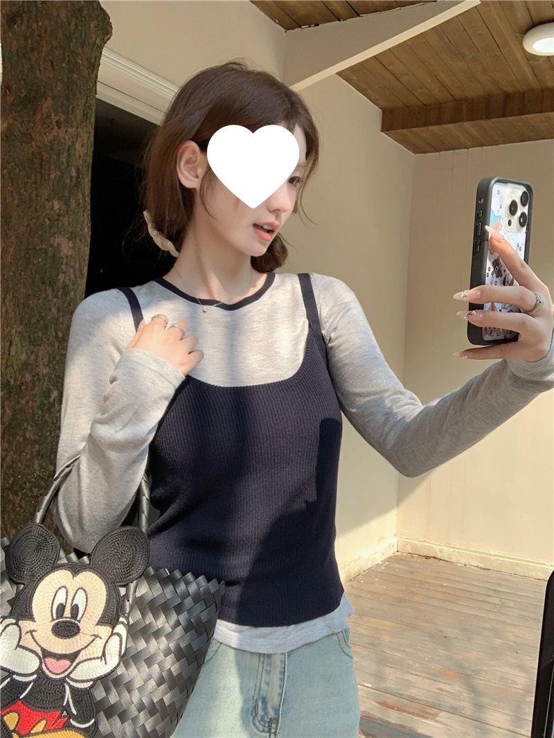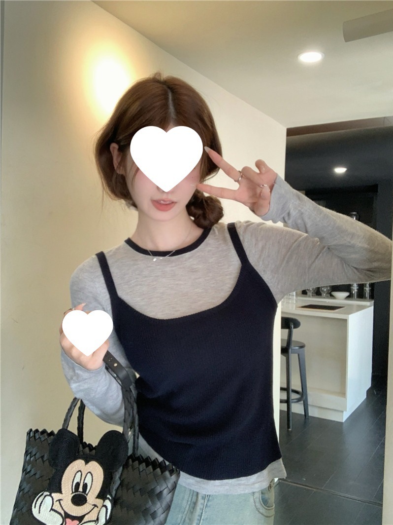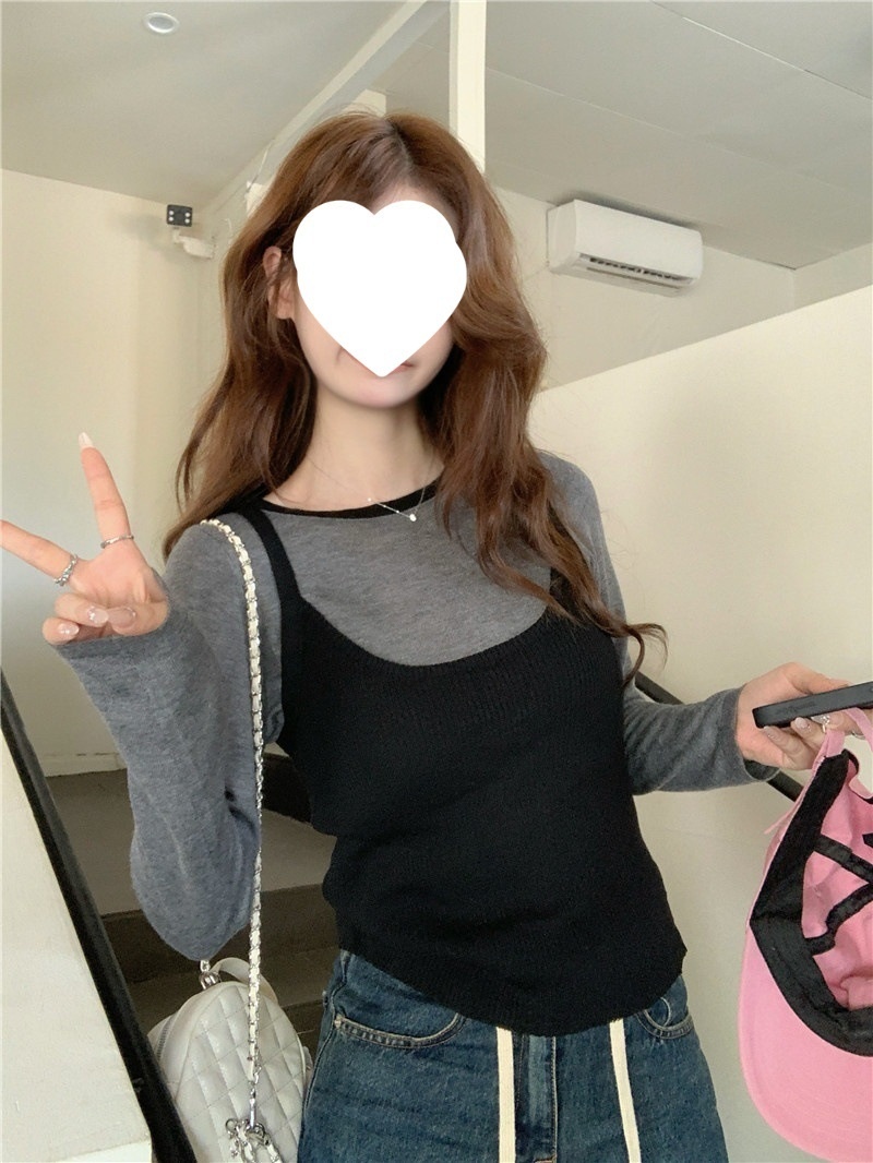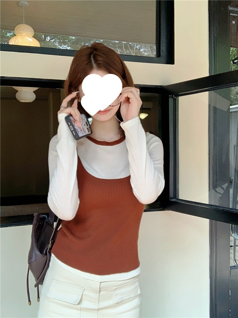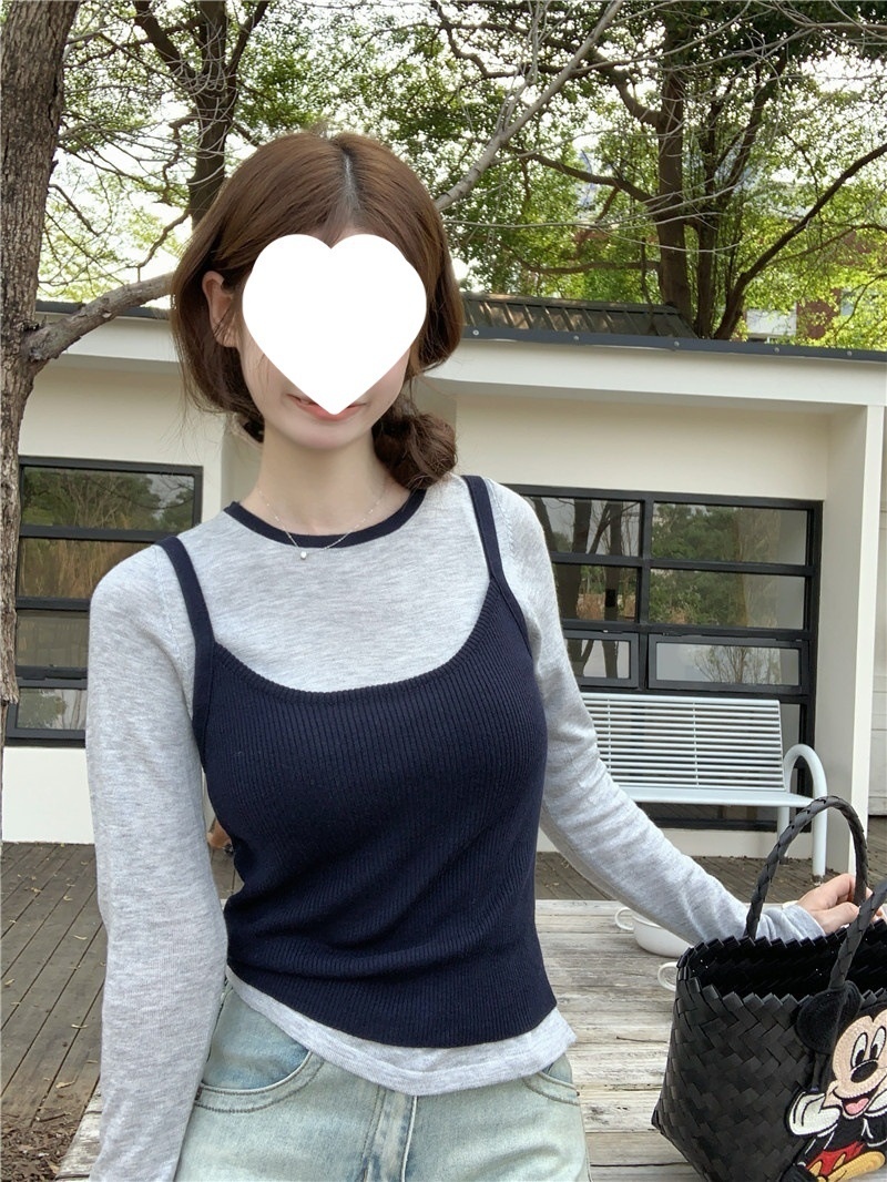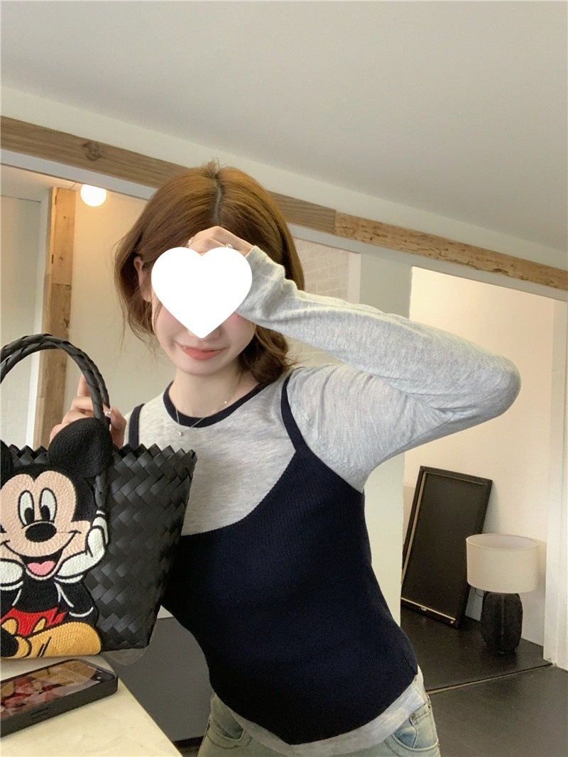 2024夏季新款韩版早秋薄款长袖修身针织撞色圆领打底针织短款上衣