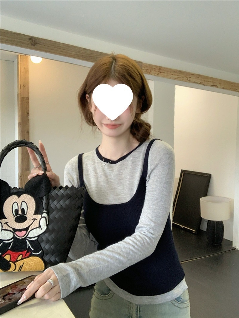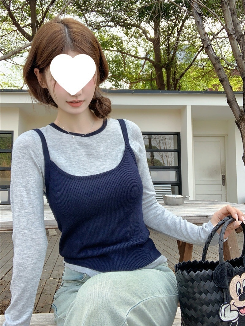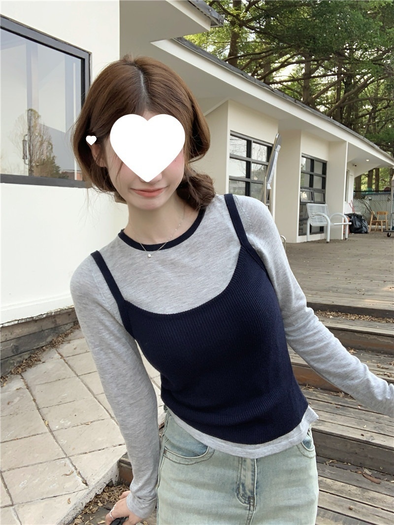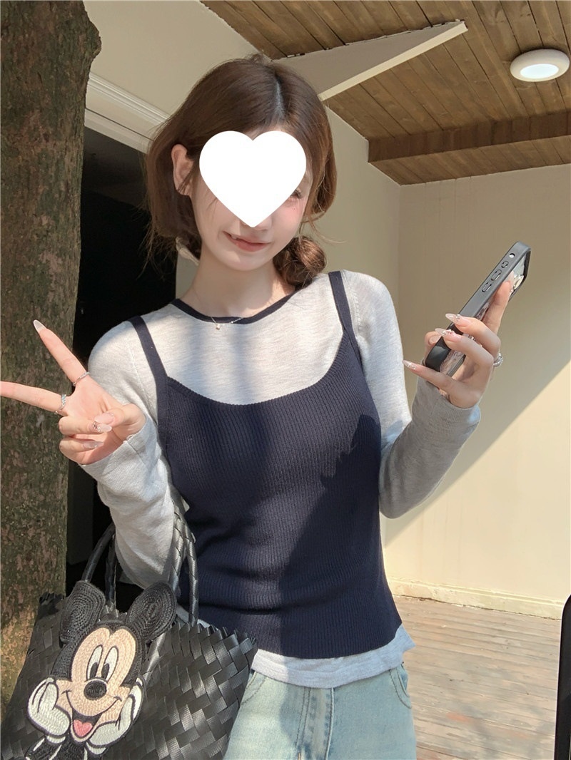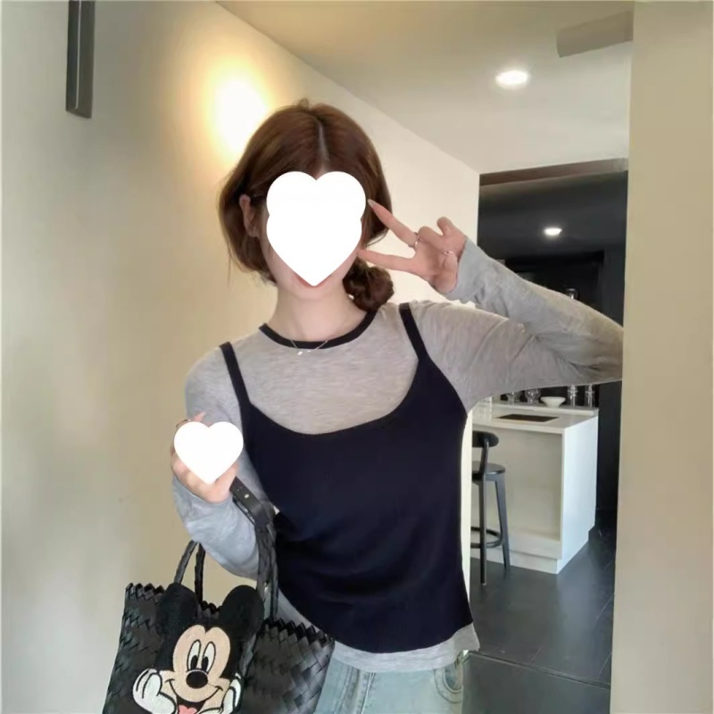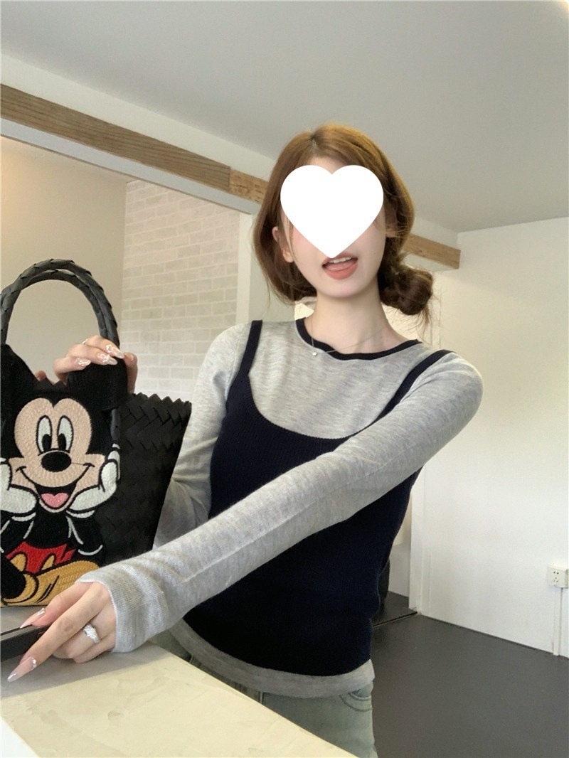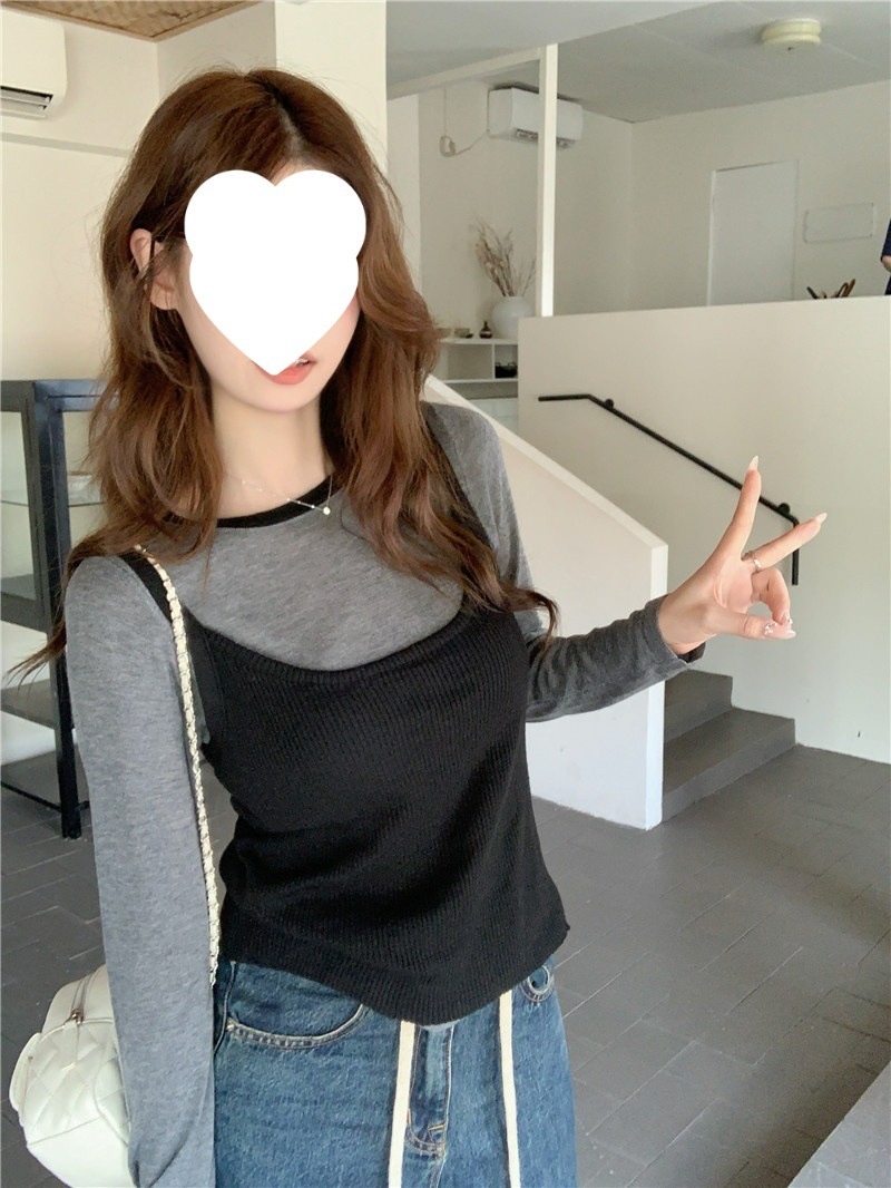 2024夏季新款韩版早秋薄款长袖修身针织撞色圆领打底针织短款上衣