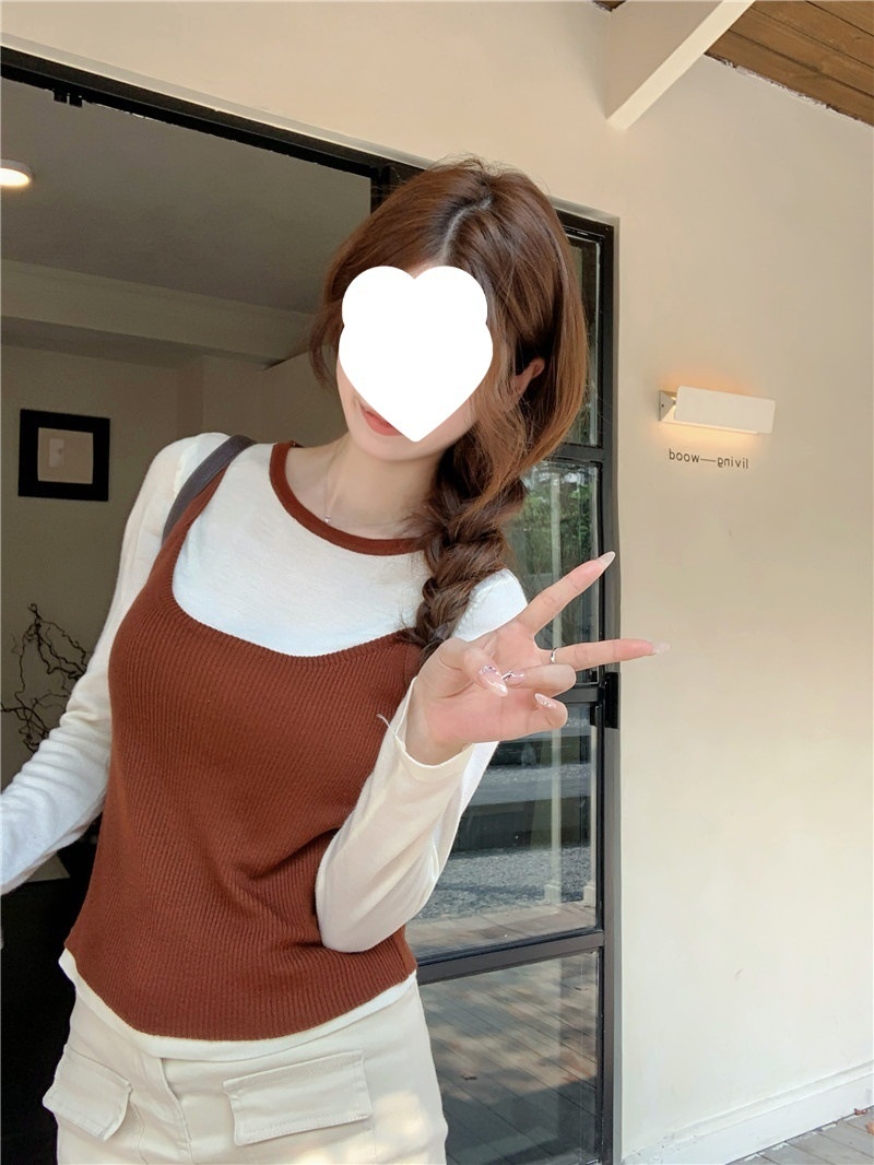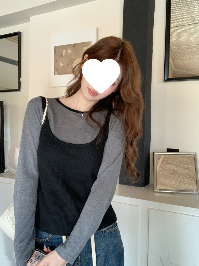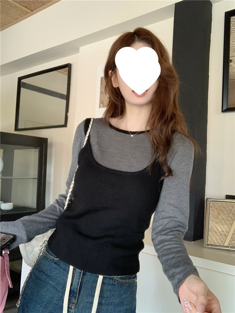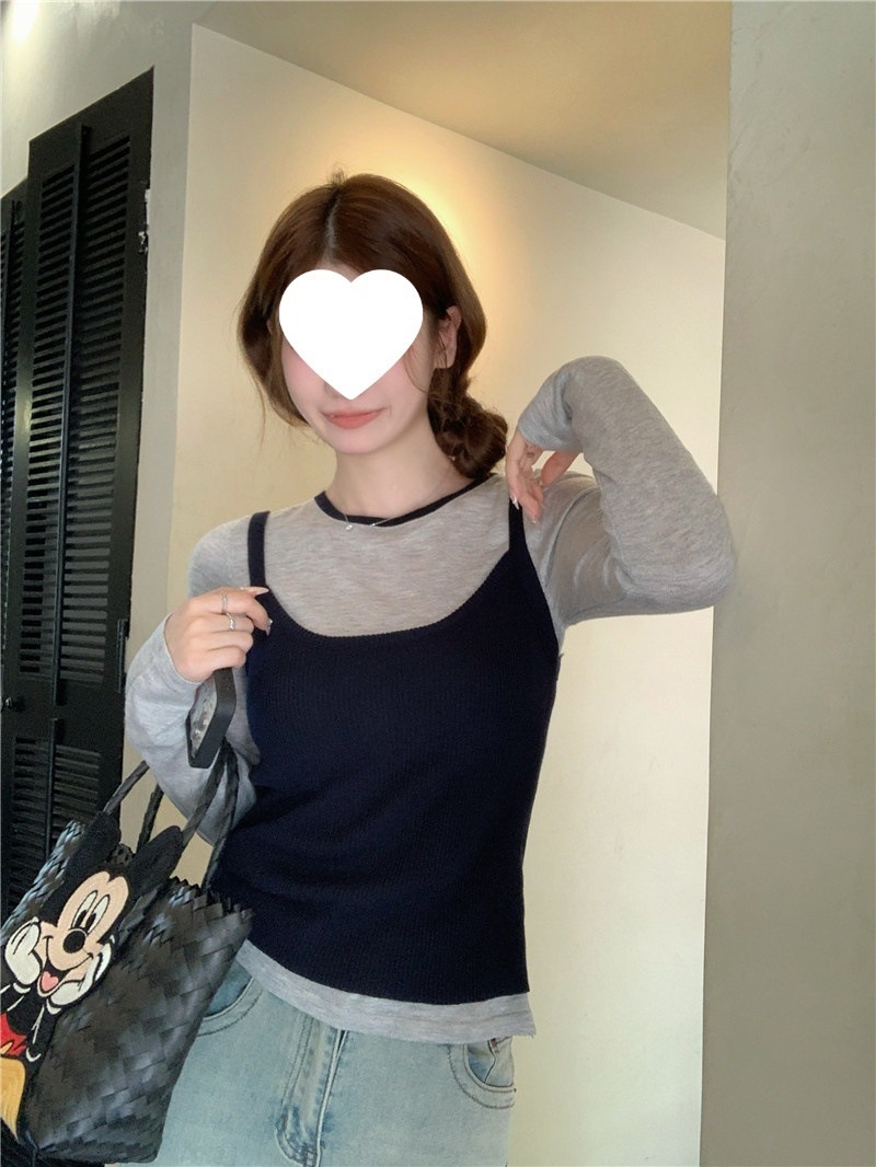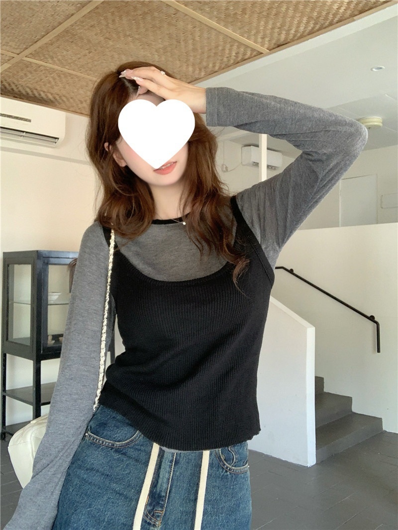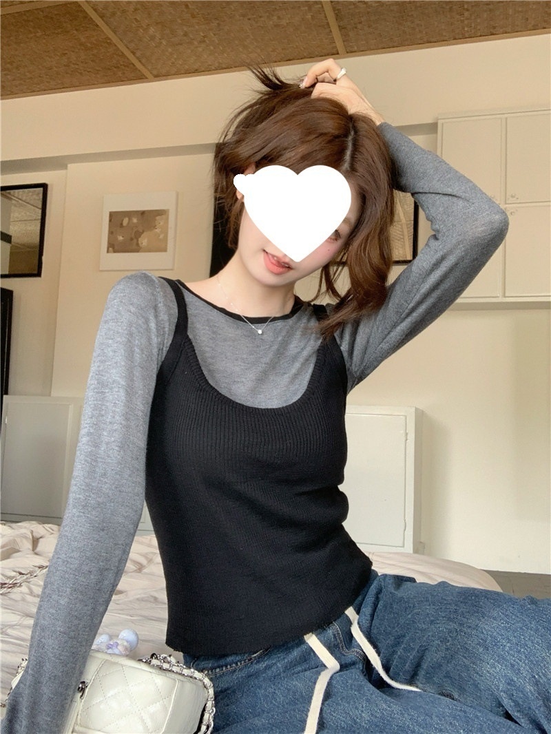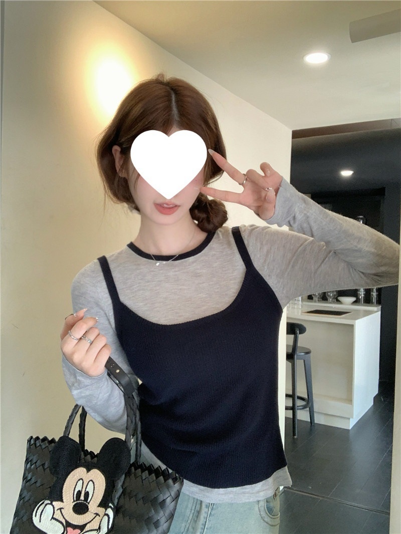 2024夏季新款韩版早秋薄款长袖修身针织撞色圆领打底针织短款上衣