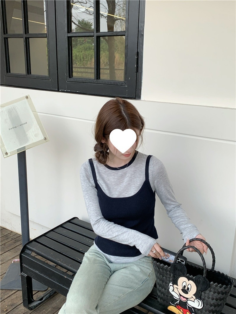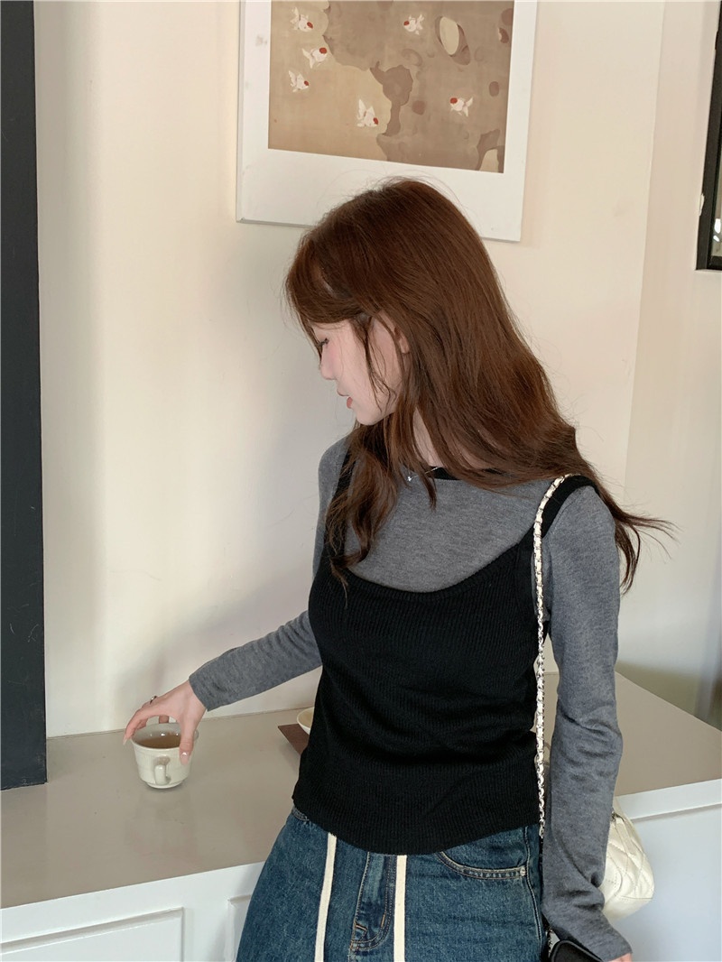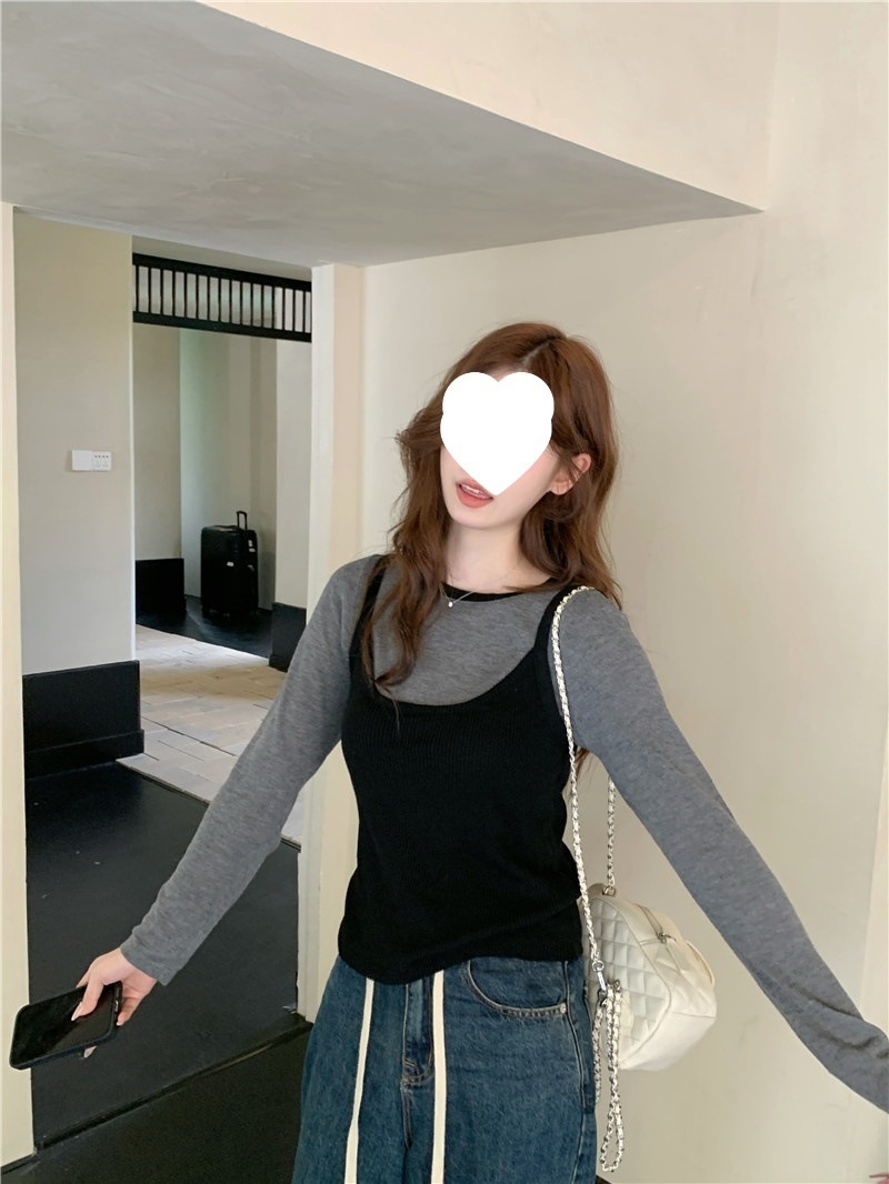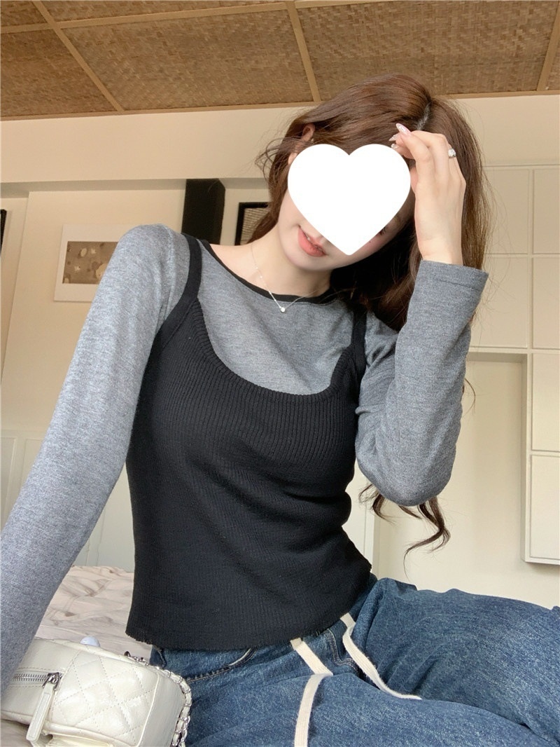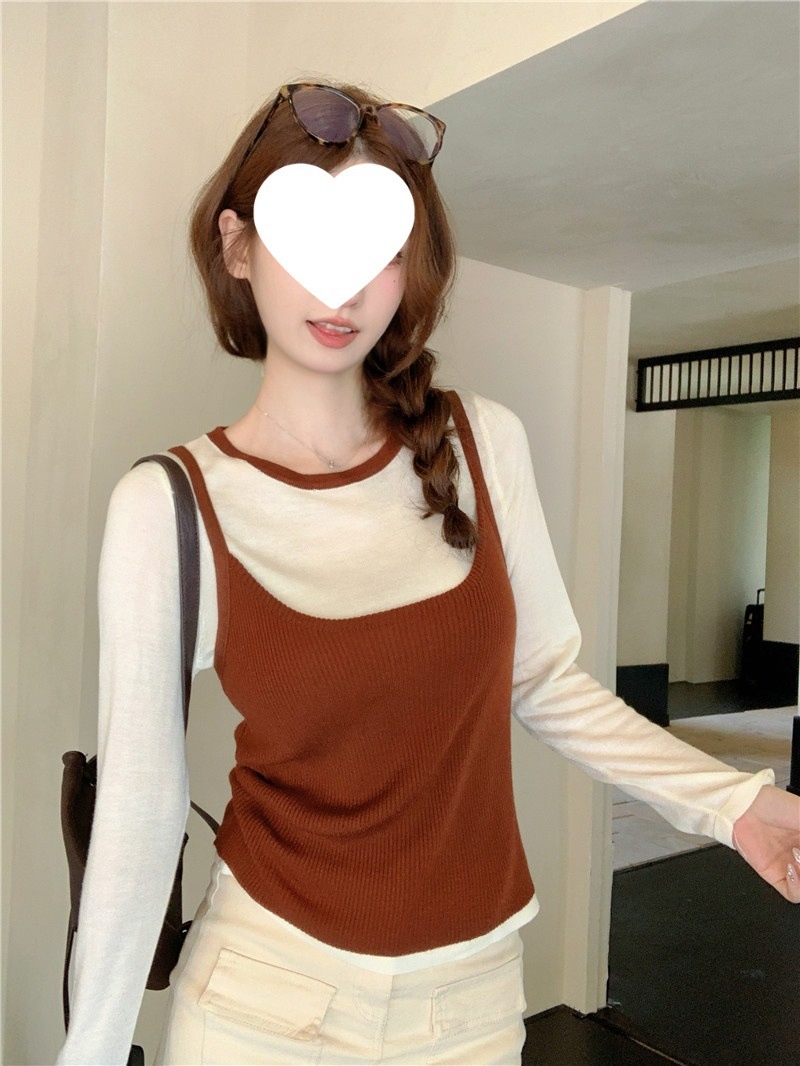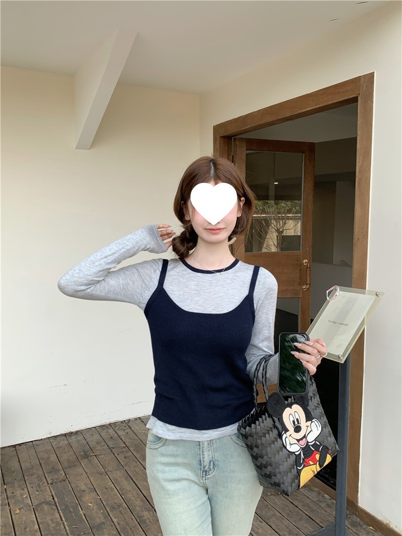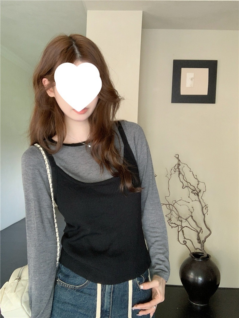 2024夏季新款韩版早秋薄款长袖修身针织撞色圆领打底针织短款上衣