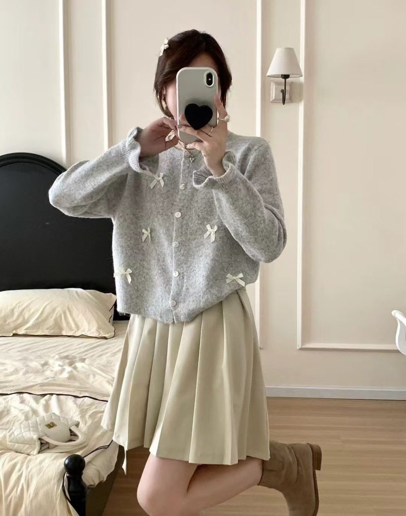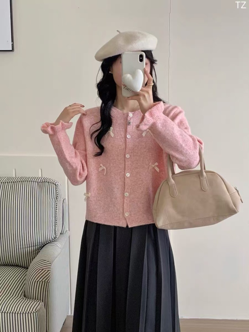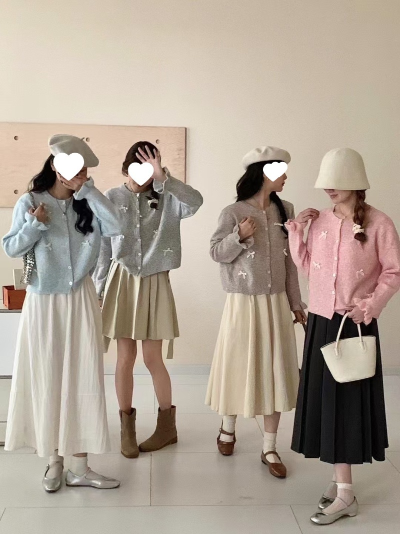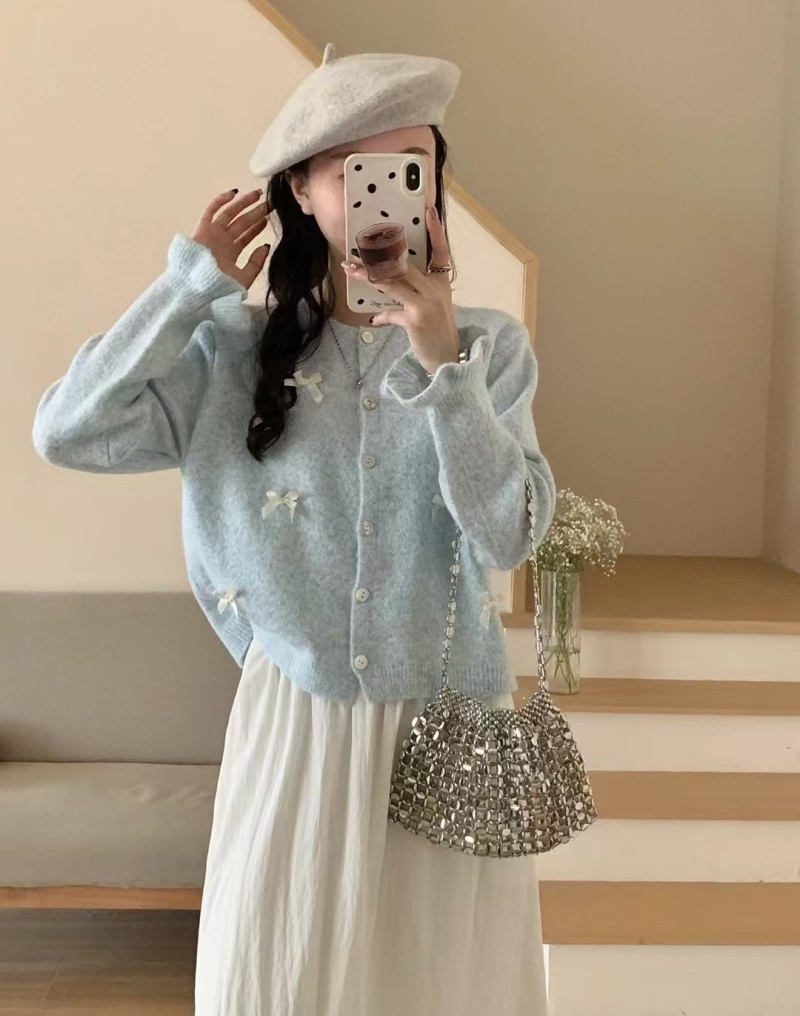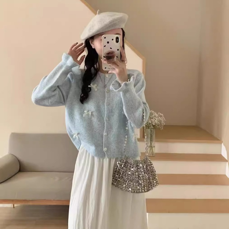韩系小清新蝴蝶结装饰甜美针织衫开衫女减龄学院风百搭毛衣外套潮