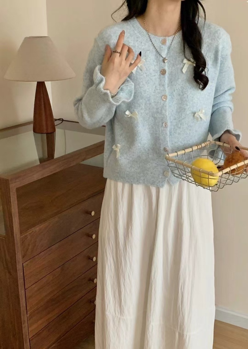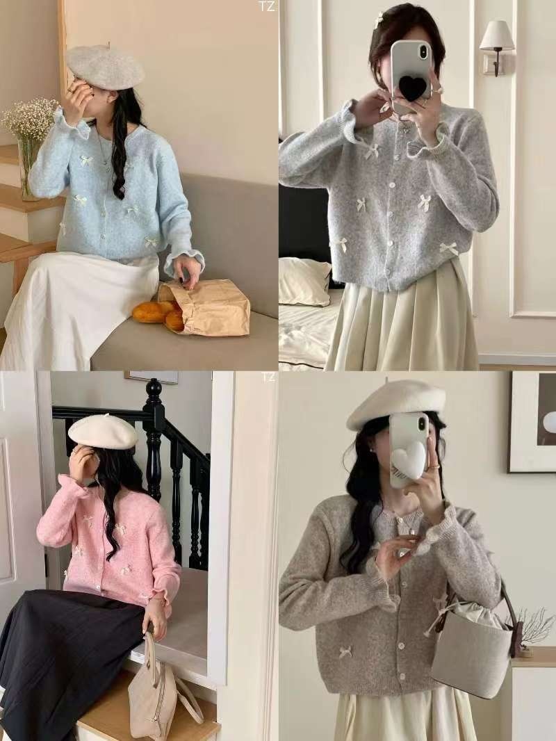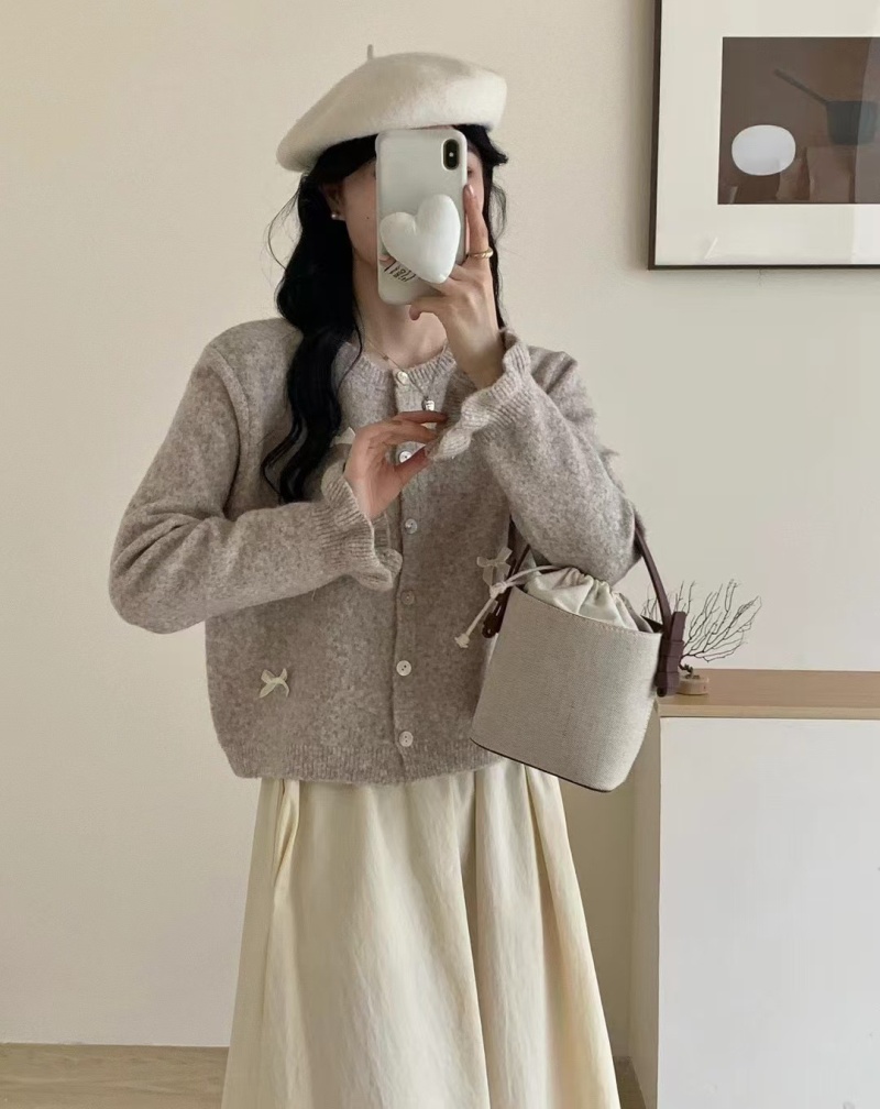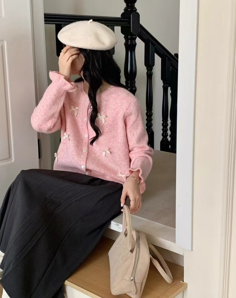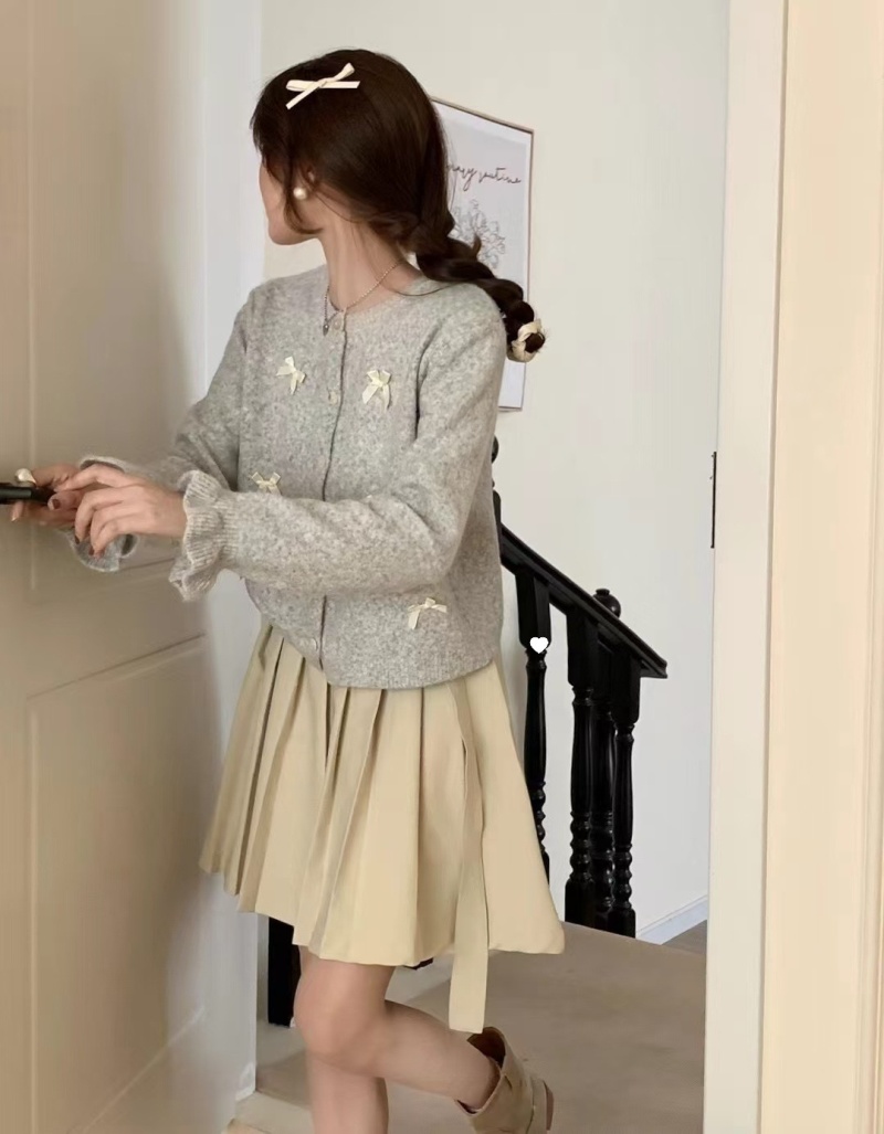 韩系小清新蝴蝶结装饰甜美针织衫开衫女减龄学院风百搭毛衣外套潮